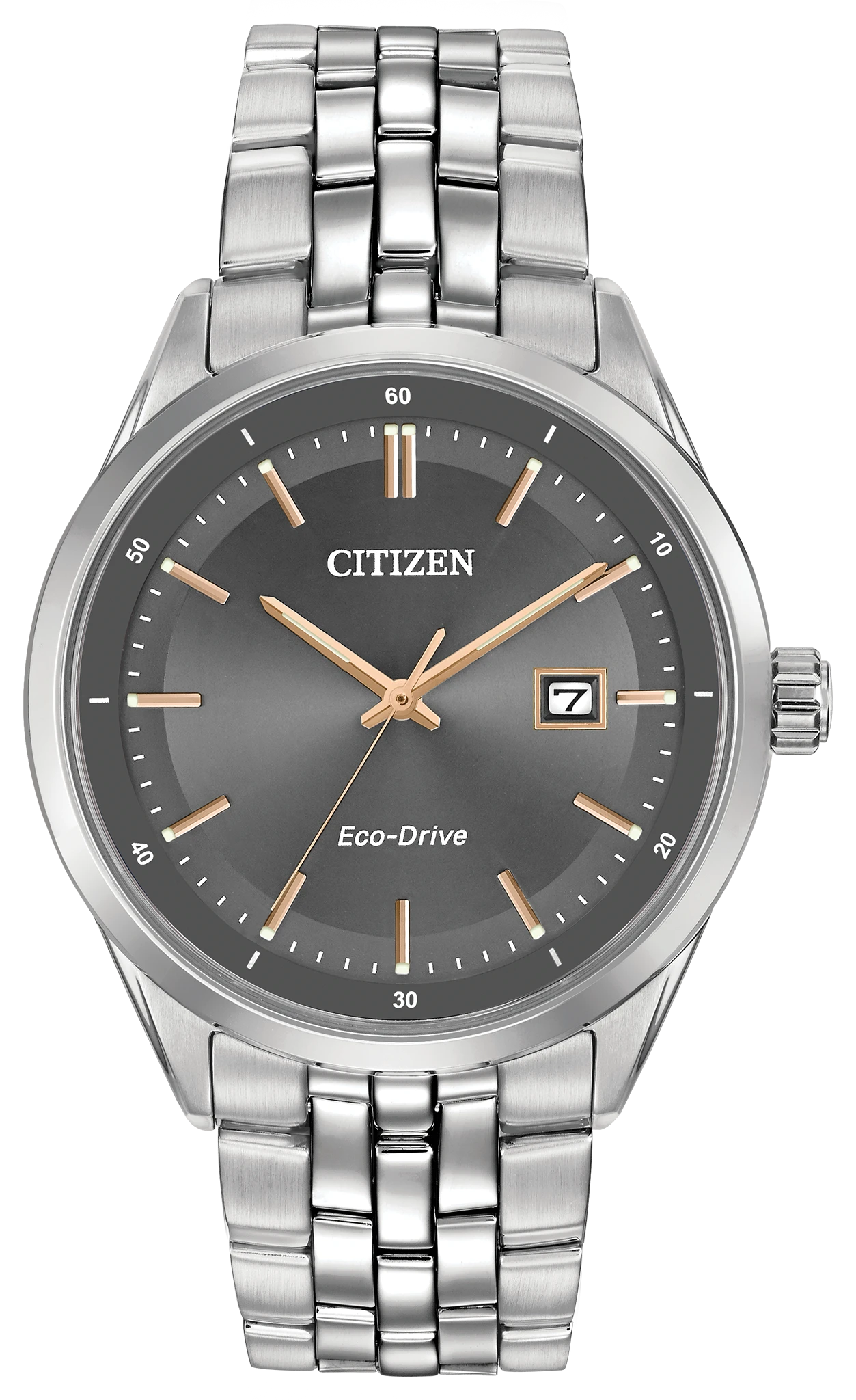 A time-honored watch with clean lines and simple accents, this watch will never… go out of style. Featured here in stainless steel with charcoal grey dial, rose gold-tone accents, sapphire crystal and date. Featuring our Eco-Drive technology – powered by light, any light. Never needs a battery. Caliber number E111.