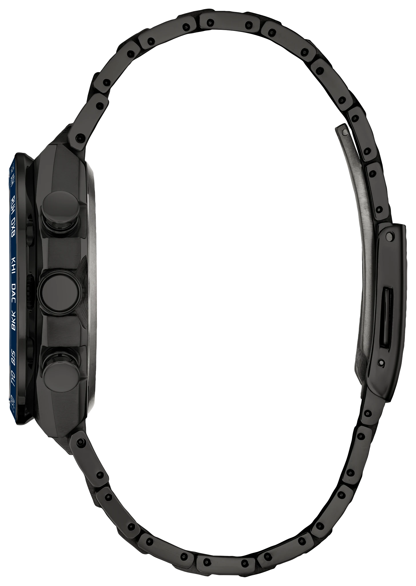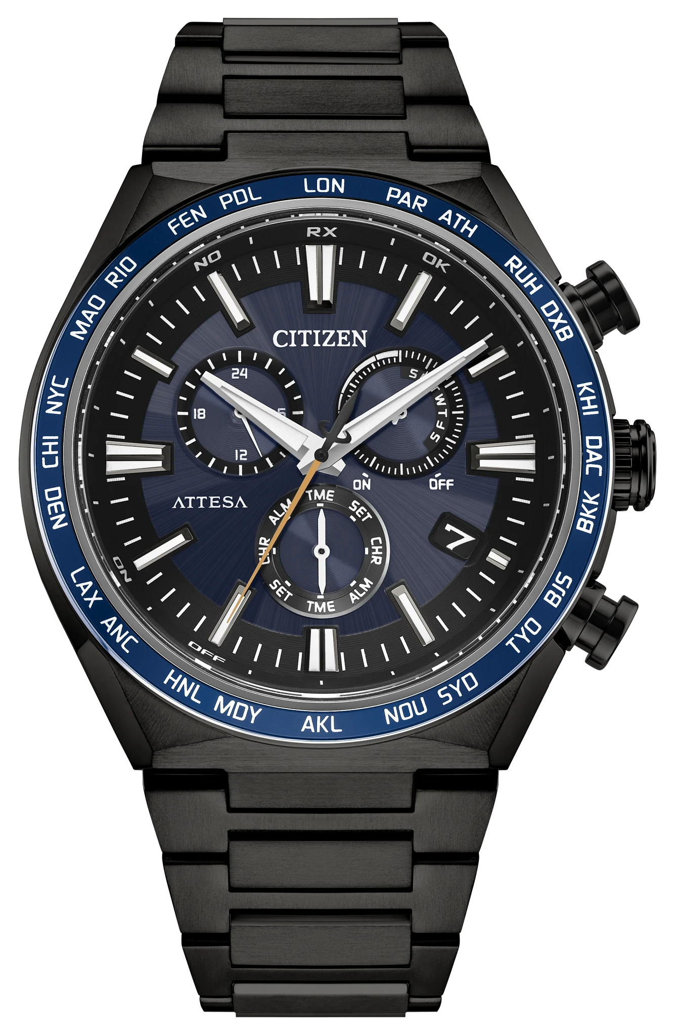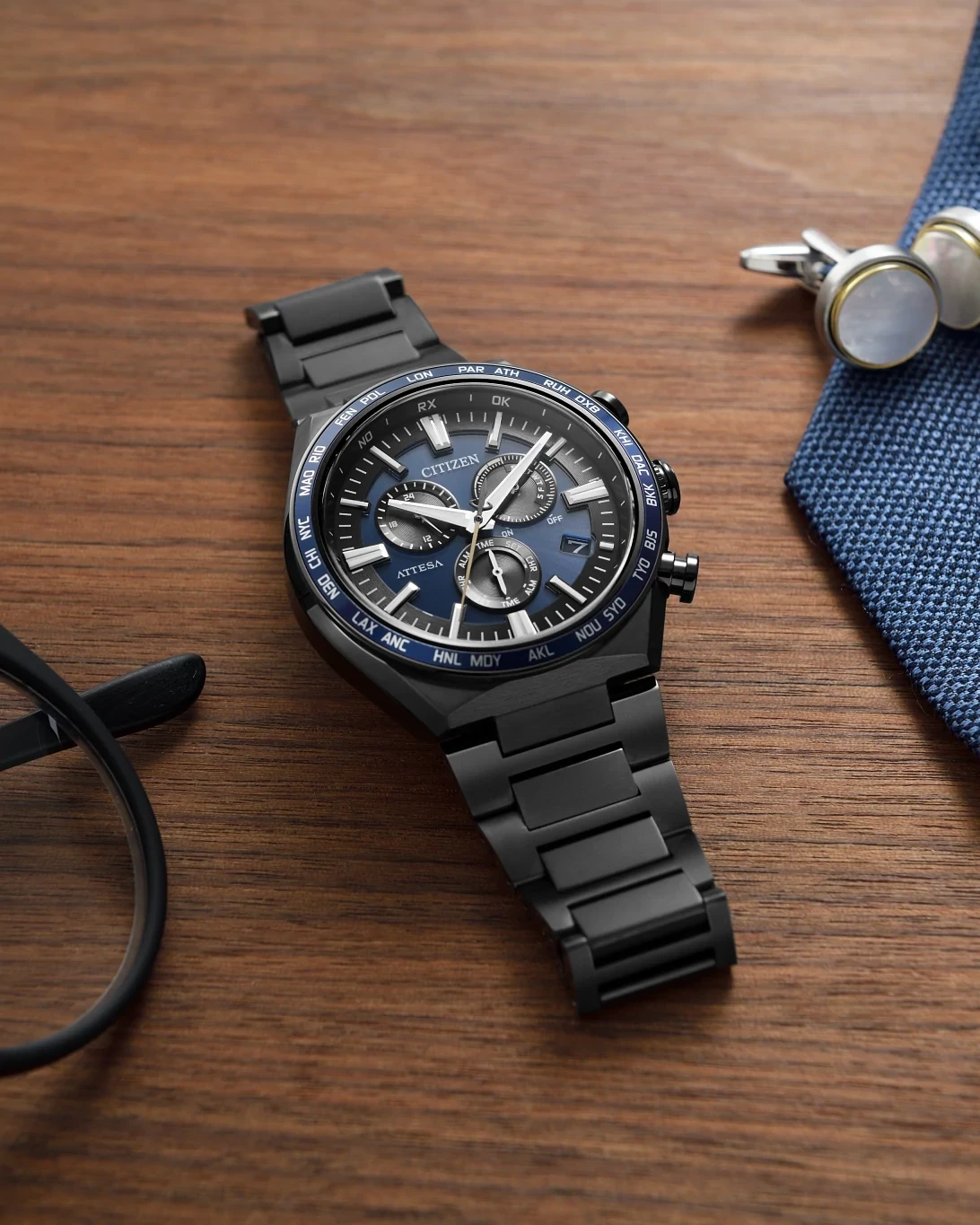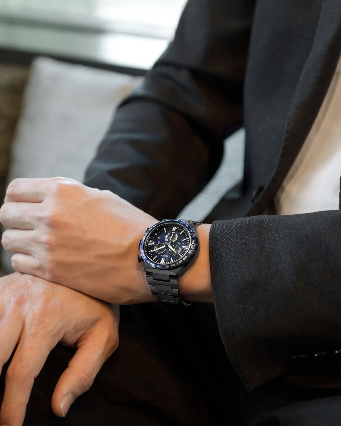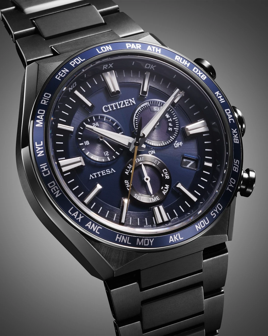 Since its 1987 launch, the Attesa has delivered dependable performance via… expert titanium-processing know-how and innovative chronograph technology, and the latest addition to the collection is no different. A black DLC 42mm Super Titanium™ case and matching bracelet solidifies the lightweight, durable construction of the timepiece, while a blue world timer bezel adds a bold contrast. A matching azure dial and unique sub-dial configuration completes the sleek look, with the aesthetic complemented by flashes of yellow and silver-tone details for a sharp, highly legible style. The chronograph also offers 100 meters of water resistance and a 4 o’clock date window, ensuring this time-tested favorite as the ultimate daily wearing watch with a balance of refined aesthetics and sporty practicality. Other advanced features include a 24-hour display, 60-minute chronograph, direct flight world time (24-hour difference), and a summer time function alarm. Featuring light-powered Eco-Drive Atomic Timekeeping functionality, the timepiece self-adjusts when traveling overseas by receiving local time signals for 24 time zones. Caliber E660.
