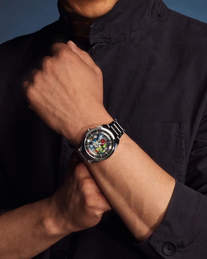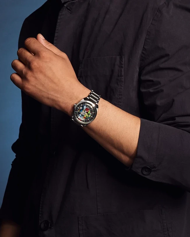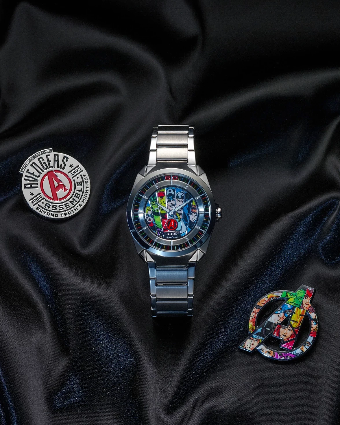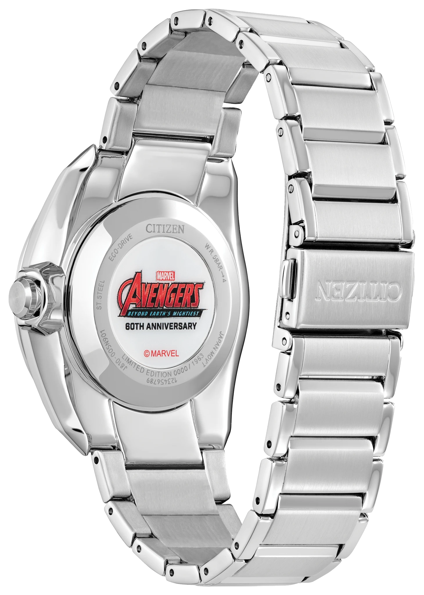 Celebrate sixty astounding years of this unparalleled team with Marvel’s… Avengers: Beyond Earth’s Mightiest watch and pin set from Citizen. Featuring Marvel’s Avengers on the dial, including Captain Marvel, Hulk, Tony Stark, Captain America, Thor, Black Panther, and Black Widow. The timepiece and unique art style highlights the first days of what has become six decades of incredible Super Hero adventures. A silver-tone stainless steel case anchors the design, with its geometric style giving the watch a tough, action-ready edge. Like the commemorative dial, the case back marks the 60th Anniversary, reading “Marvel Avengers: Beyond Earth’s Mightiest.” Sustainably powered by any light with Citizen’s proprietary Eco-Drive technology, this collector’s timepiece comes as part of a limited-edition box set with two celebratory pins. © 2023 MARVEL