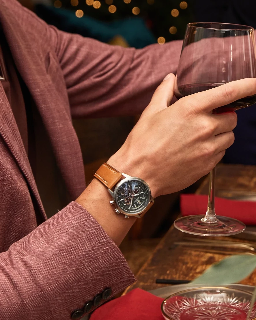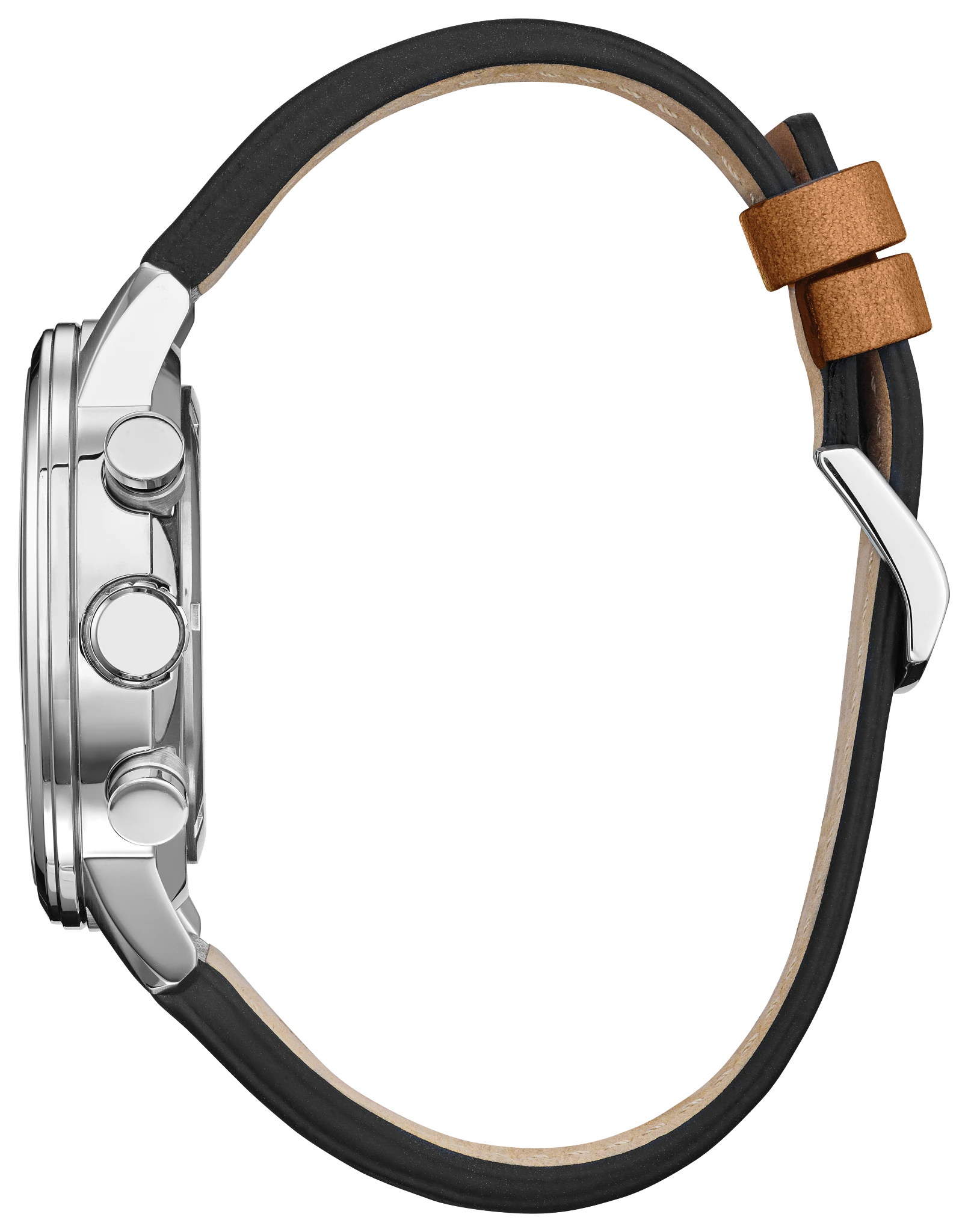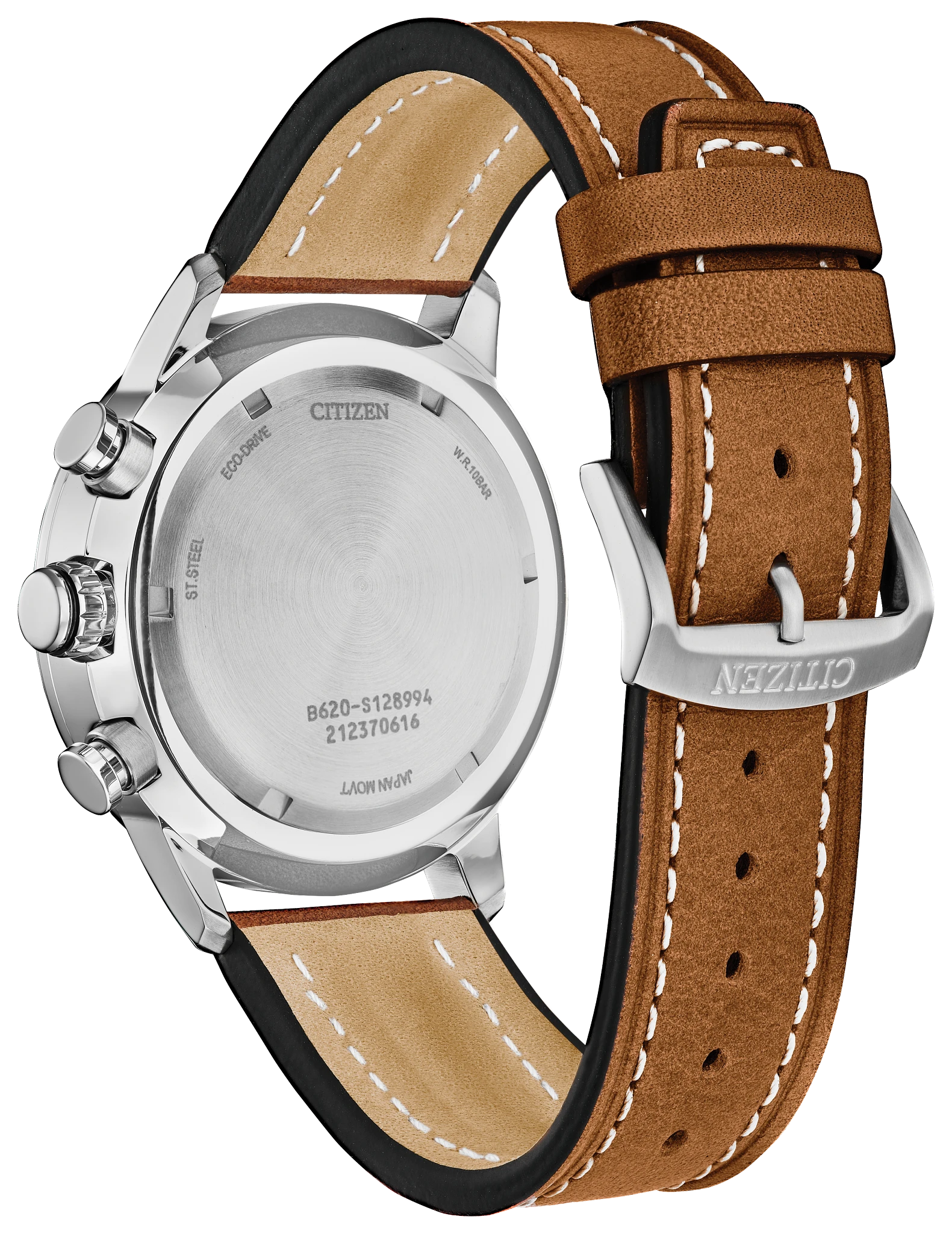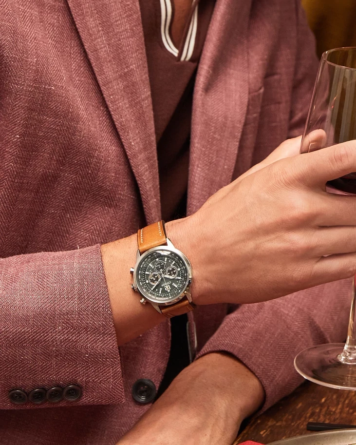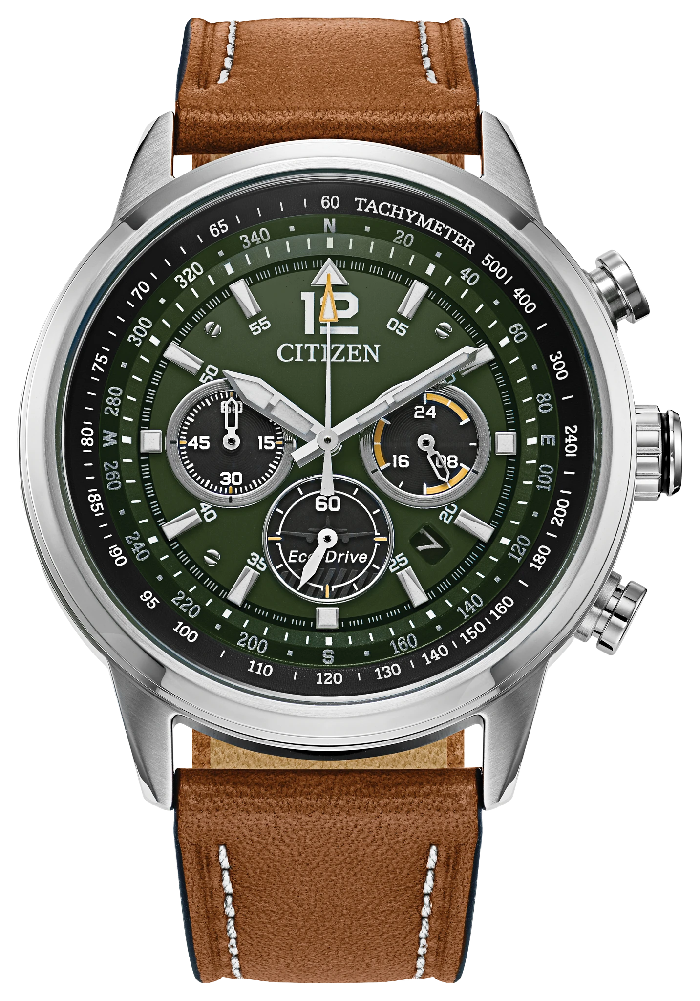 Rekindle the past with the Avion vintage-inspired men’s chronograph watch… by Citizen. Paying homage to the golden age of travel, this timepiece features a green dial with a rich caramel brown leather strap with contrast stitching. This retro-styled men’s watch features a 1/5 second chronograph that measures up to 60 minutes, 12/24 hour time and date. Sporting a silver-tone stainless steel case, the water-resistant Avion also features Citizen’s sustainable Eco-Drive technology, powering the watch by light. For those with eclectic taste, the Avion delivers every time.