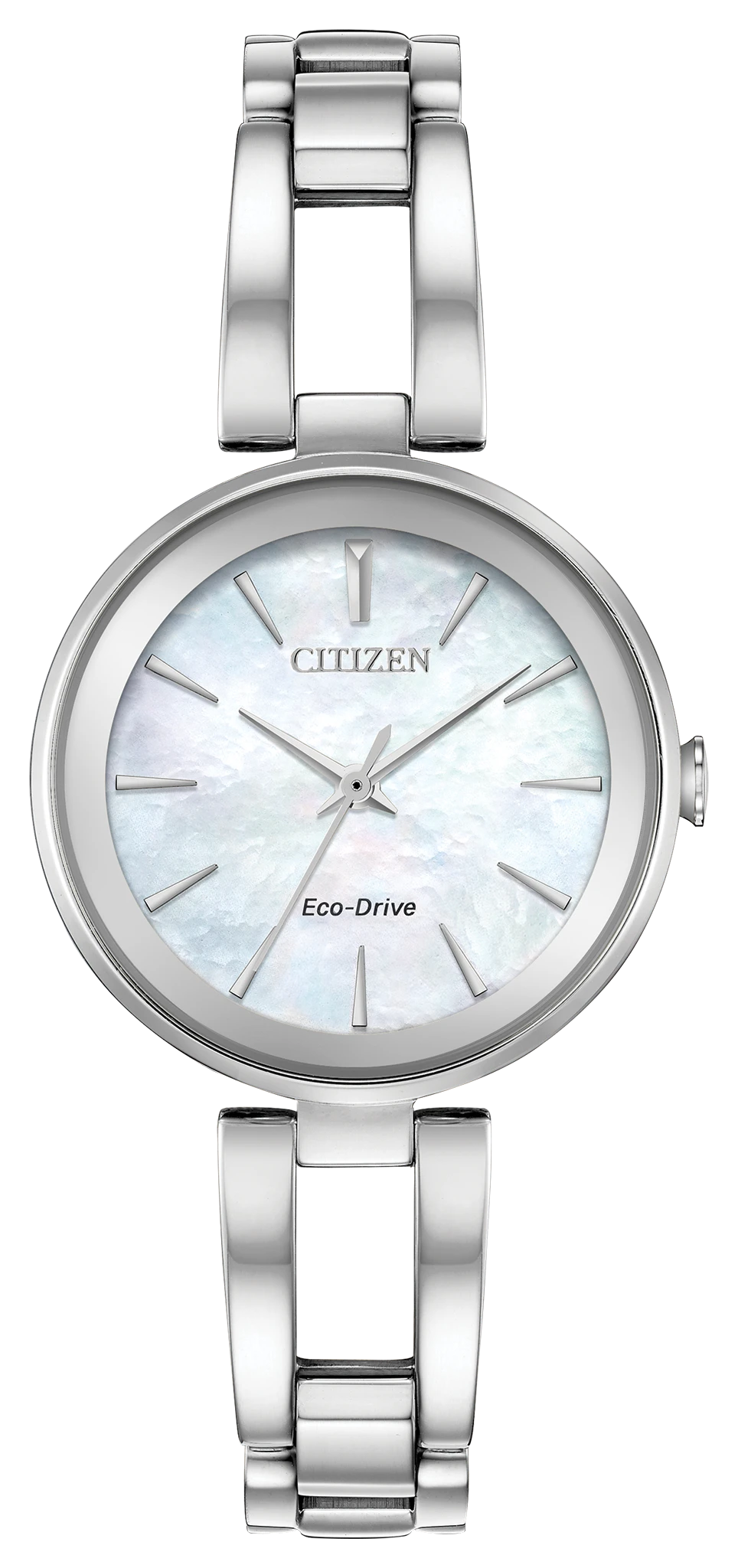 Axiom’s refined yet sleek design offers a day-to-night fashion option… with edge-to-edge glass design for the modern trendsetter. This timepiece, with Eco-Drive technology, features ladies’ stainless steel case and bracelet with white Mother-of-Pearl dial. Featuring our Eco-Drive technology ? powered by light, any light. Never needs a battery. Caliber number E031.