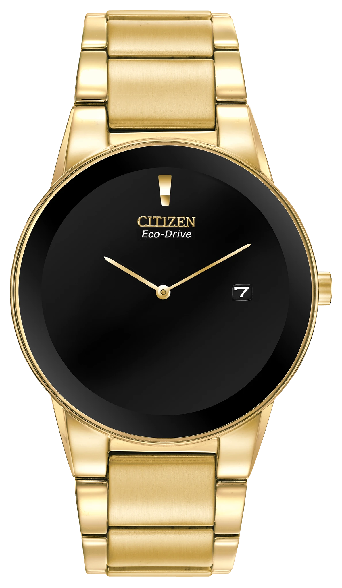 Axiom’s refined yet sleek design offers a day-to-night fashion options for the… avid trendsetter. Available in men’s and ladies’, featuring a gold-tone stainless steel case and bracelet with a black dial and the intriguing feature of edge-to-edge glass and date. Featuring our Eco-Drive technology – powered by light, any light. Never needs a battery. Caliber number J165.