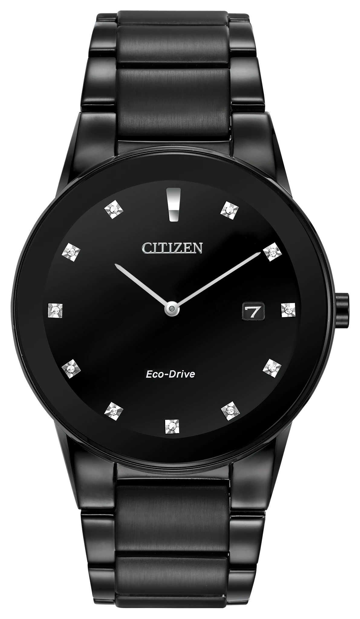 Axiom’s refined yet sleek design offers a day-to-night fashion option for the… avid trendsetter. This timepiece, black ion plated stainless steel case and bracelet with black dial, features the intriguing detail of edge-to-edge glass, an 11 diamond dial and date. Featuring our Eco-Drive technology – powered by light, any light. Never needs a battery. Caliber number J165.