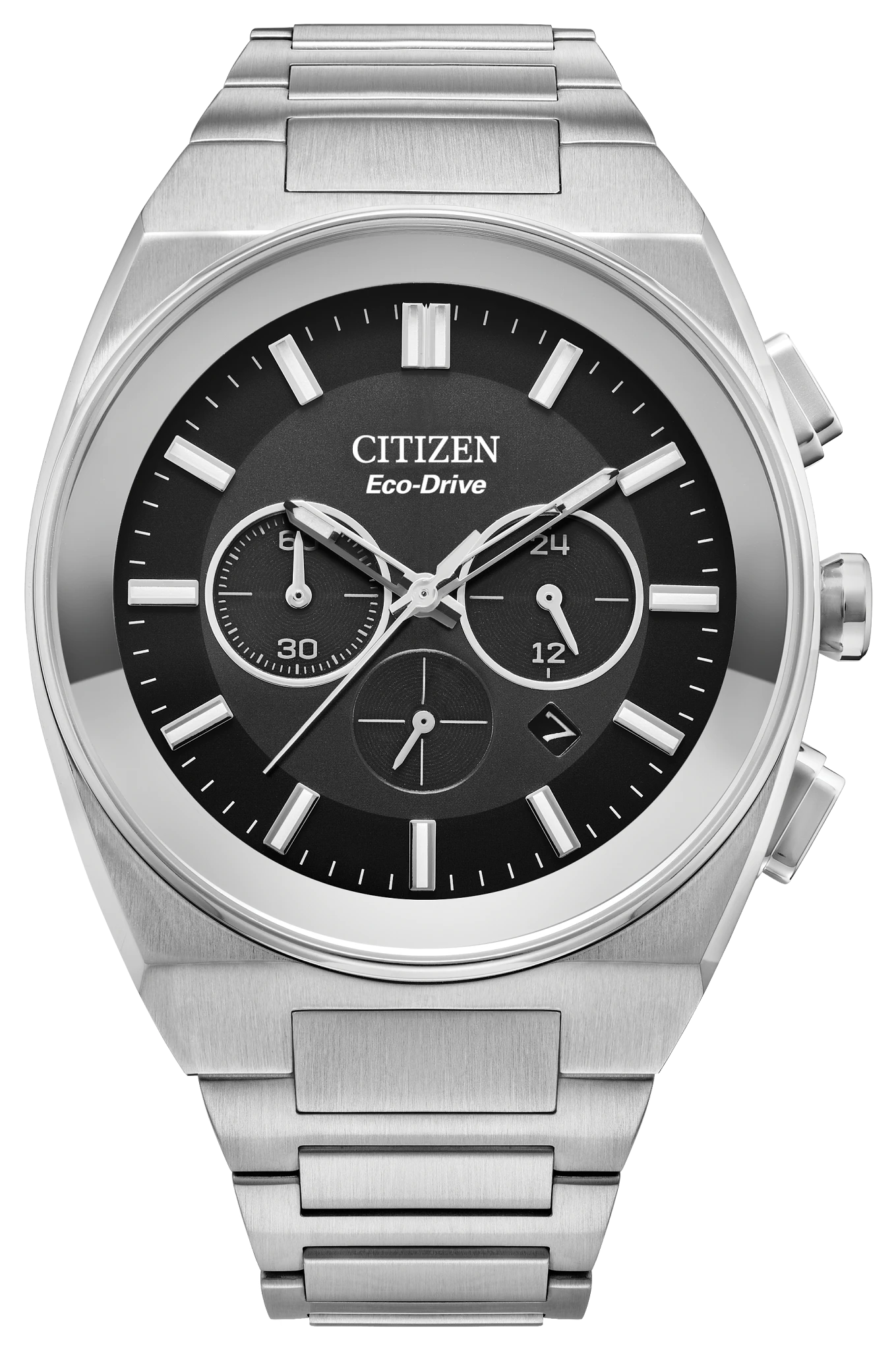 The Citizen Axiom SC features a sophisticated blend of sports watch aesthetics… with refined styling for the ultimate workday to weekend watch to wear.The timepiece features a silver-tone stainless steel case with an integrated stainless steel bracelet, epitomizing the contemporary sports watch design. The black dial has a streamlined look with two sub-dials at 3 and 9 o’clock, outlined with silver-tone details to match the silver-tone indices and hands. Capabilities of the watch include a 1/5 second chronograph that measures up to 60 minutes, 12- and 24-hour time indication, and a date indicator. Powered by Citizen’s proprietary Eco-Drive technology to provide light-powered vitality continuously and sustainably without ever needing a battery. Caliber B620.