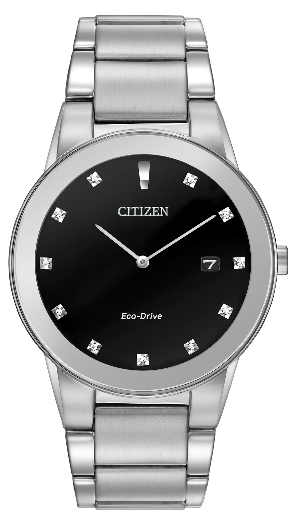 Axiom’s refined yet sleek design offers a day-to-night fashion option for the… avid trendsetter. This timepiece, with stainless steel case and bracelet and black dial, features the intriguing detail of edge-to-edge glass, an 11 diamond dial and date. Featuring our Eco-Drive technology – powered by light, any light. Never needs a battery. Caliber number J165.