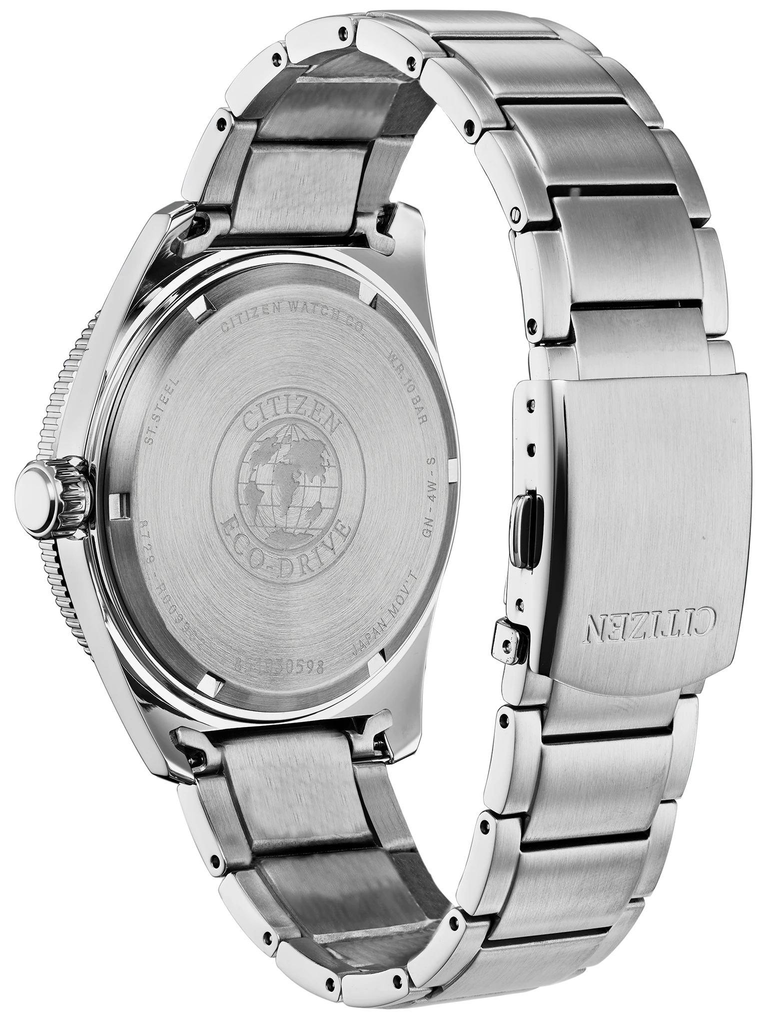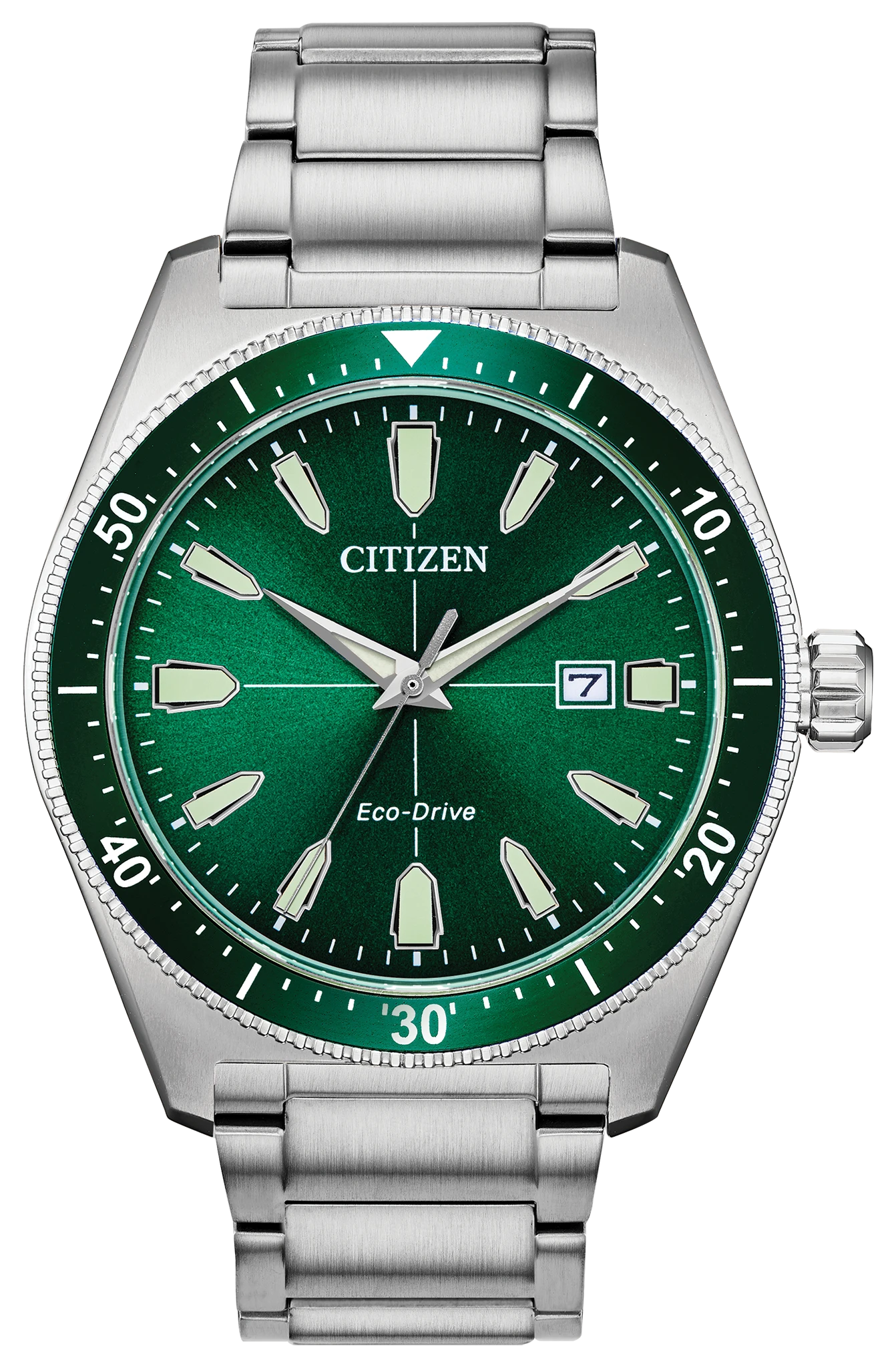 Nothing says classic better than a vintage throwback, and the redesigned… Citizen Vintage Brycen Sport timepiece is just that, with distinguished features sure to stand out on your wrist. This stylish watch in a stainless steel case with pine green dial and bezel, stainless steel bracelet and date. Featuring our Eco-Drive technology – powered by light, any light. Never needs a battery. Caliber number J810.