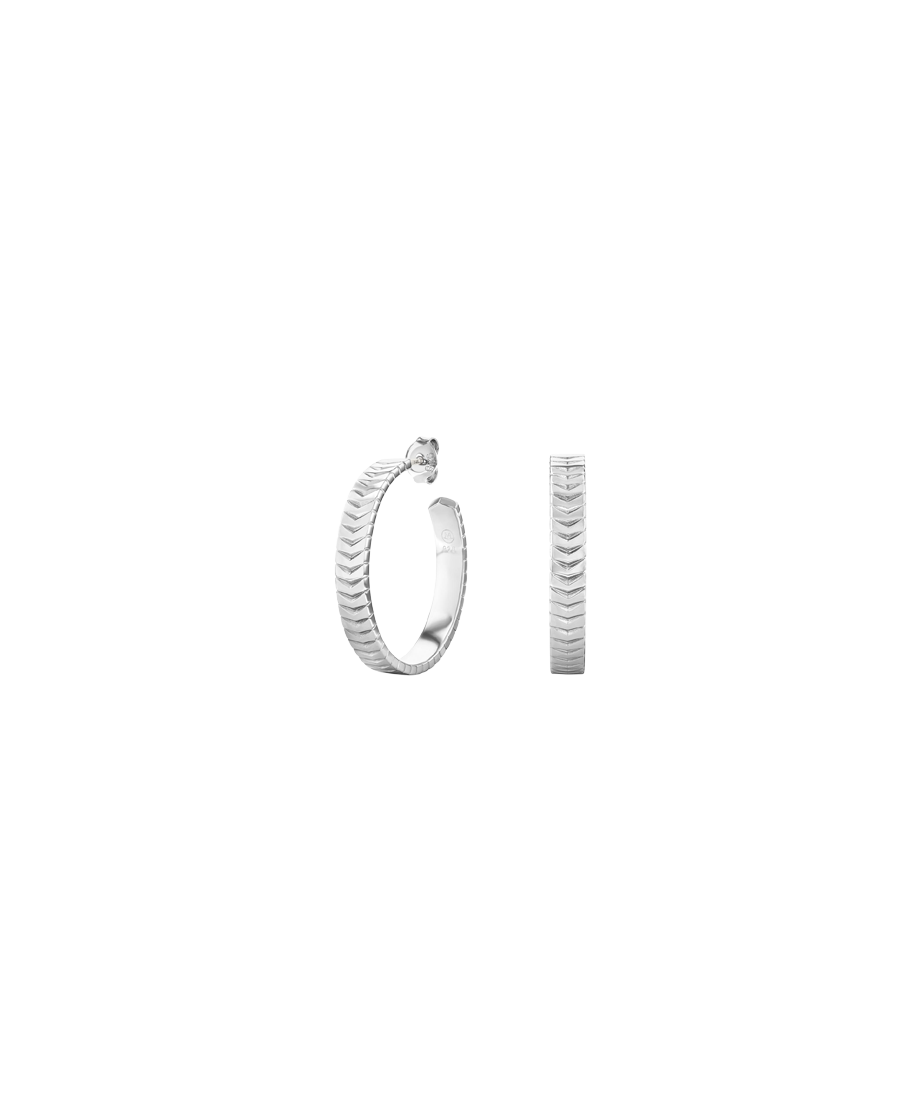 A modern, geometric chevron pattern elevates these iconic hoop earrings. Crafted from sterling silver with a post back and 28mm diameter.