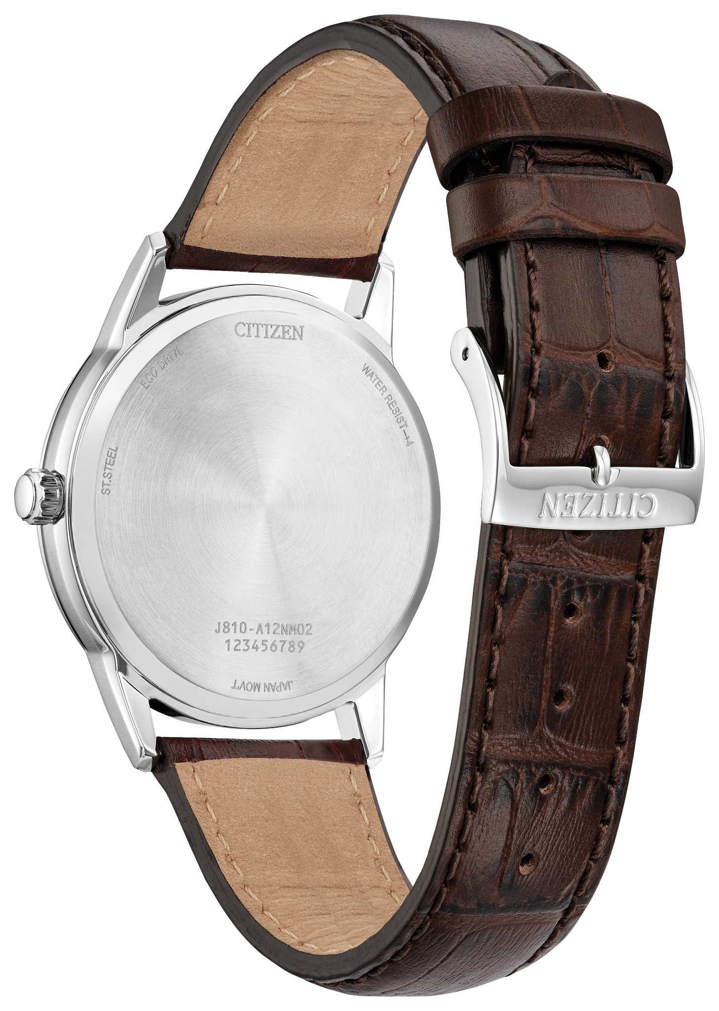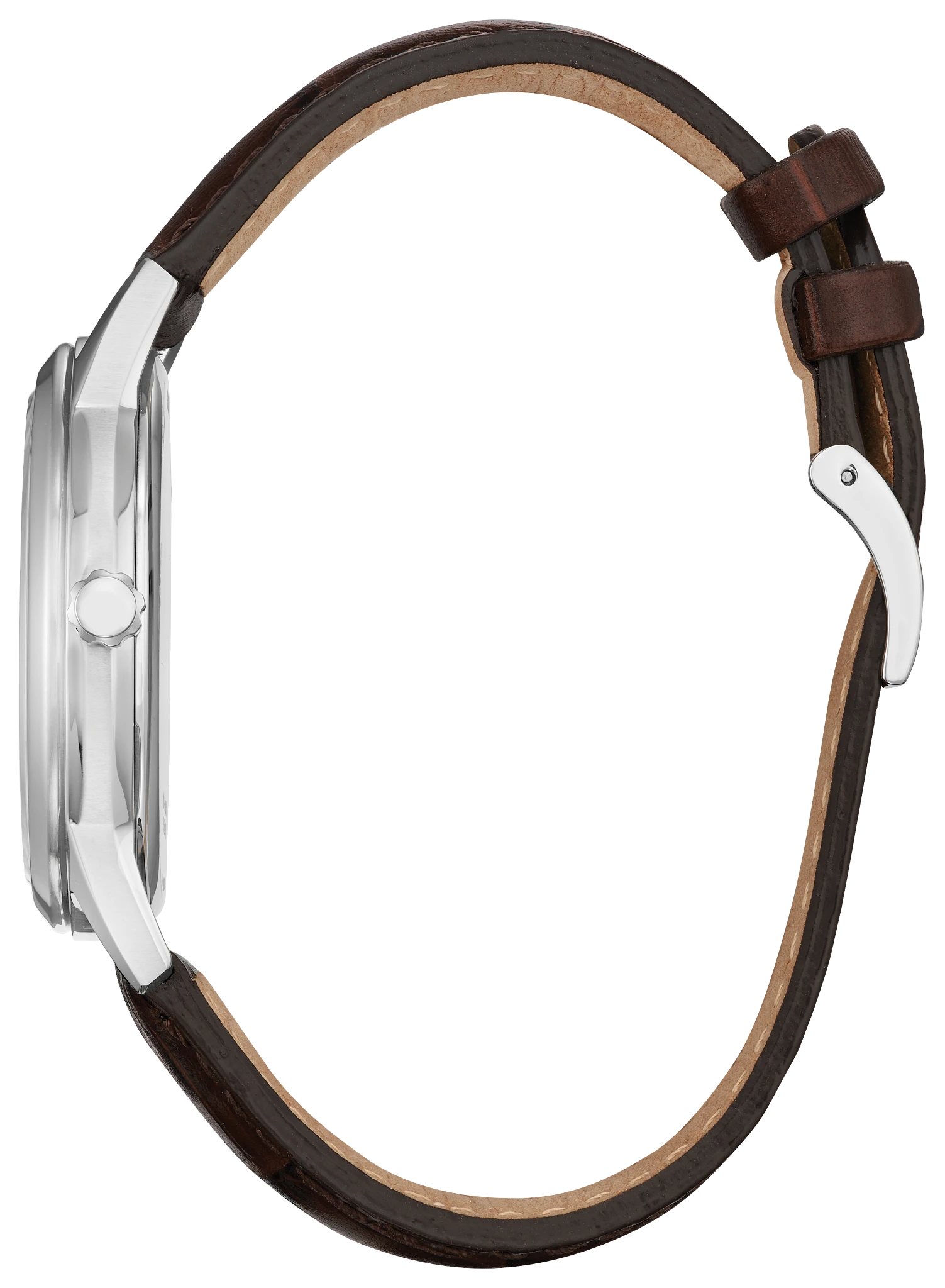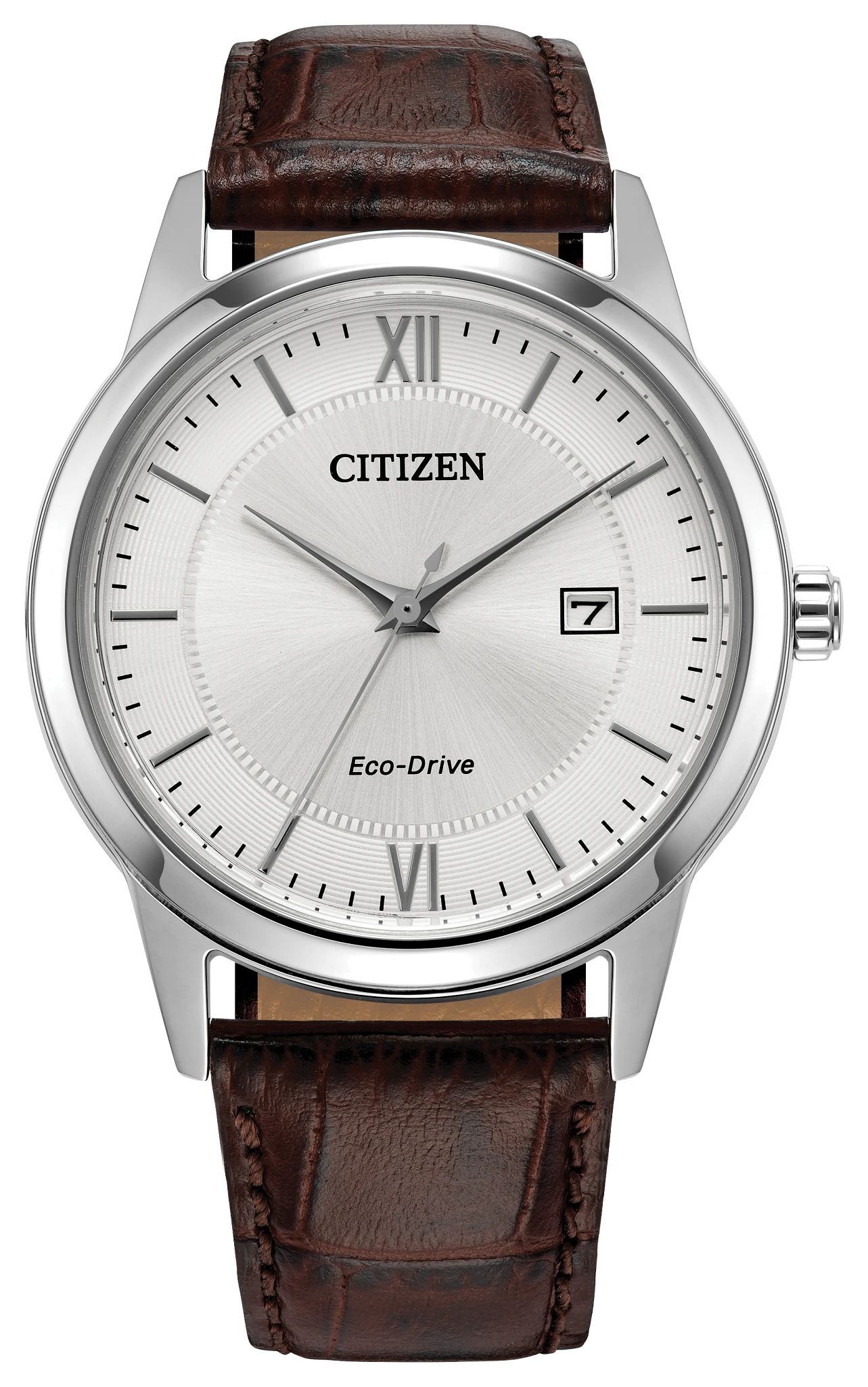 Classic lines and a simple silhouette define the newest addition to the… Classic collection. This vintage-inspired timepiece features a silver-tone stainless steel case, a silver-tone 3-hand dial with a date function, and aa brown leather strap with buckle closure. Sustainably powered by any light with Eco-Drive technology and never needs a battery.