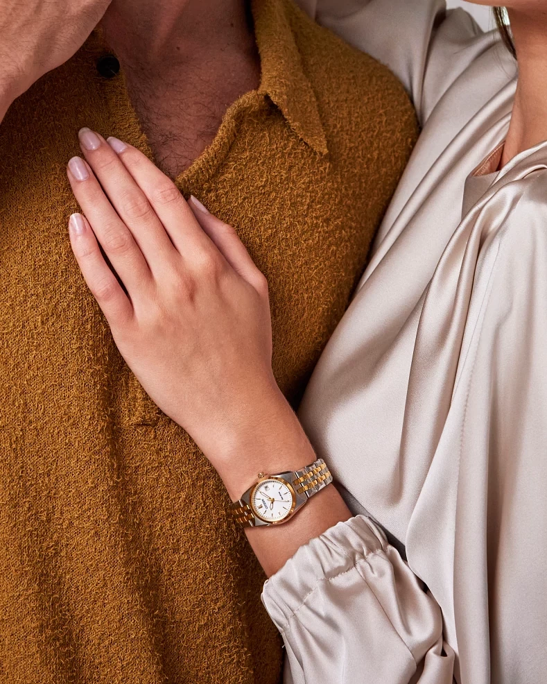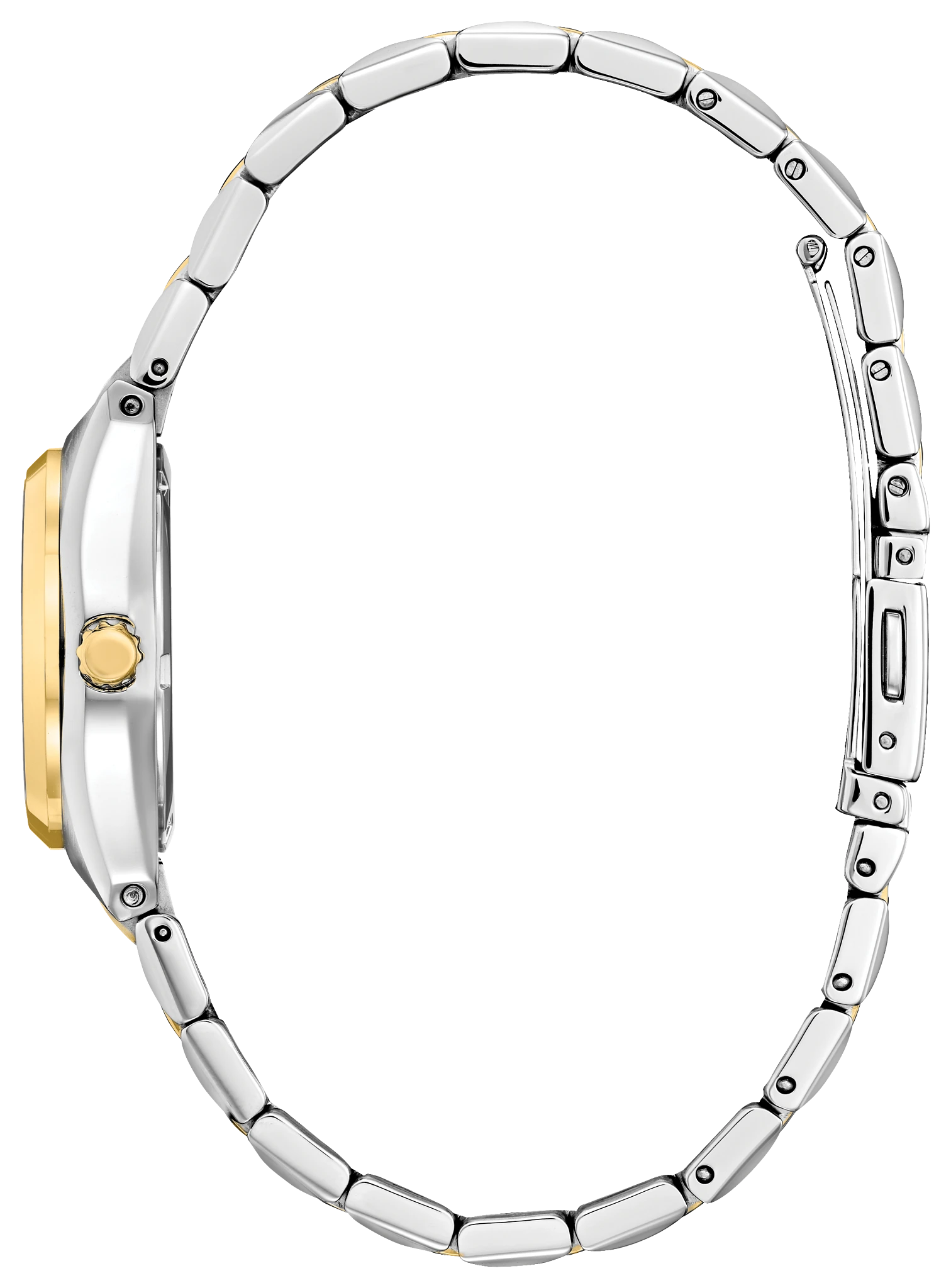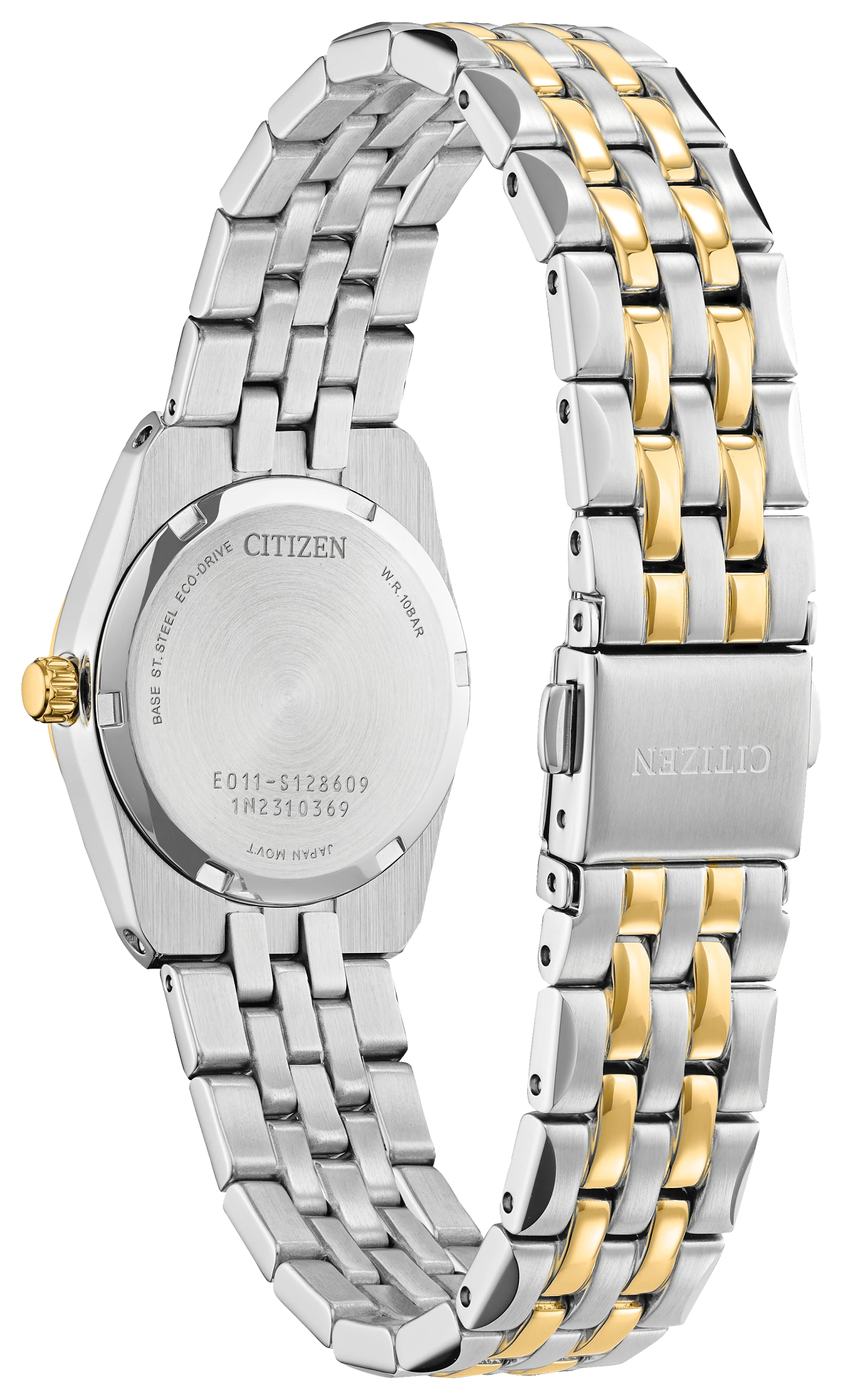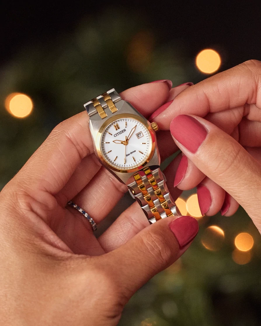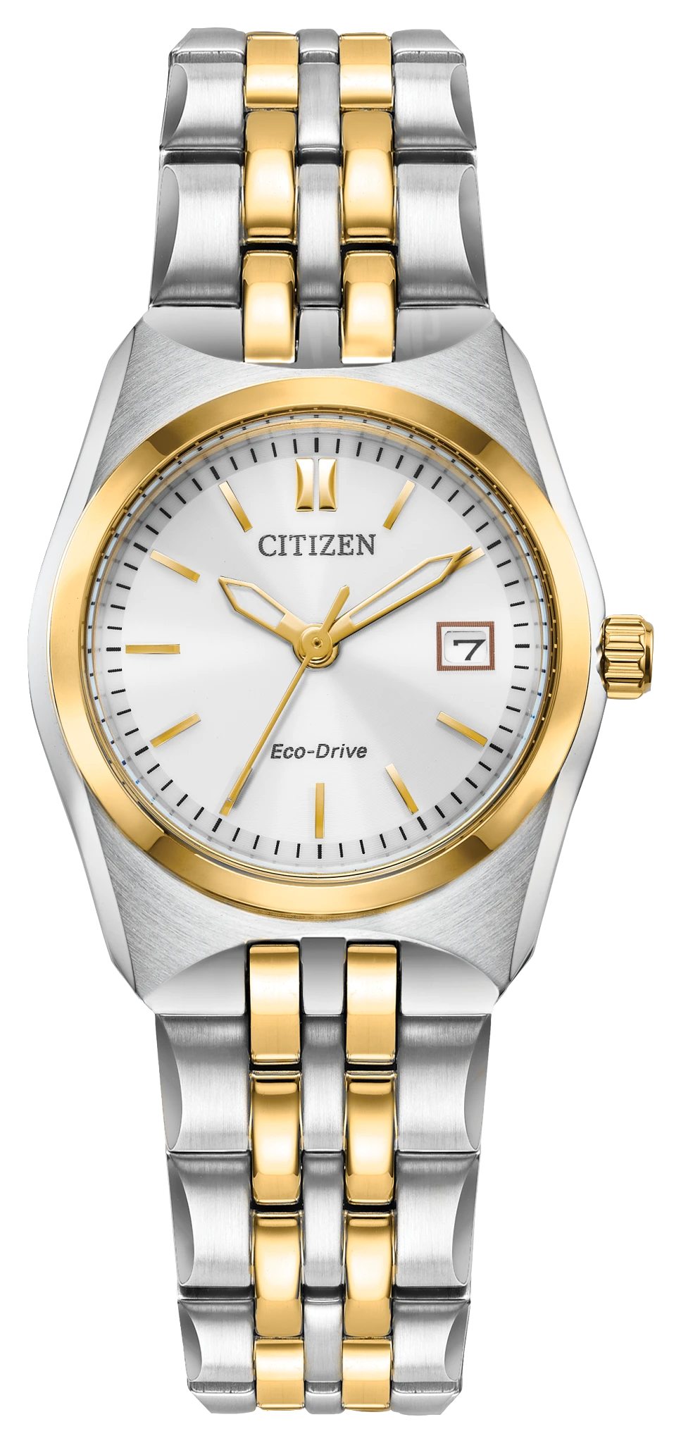 A classic timepiece is always in style in the Corso women?s watch from… Citizen. Featuring a two-tone gold and silver-tone stainless steel bracelet and case with a 3-hand white dial and date indicator, luminous hands and gold-tone markers. This elegant timepiece also features a fold-over clasp closure with hidden push buttons and is water resistant to 100 meters. If you?re looking for a dress watch to add effortless style to your wardrobe, the Corso is the perfect choice. It also uses Citizen?s proprietary Eco-Drive technology, so it is sustainably powered by any light and will never need a battery. Caliber number E011.