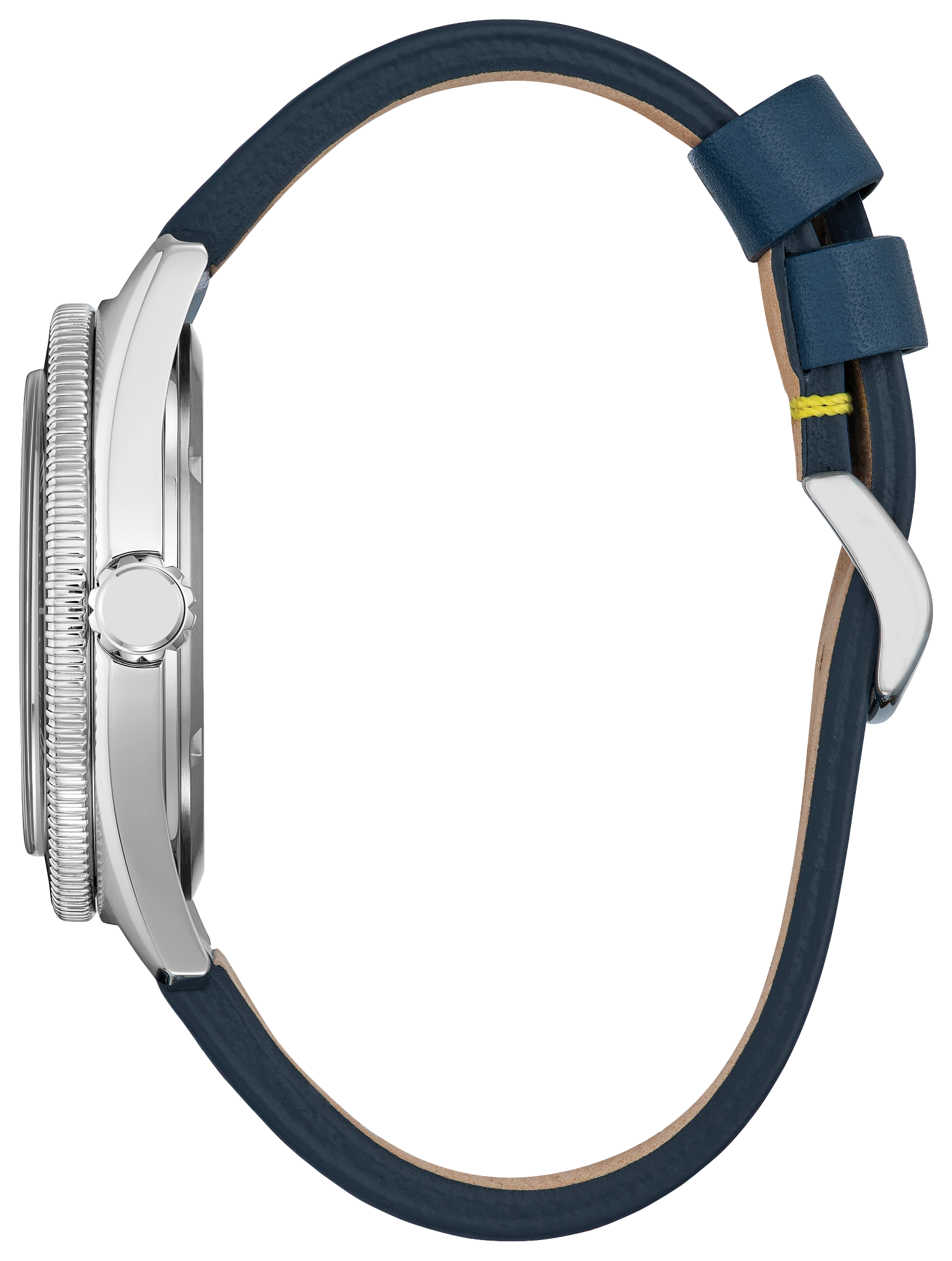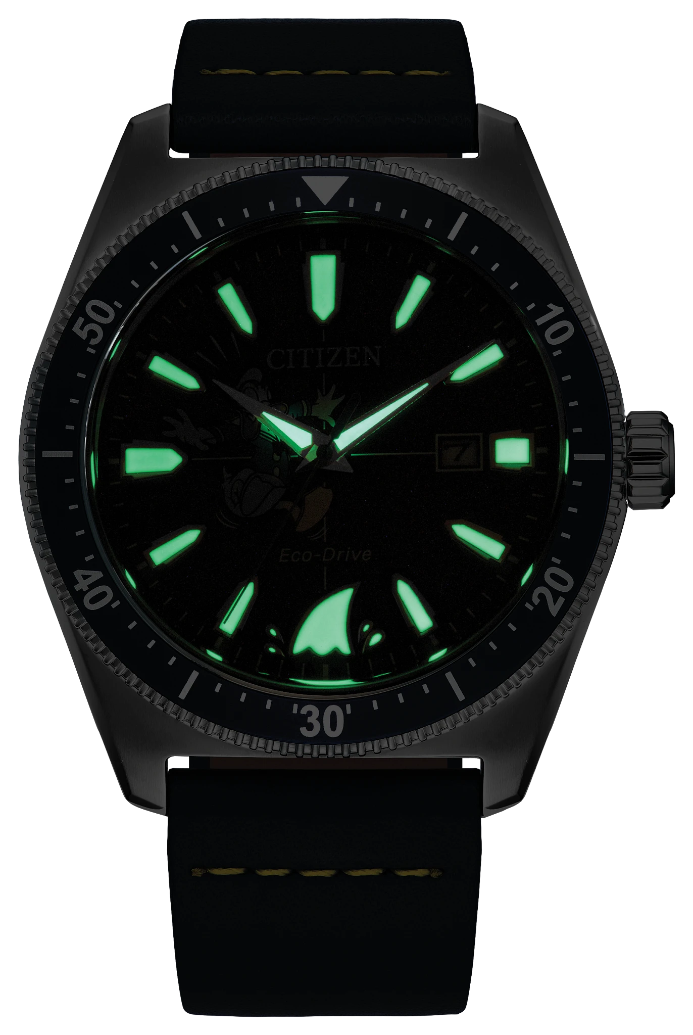 The 1930s brought along one of Mickey Mouse’s beloved sidekicks, Donald Duck…. A mischievous and temperamental counterpart that always found himself in a predicament, as captured on the dial of this watch. Donald scurries above as a shark swims swiftly beneath him at the 6 o’clock. This standout style boasts a tone-on-tone navy blue dial with a navy-blue leather strap and contrast yellow stitching on a silver-tone stainless steel case. Don’t be alarmed but the shark, and indices, glow brightly in the dark. Water resistant to 100 meters and powered by Eco-Drive technology that never needs a battery.