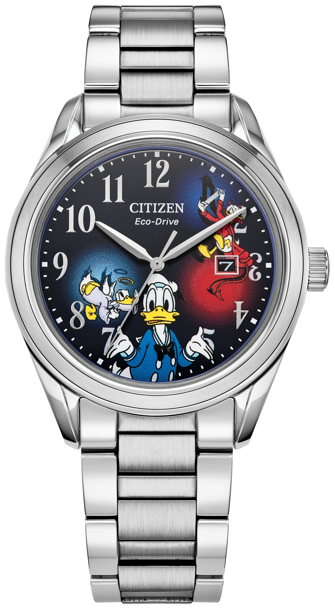 June 9, 1934: Disney Donald Duck makes his first appearance in the animated… film, ?Wise Little Hen,? and a star is born. To celebrate the 90th anniversary of the feisty, beloved character, Disney | Citizen have introduced a Limited Edition boxed set with only 1,934 units available. The blue dial depicts one of Disney Mickey Mouse?s best friends in his classic dilemma: listening to his angel?s counsel to do the right thing or succumbing to the temptation to make mischief. Witty dial artwork by Disney artist Jeff Shelly shows the devilish side of Donald Duck wreaking havoc on the silver-tone numerals. This unisex style includes a stainless steel 40.2mm case and bracelet and a case back engraved with the character?s likeness, ?Feisty and Fabulous,? and the limited edition number, plus custom packaging and a collectible pin, perfect for gifting. And with Citizen?s Eco-Drive technology, the watch is sustainably powered by any light and never needs a battery. ?Disney
