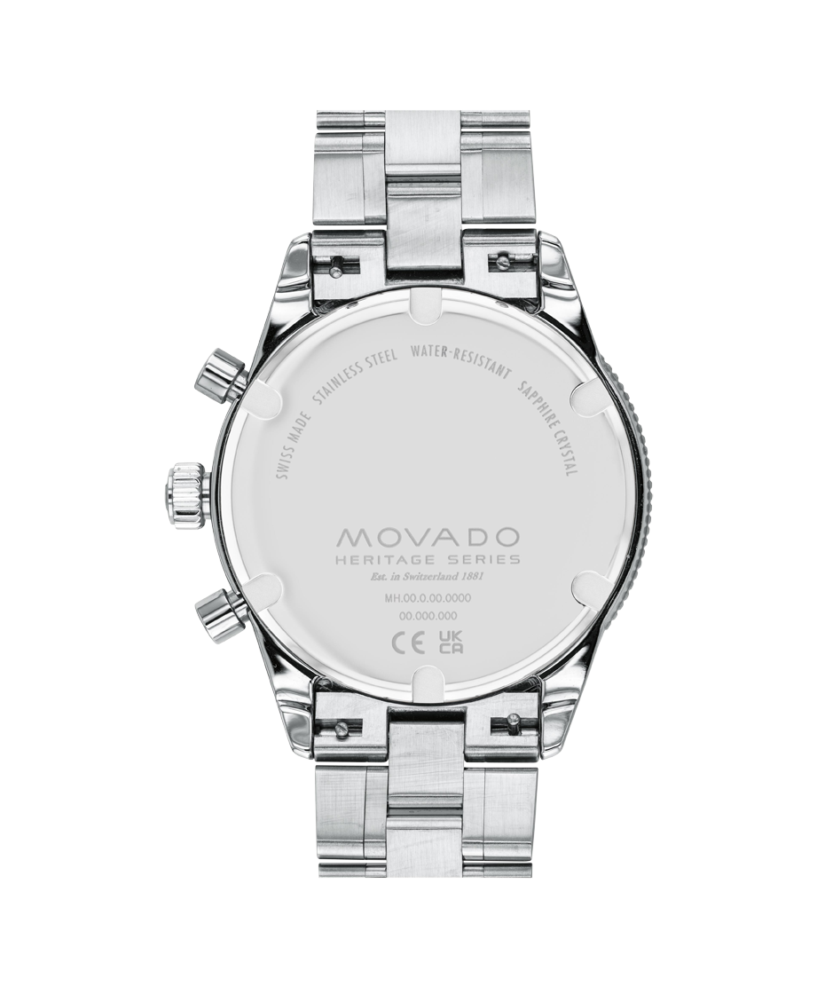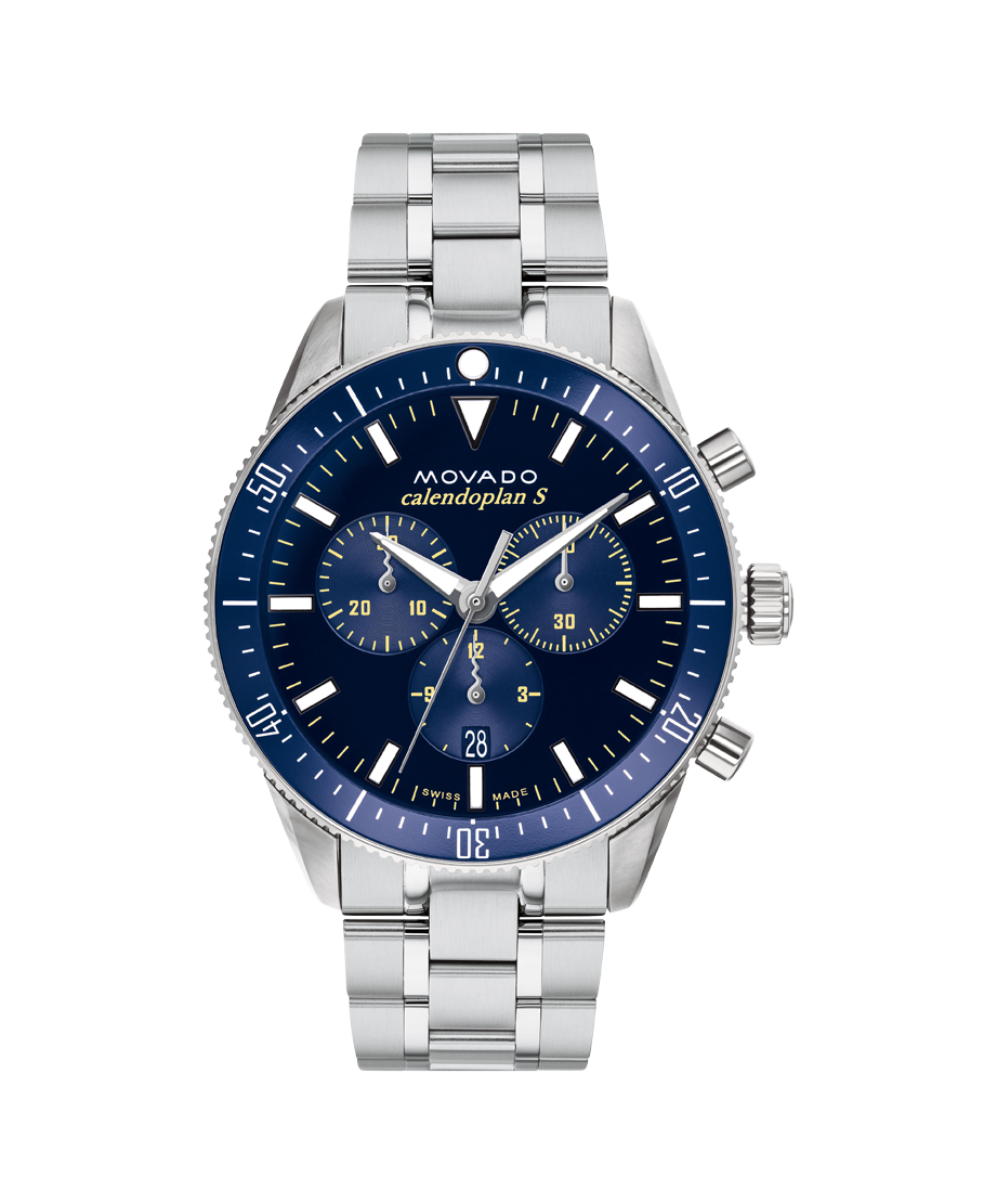 Movado Heritage Series Calendoplan Chronograph, 42 mm stainless steel case and bracelet with blue-toned dial & unidirectional rotating bezel.