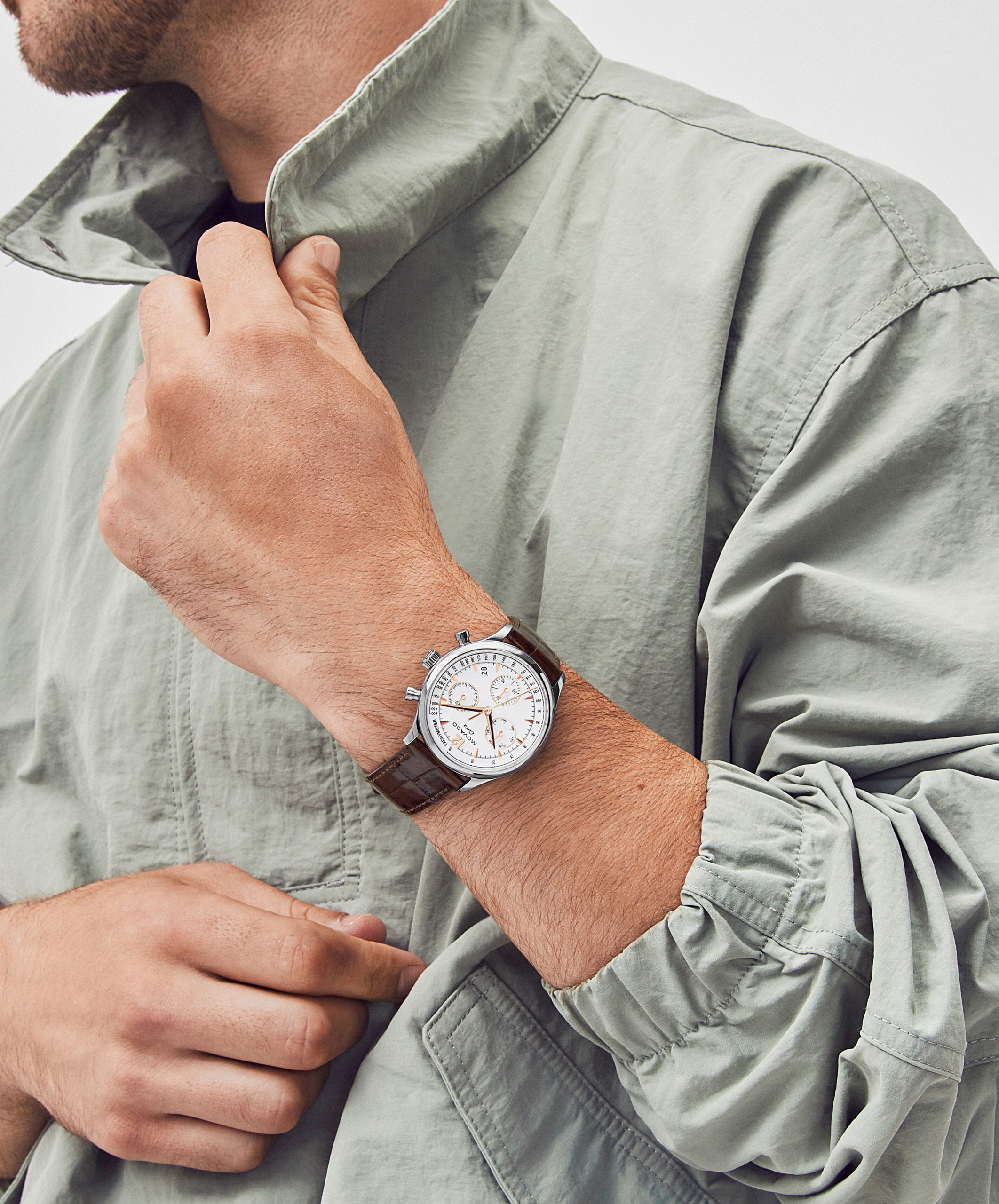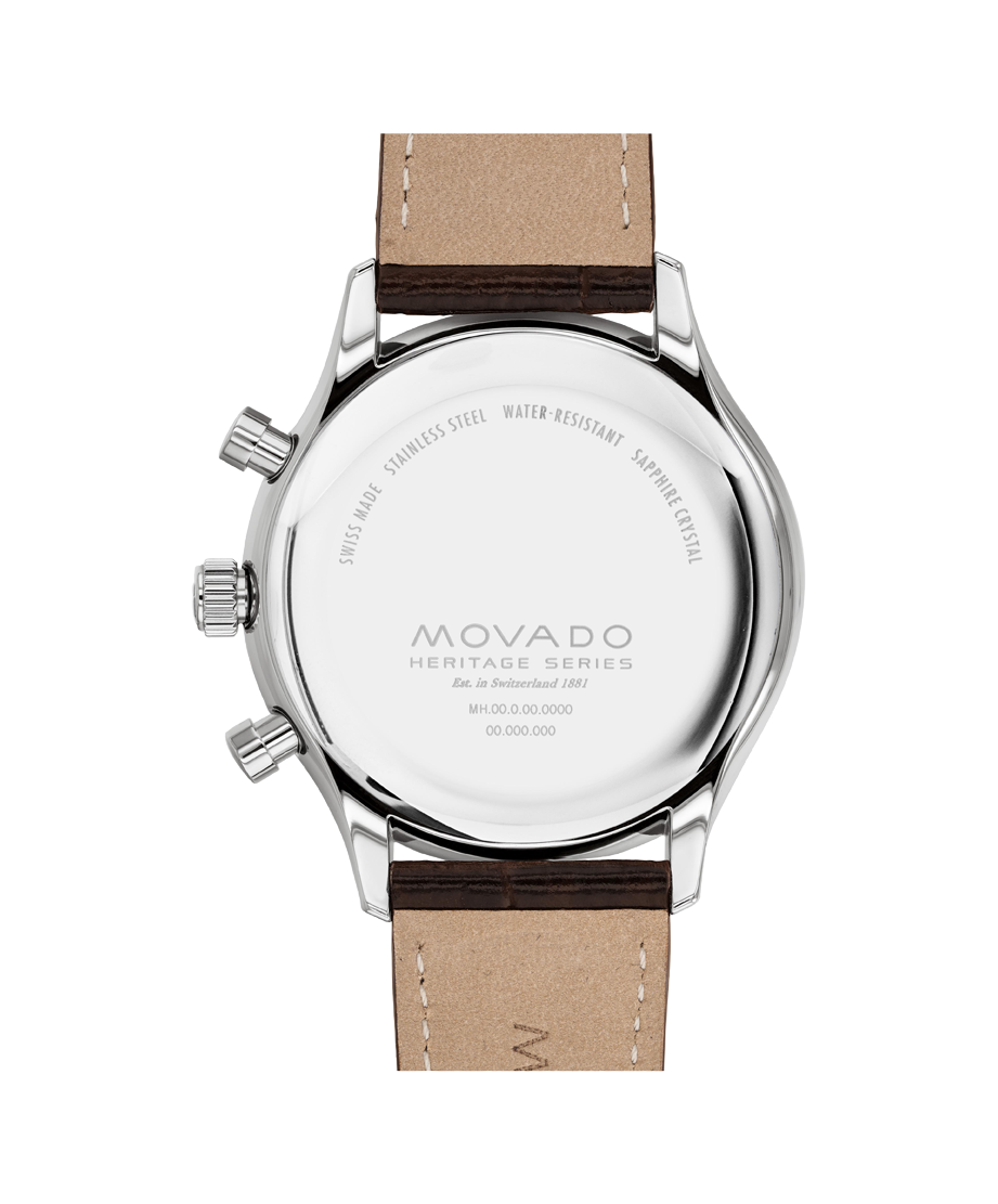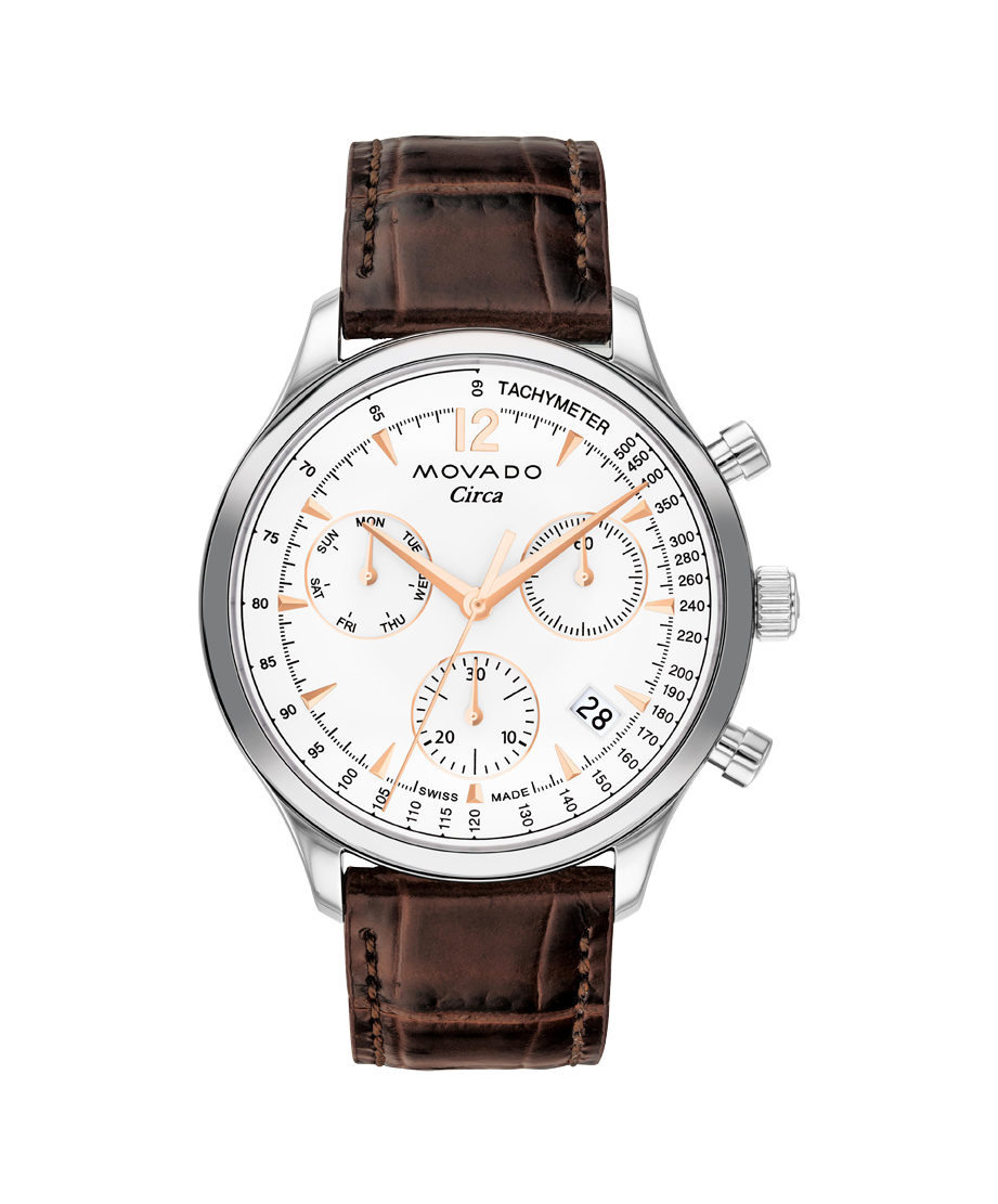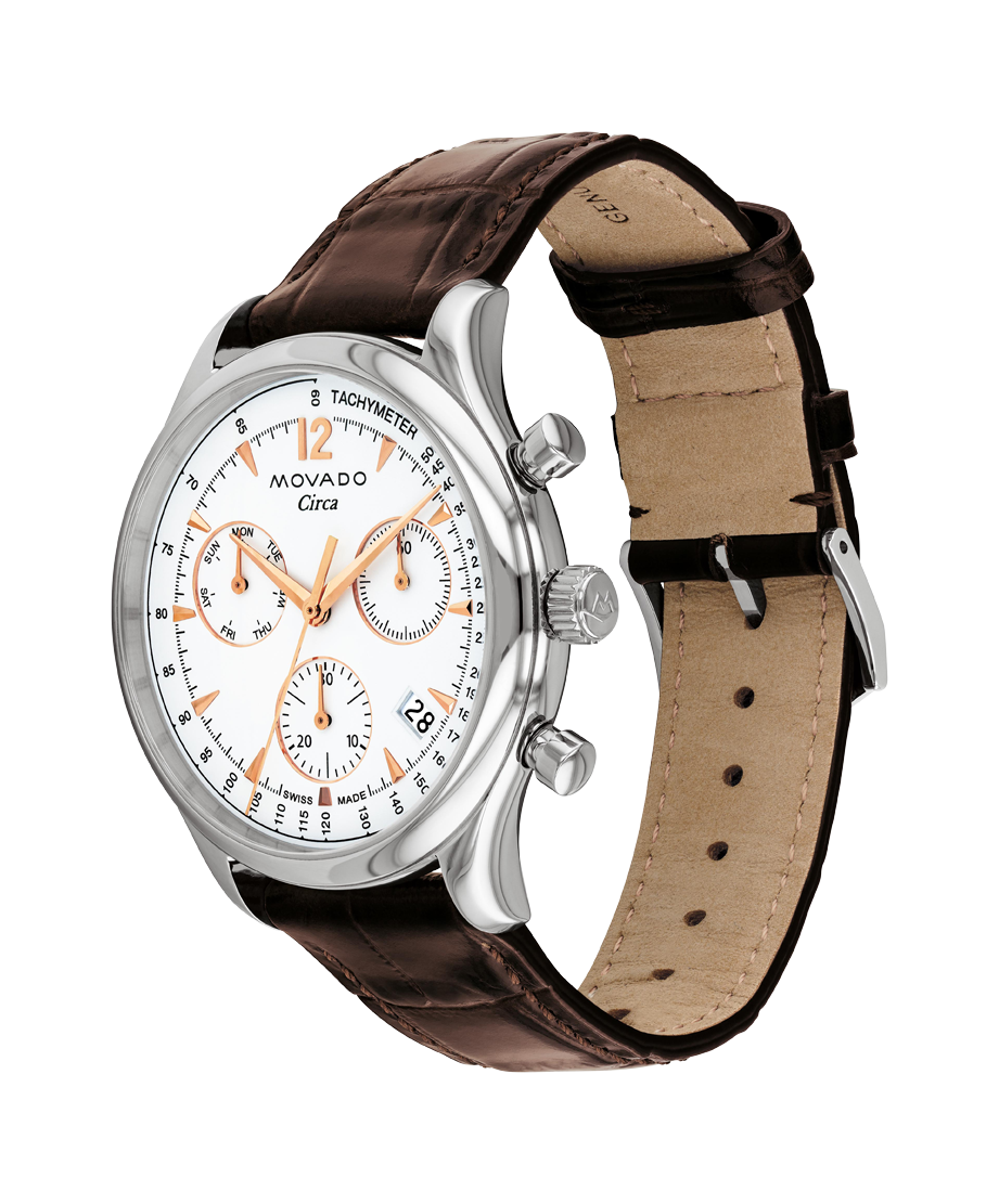 Movado Heritage Series Circa, 43 mm stainless steel case with white chronograph dial on brown faux crocodile leather strap.