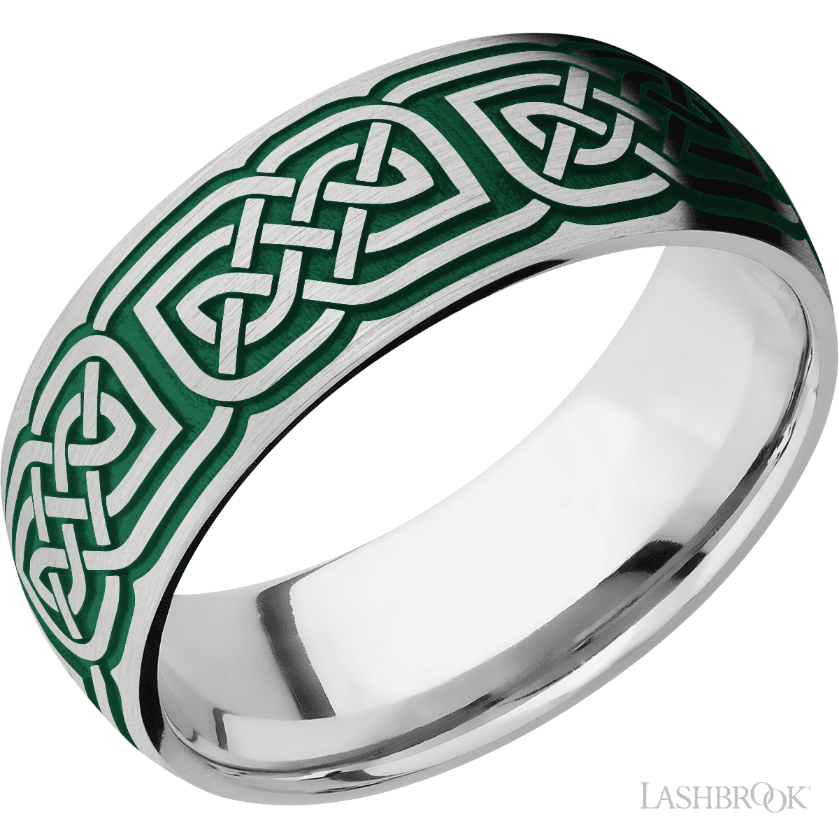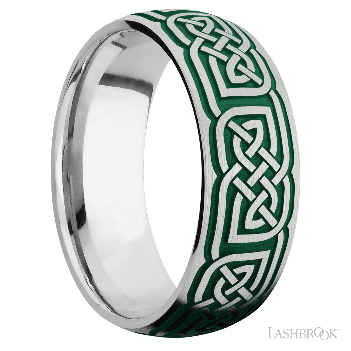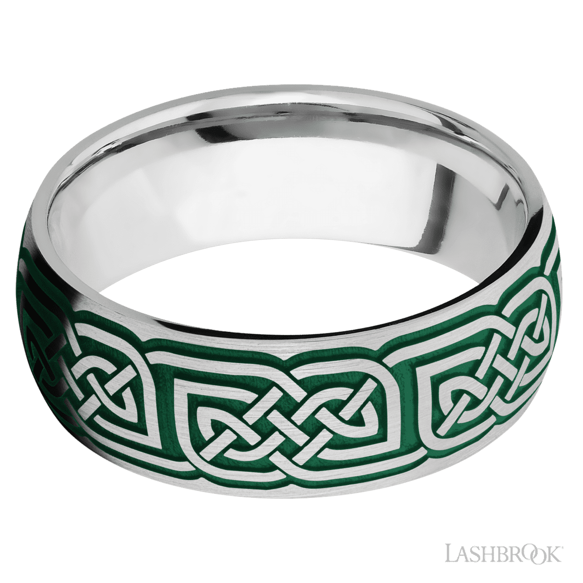 8 mm wide/Domed/Cobalt Chrome band with a laser carved Celtic 17 pattern.