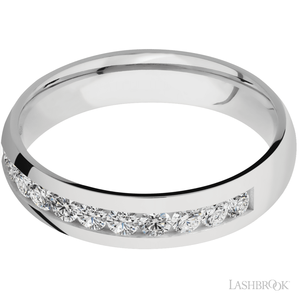 5 mm wide/Domed/Cobalt Chrome band with a Half Eternity arrangement of .07 carat Round Diamond stones in a Channel setting.