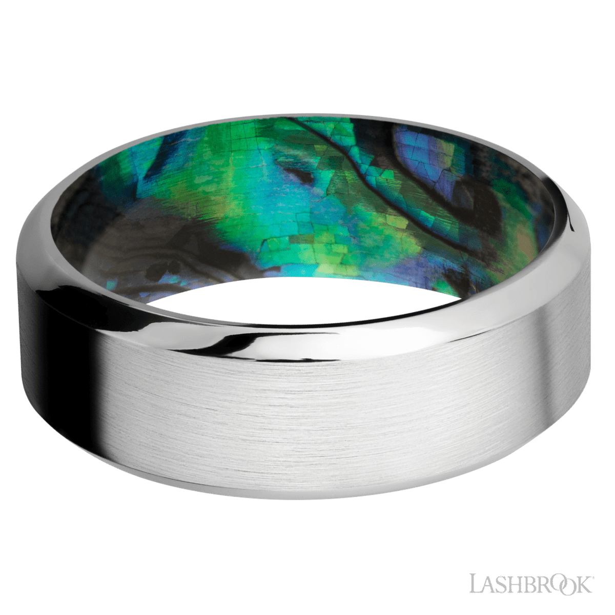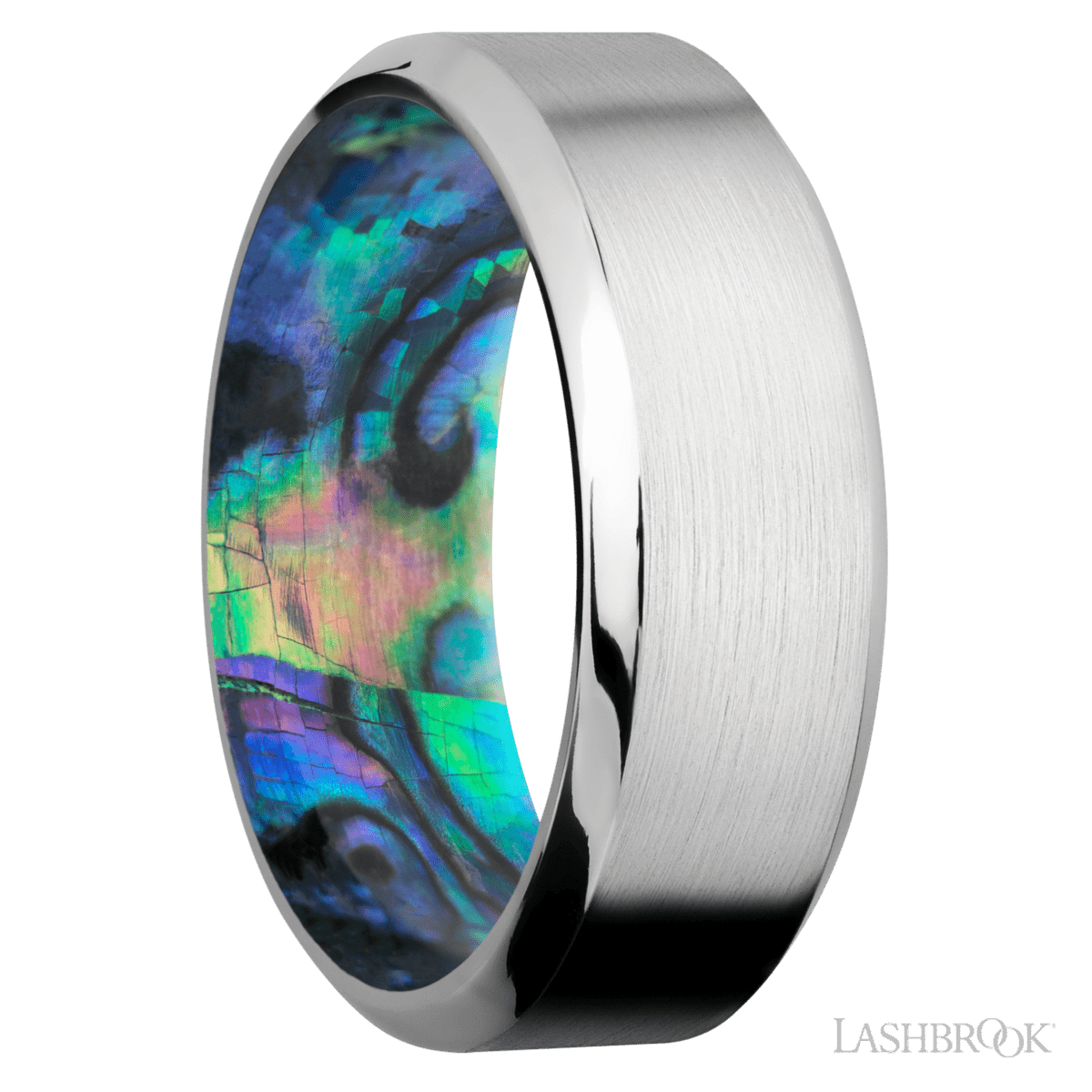8 mm wide High Bevel Cobalt Chrome band featuring a Abalone Sleeve
