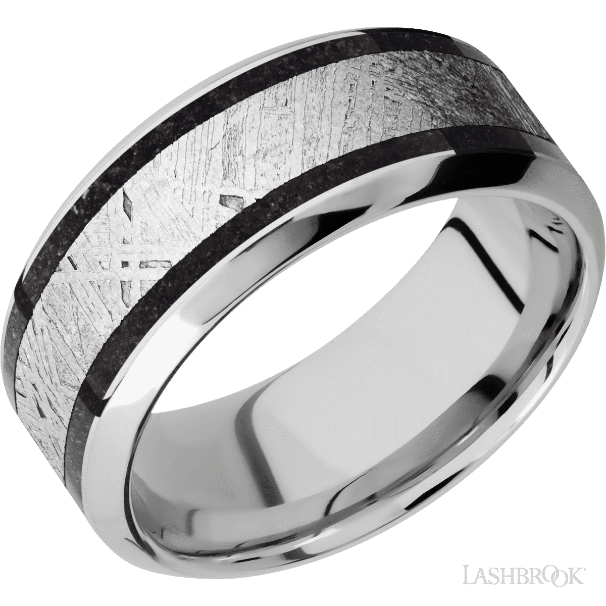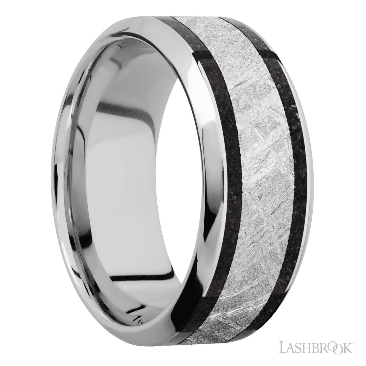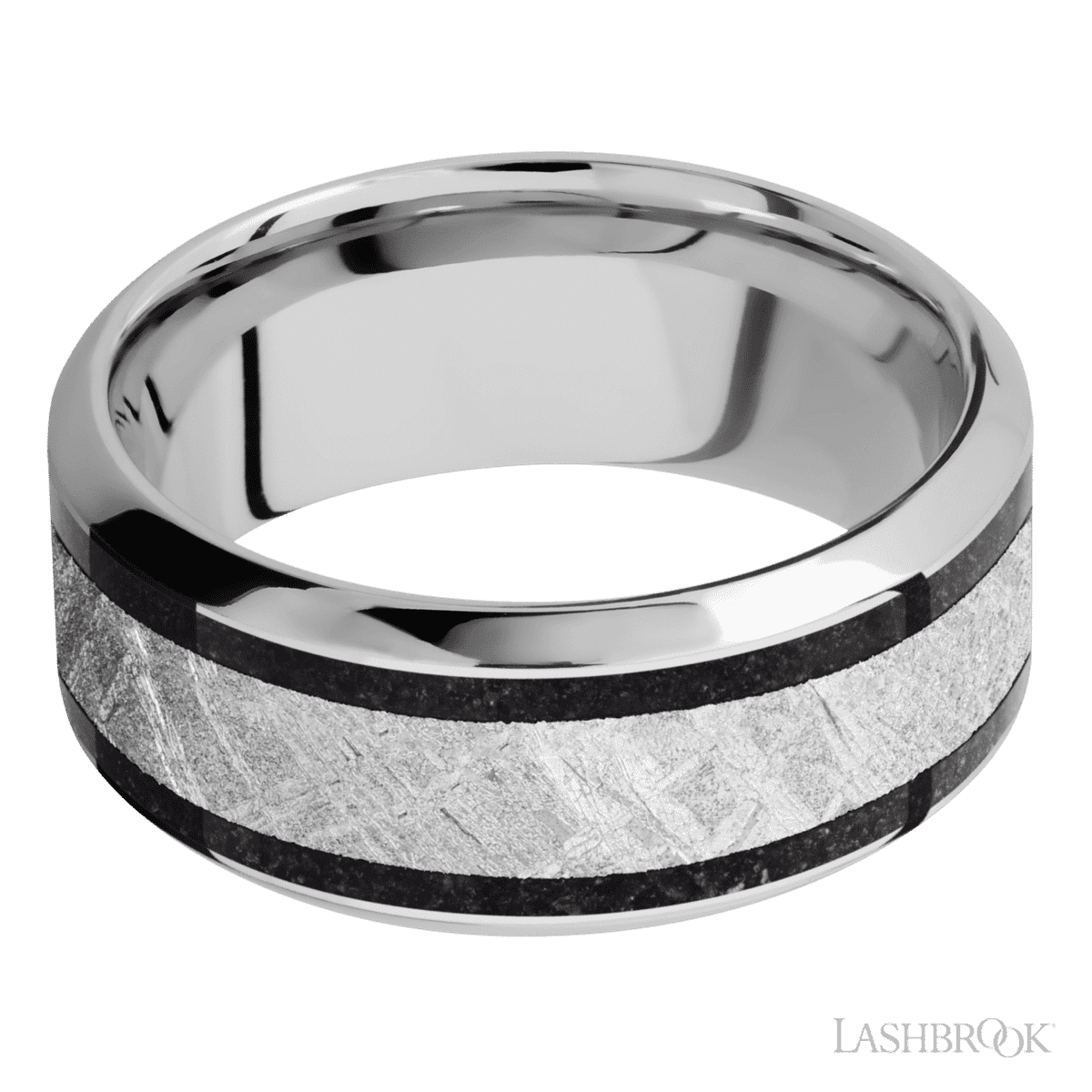 9 mm wide/High Bevel/Cobalt Chrome band featuring inlays of Dinosaur Bone Black and Meteorite