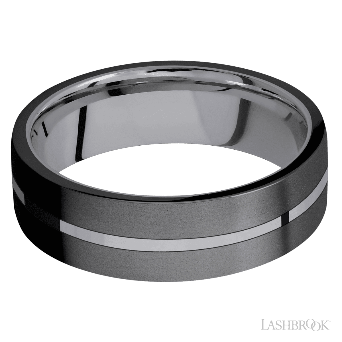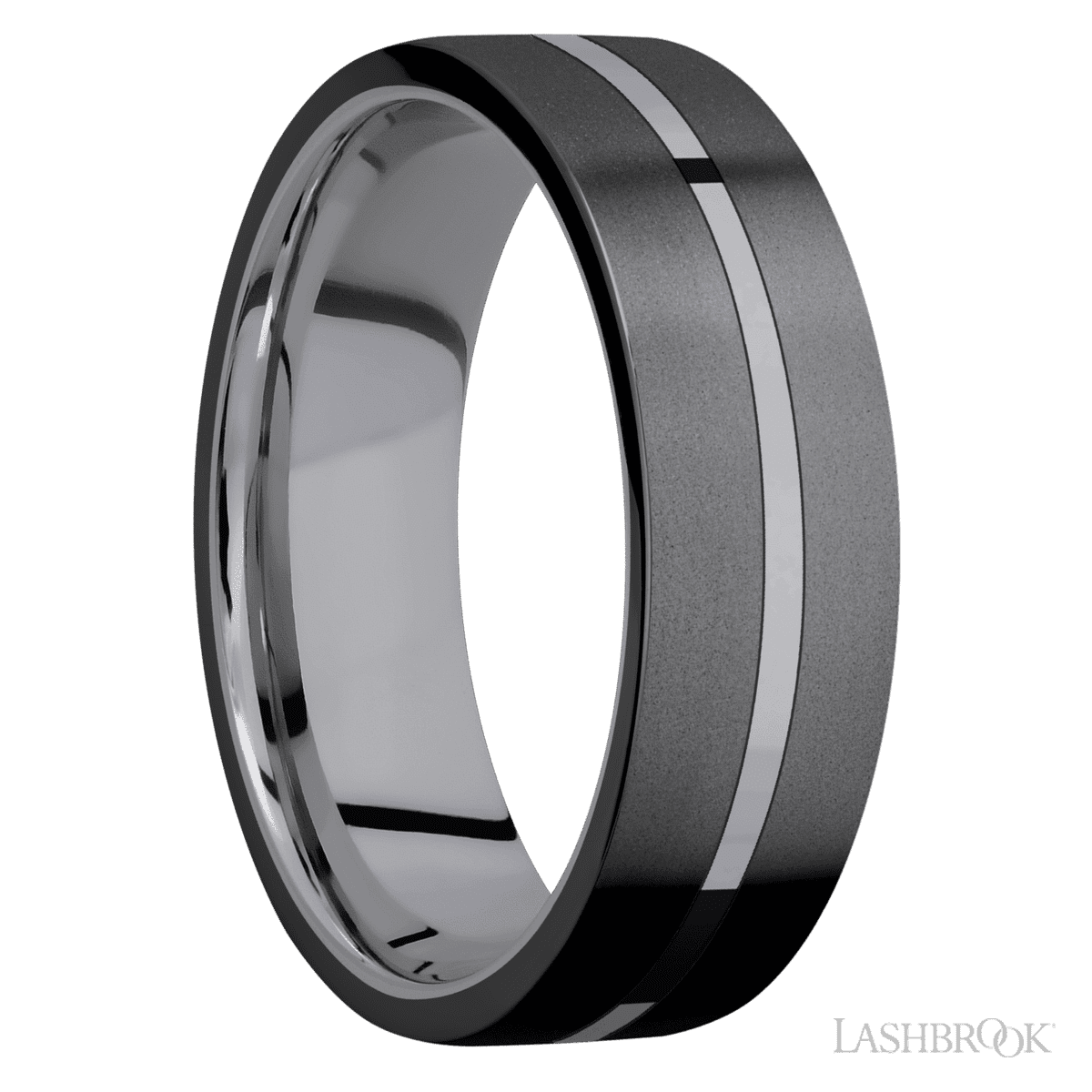7 mm wide/Flat/Tantalum band with two 3 mm Off Center Edge inlays of Zirconium