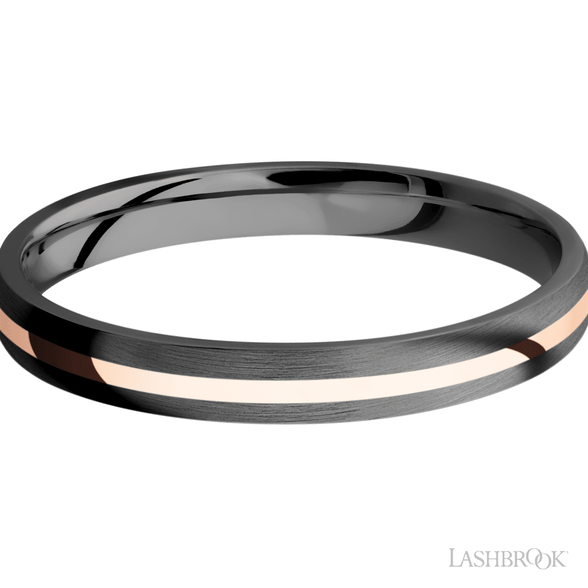 3 mm wide/Domed/Zirconium band with one 1 mm Centered inlay of 14K Rose Gold.
