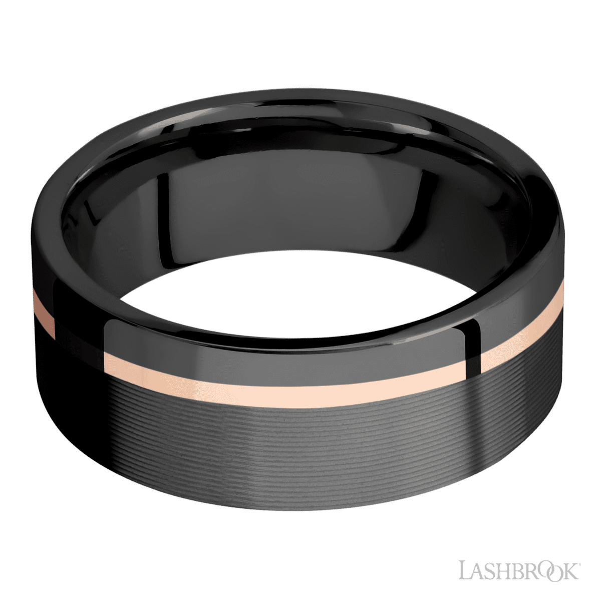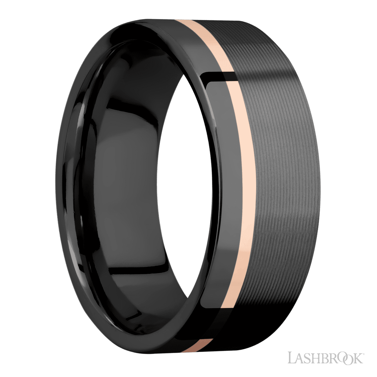 8 mm wide Flat Zirconium band featuring a 14K Rose Gold sleeve.