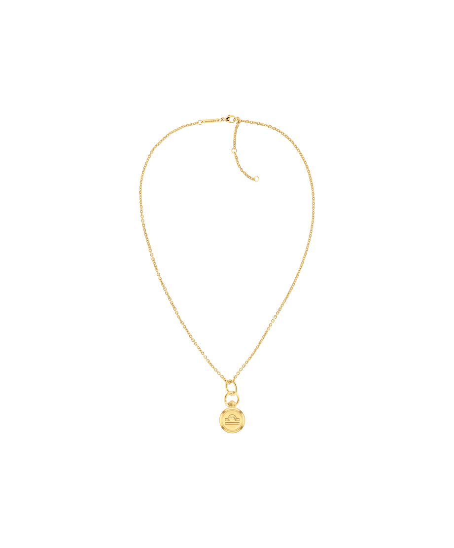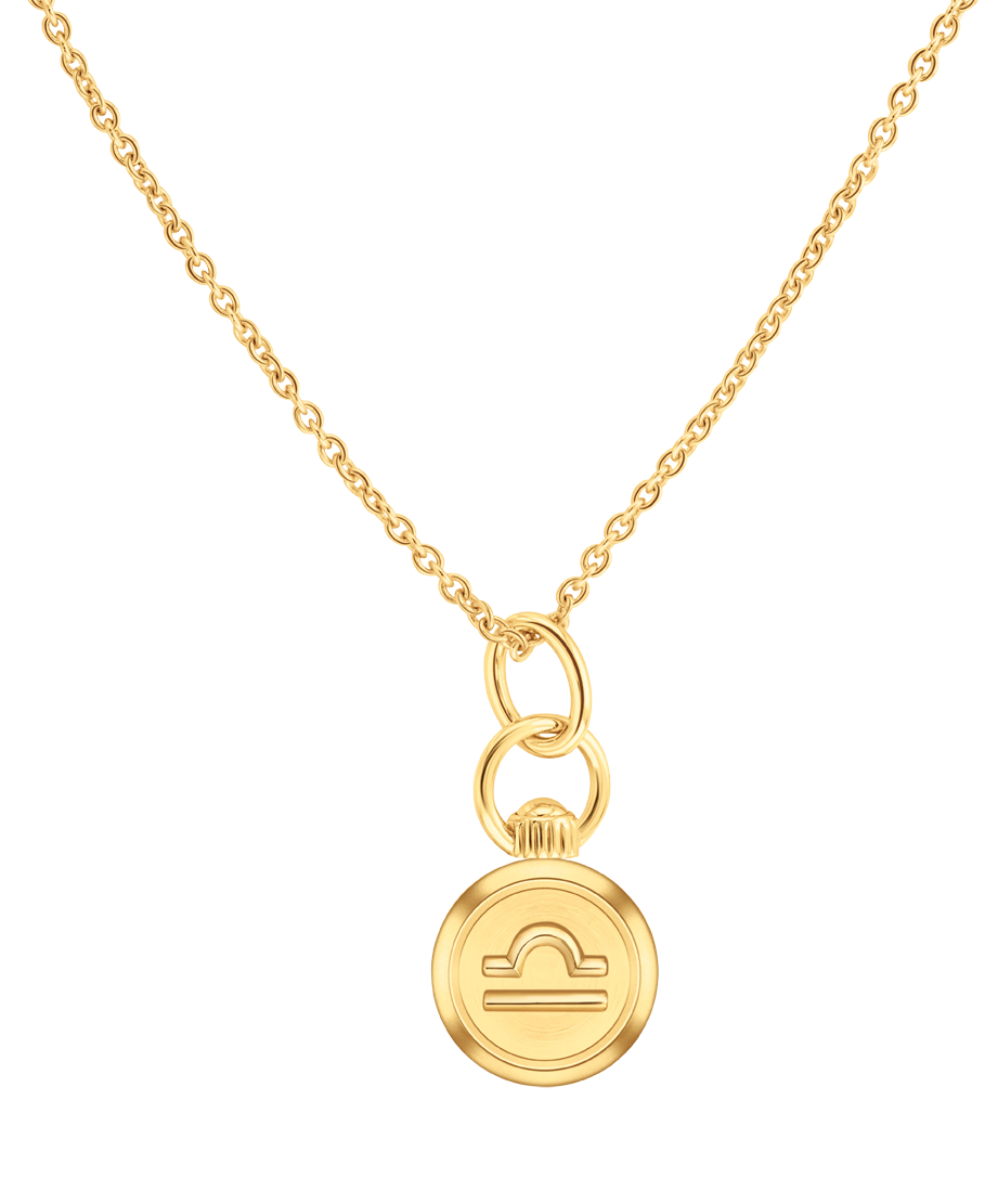 Modern elegance inspired by the beauty of the cosmos. This vermeilラ14k yellow gold-plated sterling silverラpendant necklace is emblazoned with the Libra symbol. Adjustable length of 16″, 17″ or 18″. Lobster clasp closure.