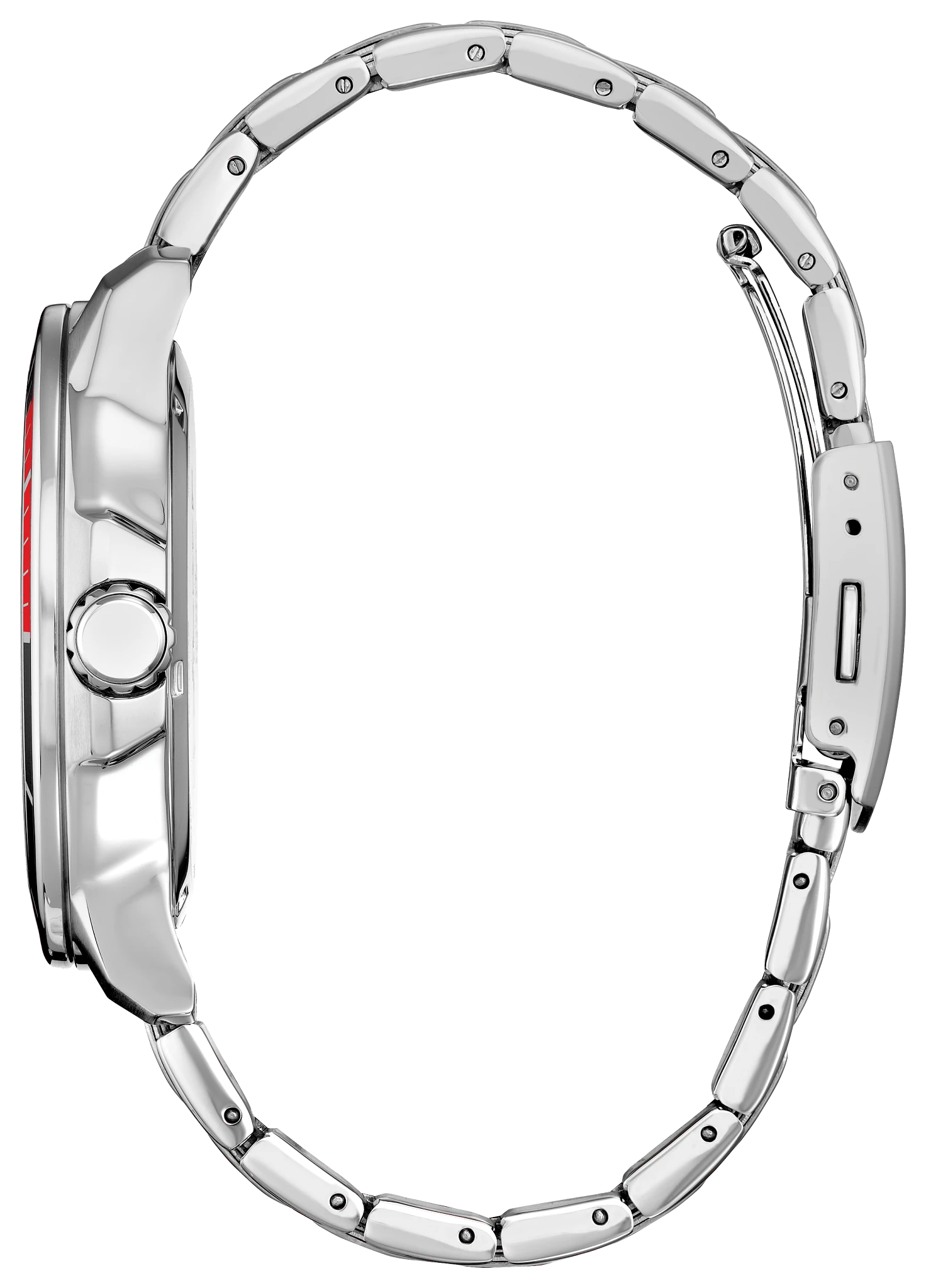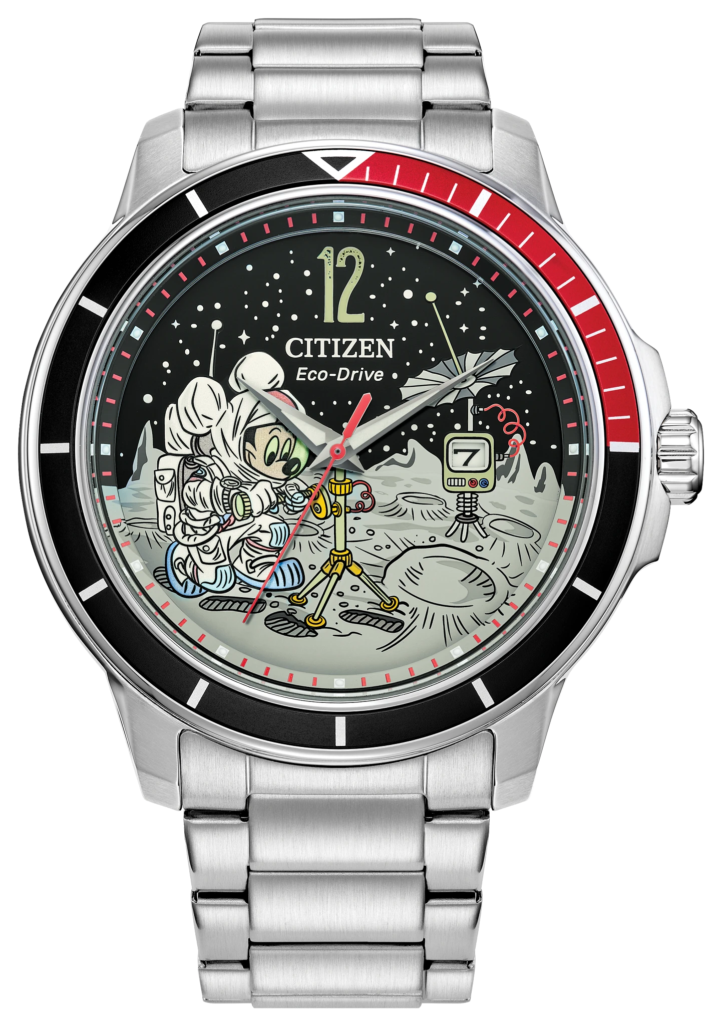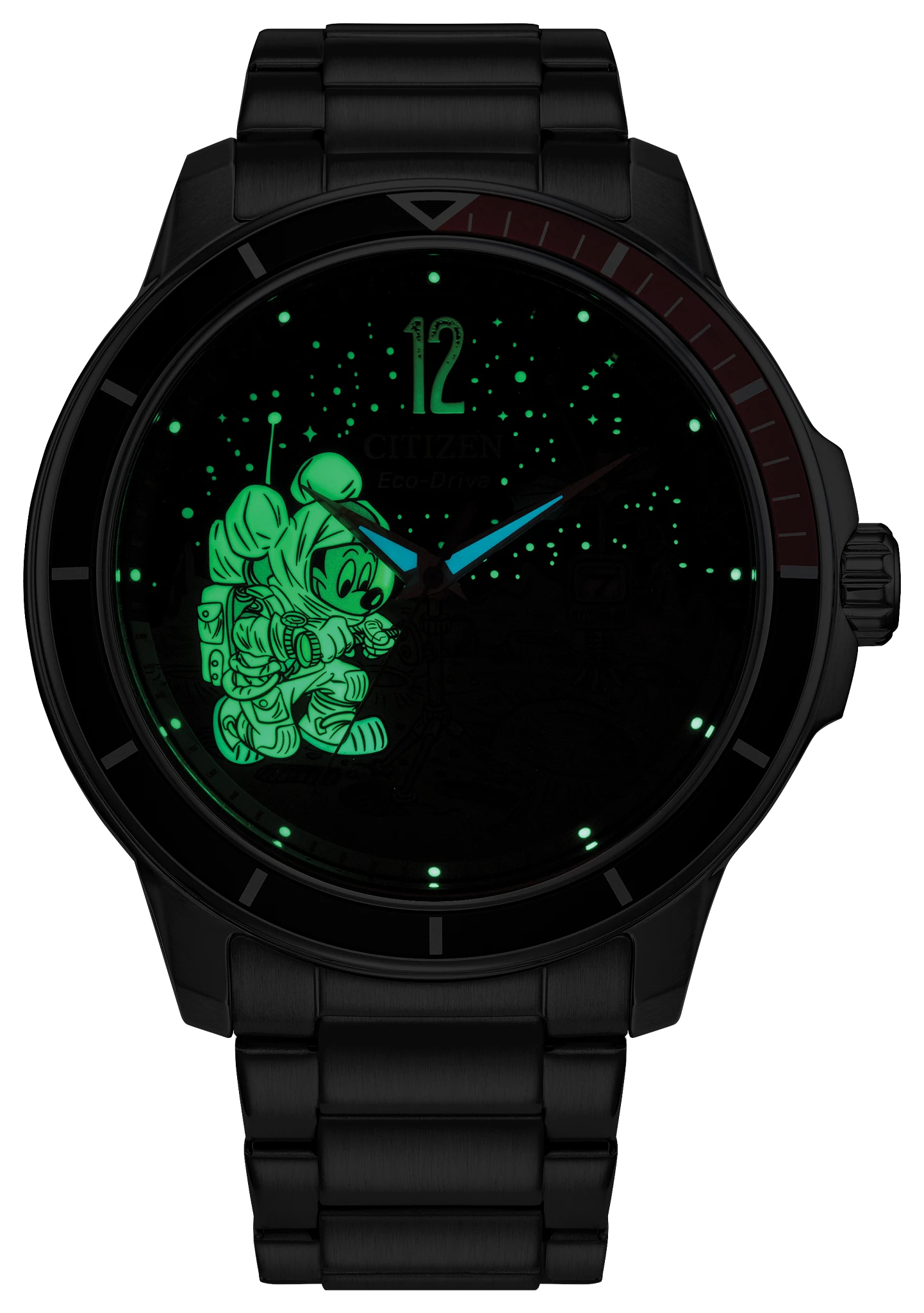 One giant step for Mickey Mouse as he takes his adventures to the moon,… glowing brightly, for all to see. This Disney x Citizen Mickey Mouse Astronaut watch, with an impeccably detailed space- themed dial, features so much to fascinate over. A silver-tone stainless steel case and bracelet, with an accented red and black bezel and date window, accentuates the bright luminescent design of Mickey Mouse himself. Powered by any light with our Eco-Drive technology, this watch never needs a battery.