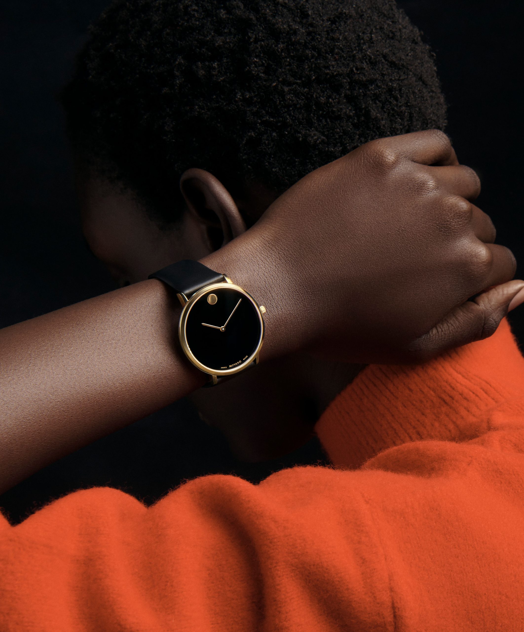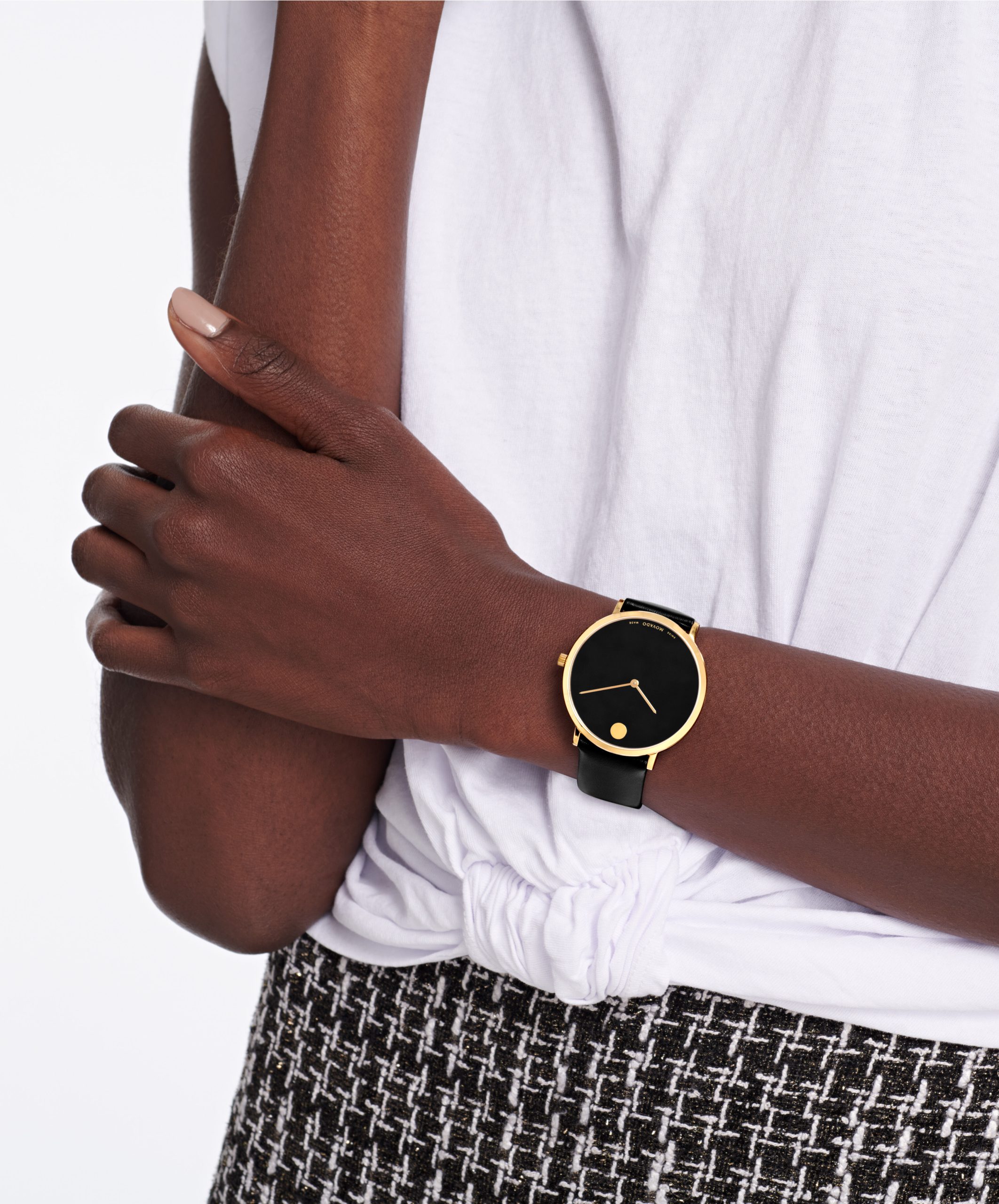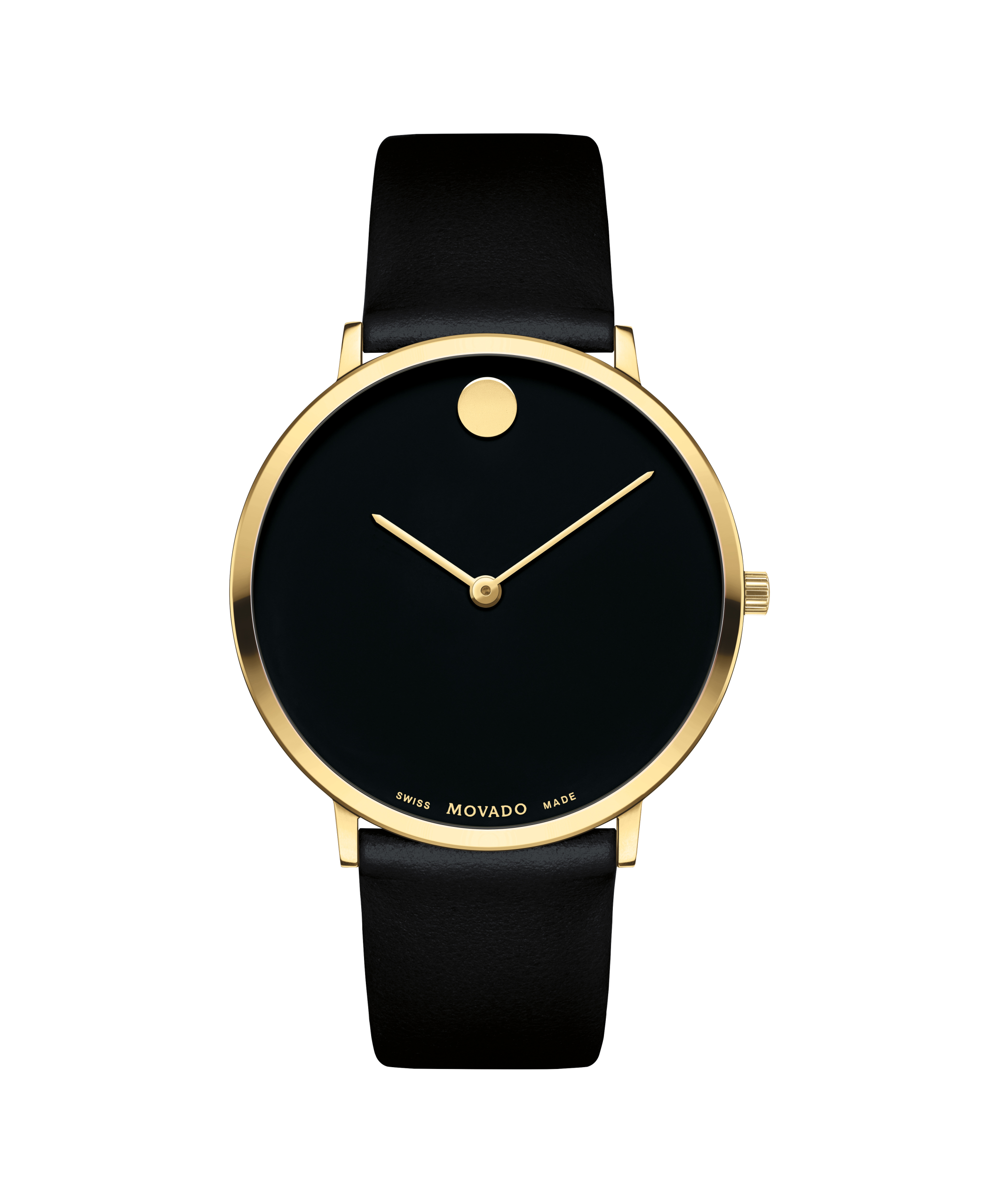 Movado.com EXCLUSIVE Modern 47, 40 mm yellow gold PVD-finished stainless steel case with black-toned dial on black leather strap.