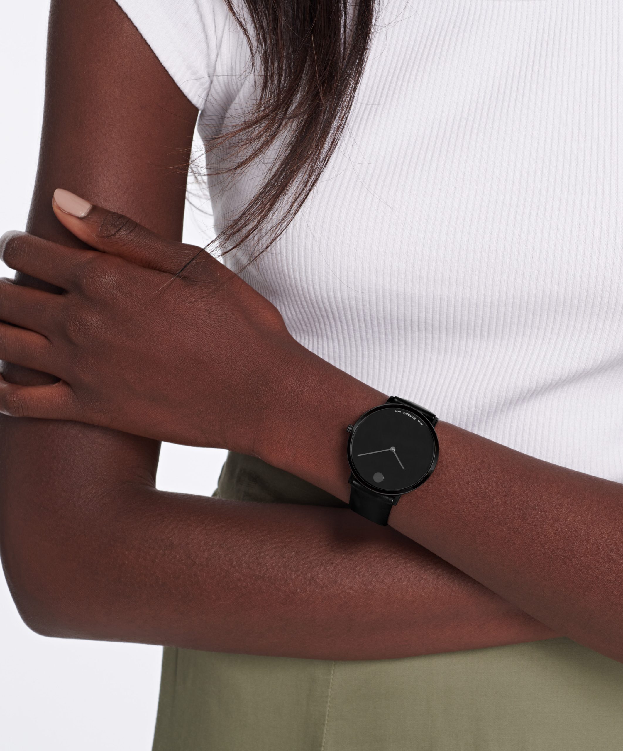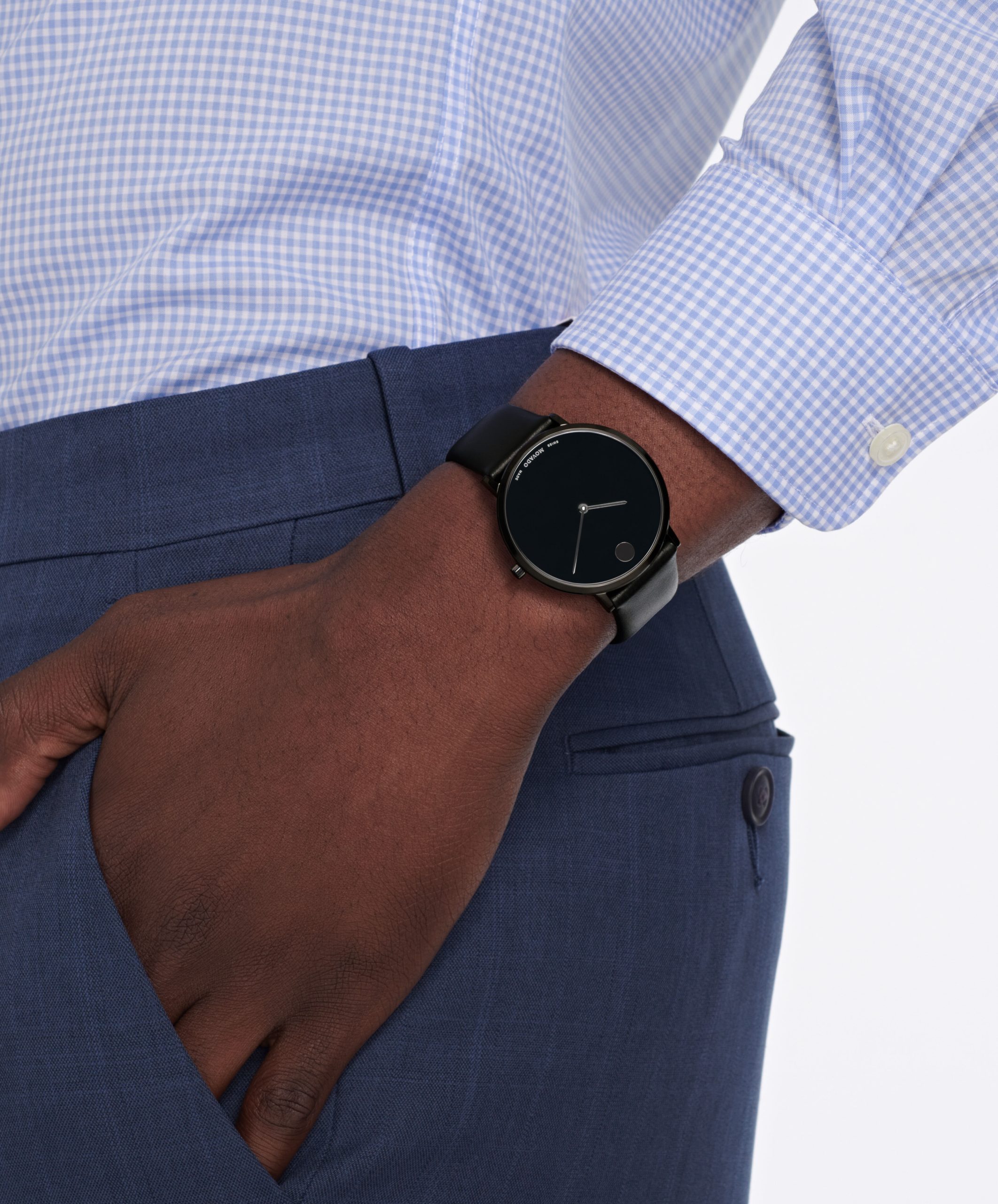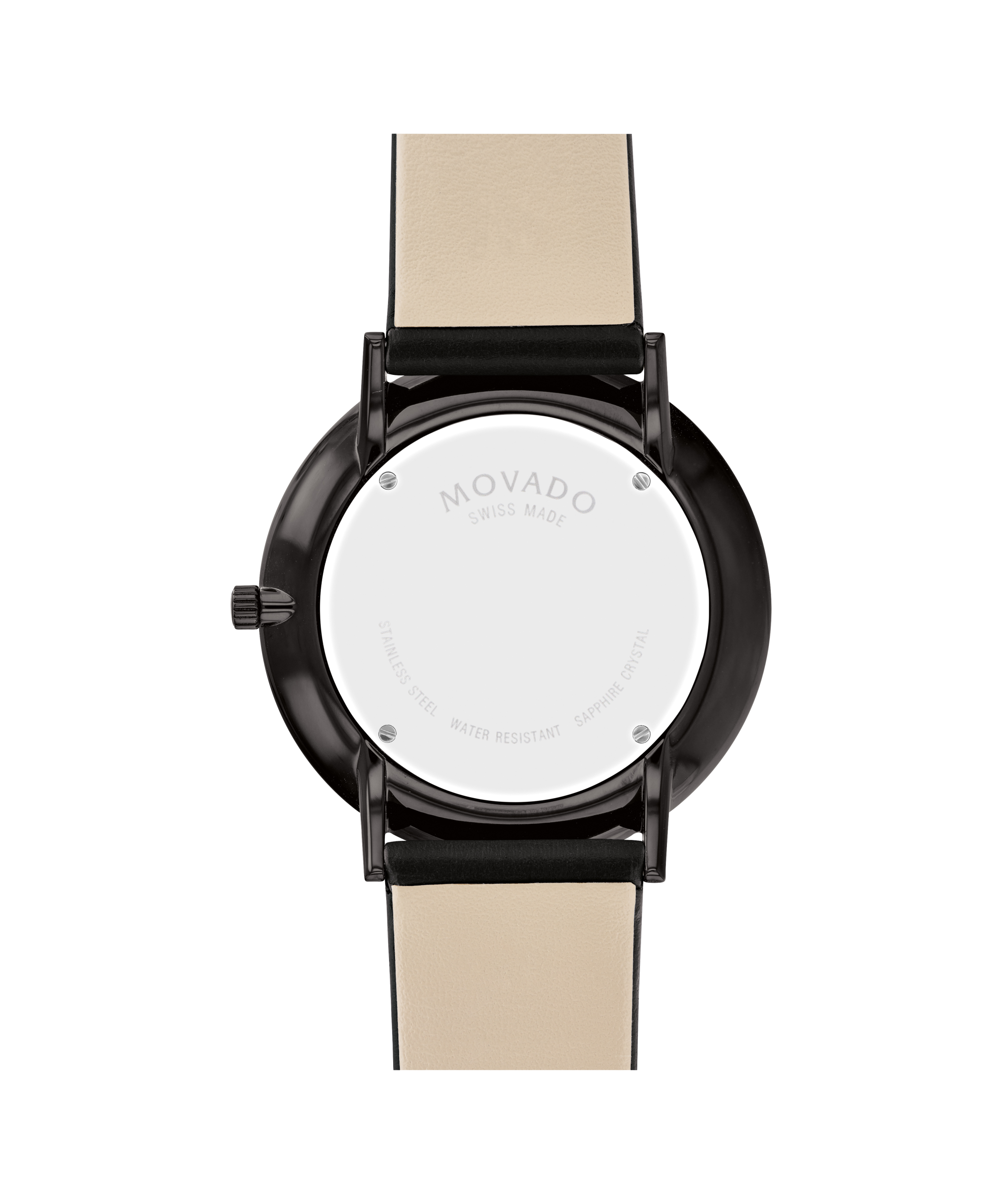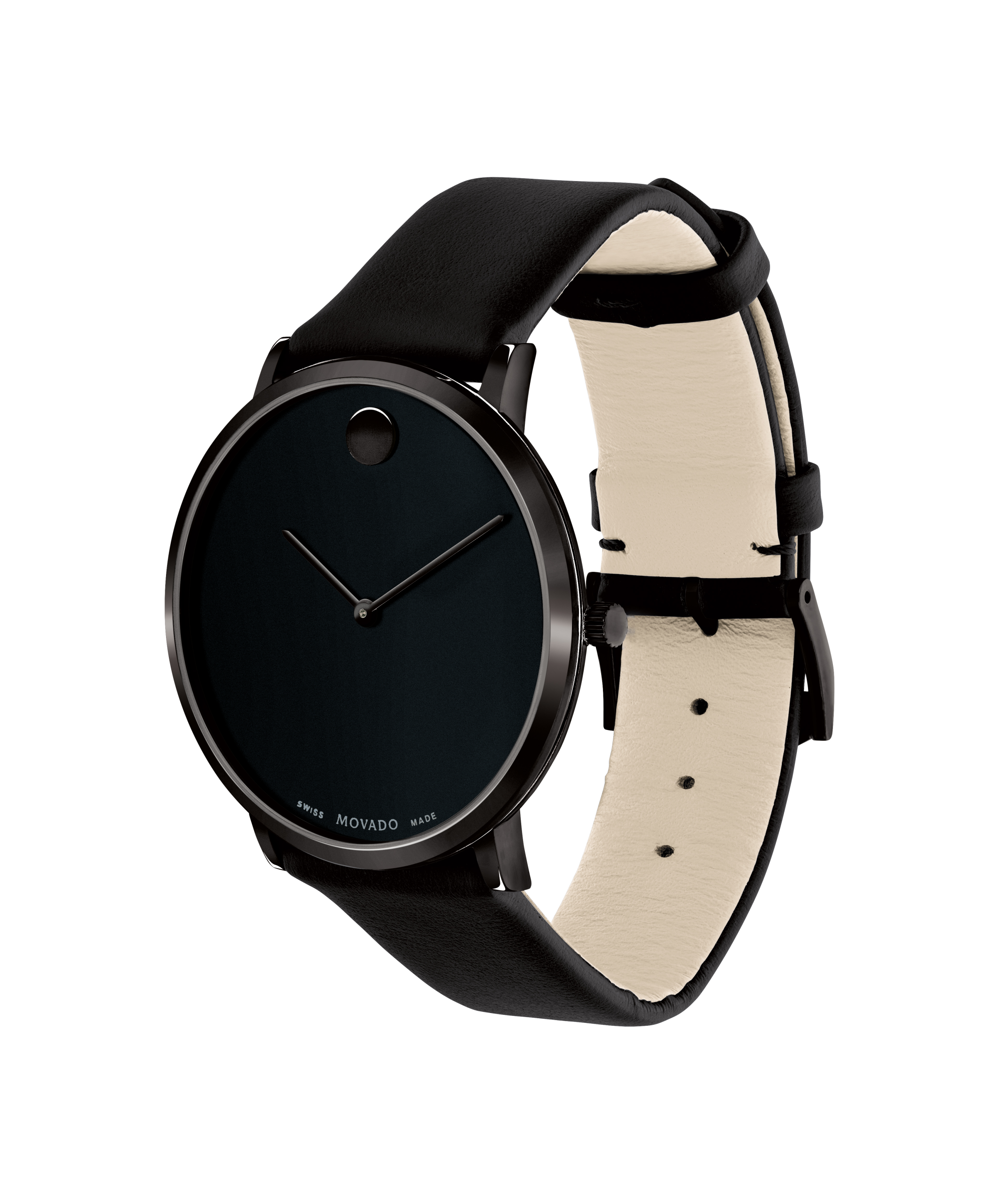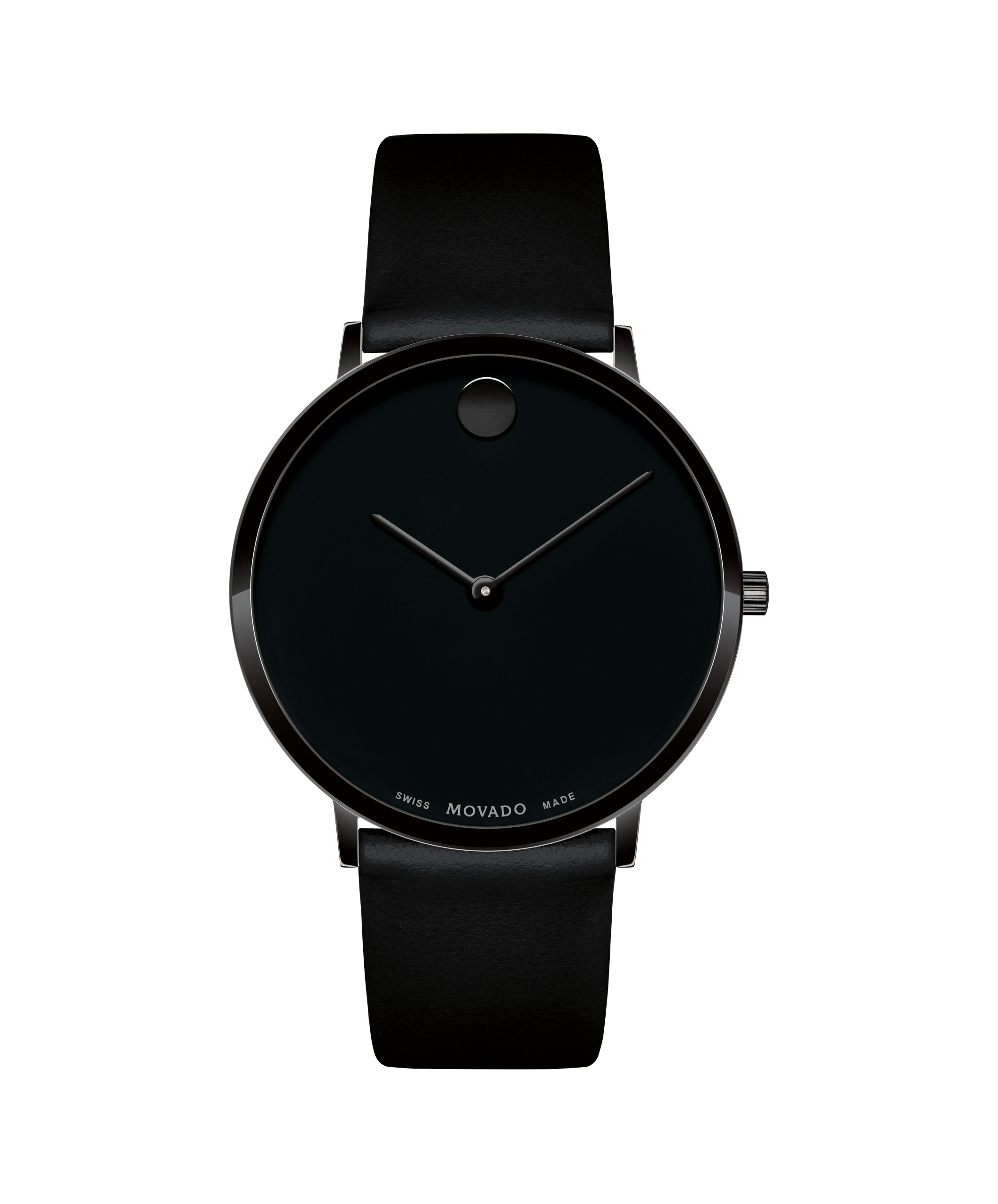 Movado.com EXCLUSIVE Modern 47, 40 mm black PVD-finished stainless steel case with black-toned dial on black leather strap.