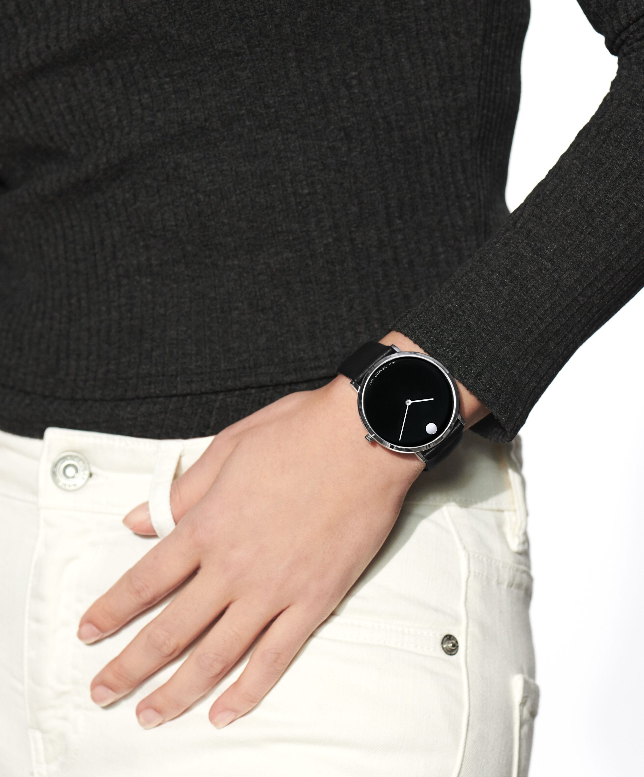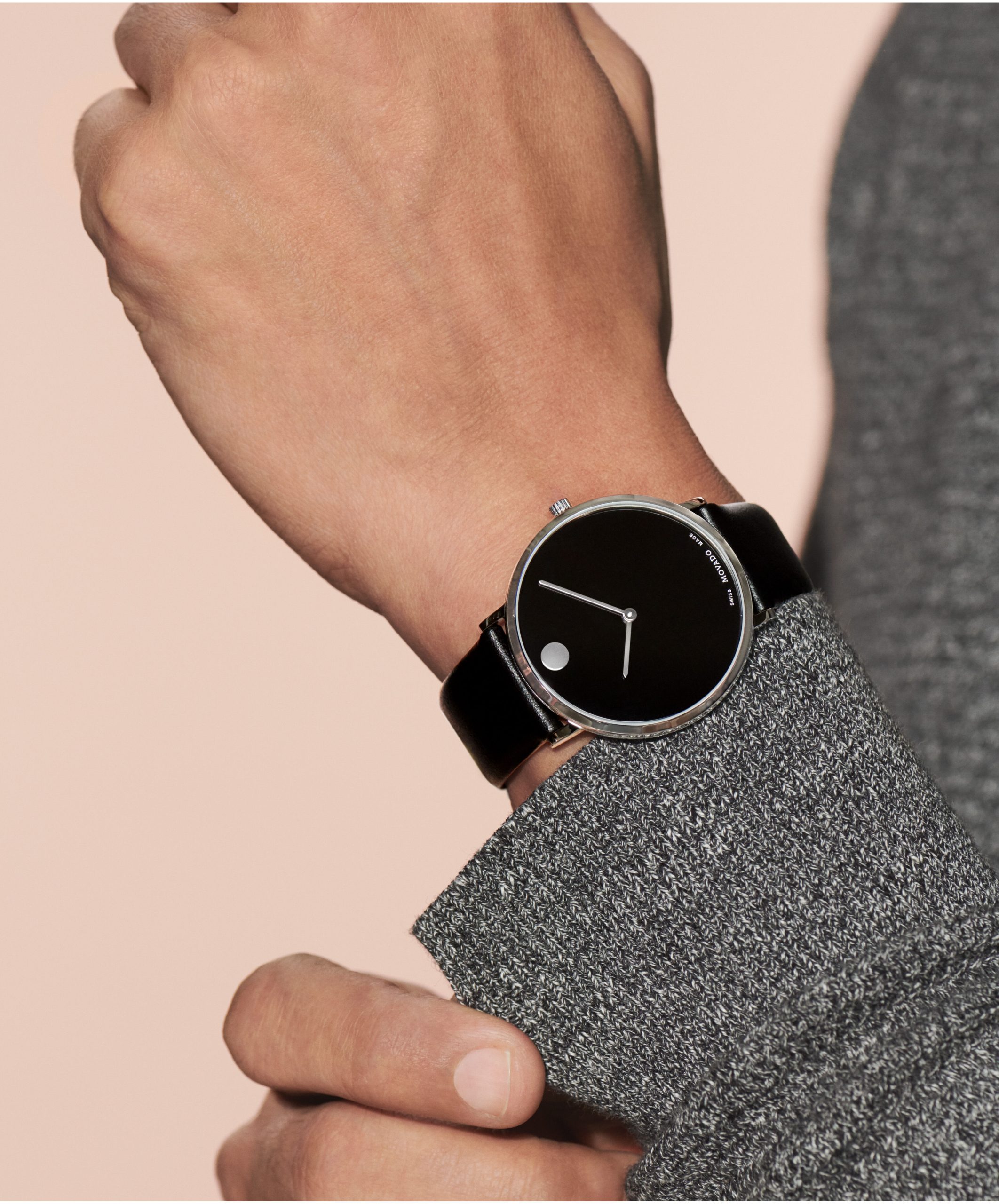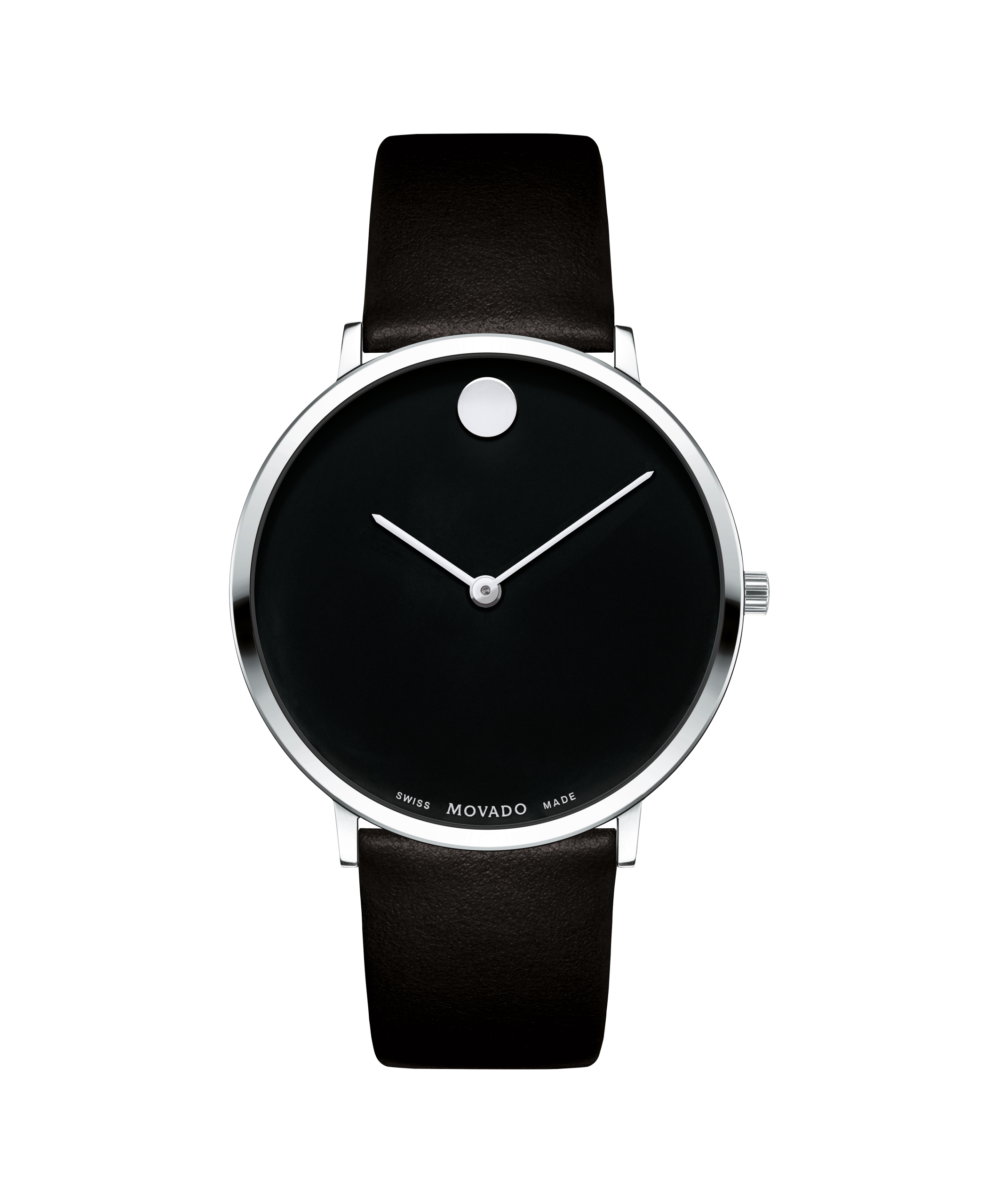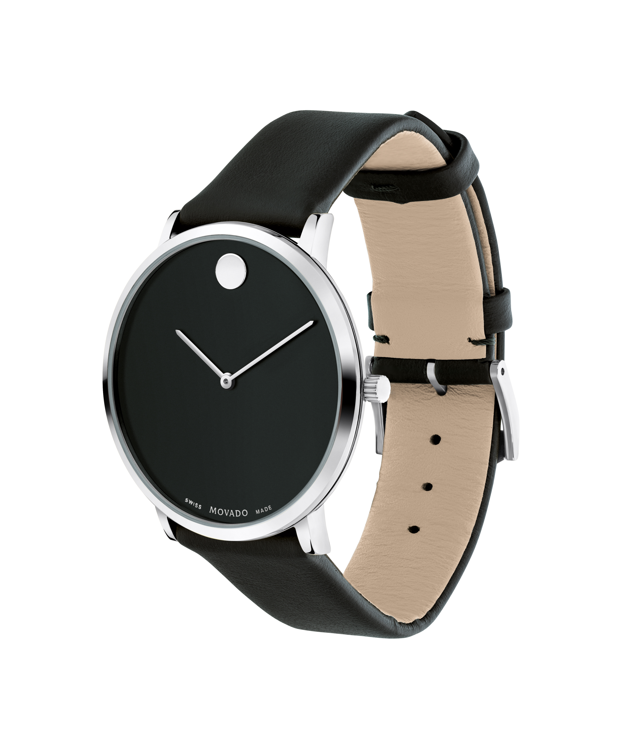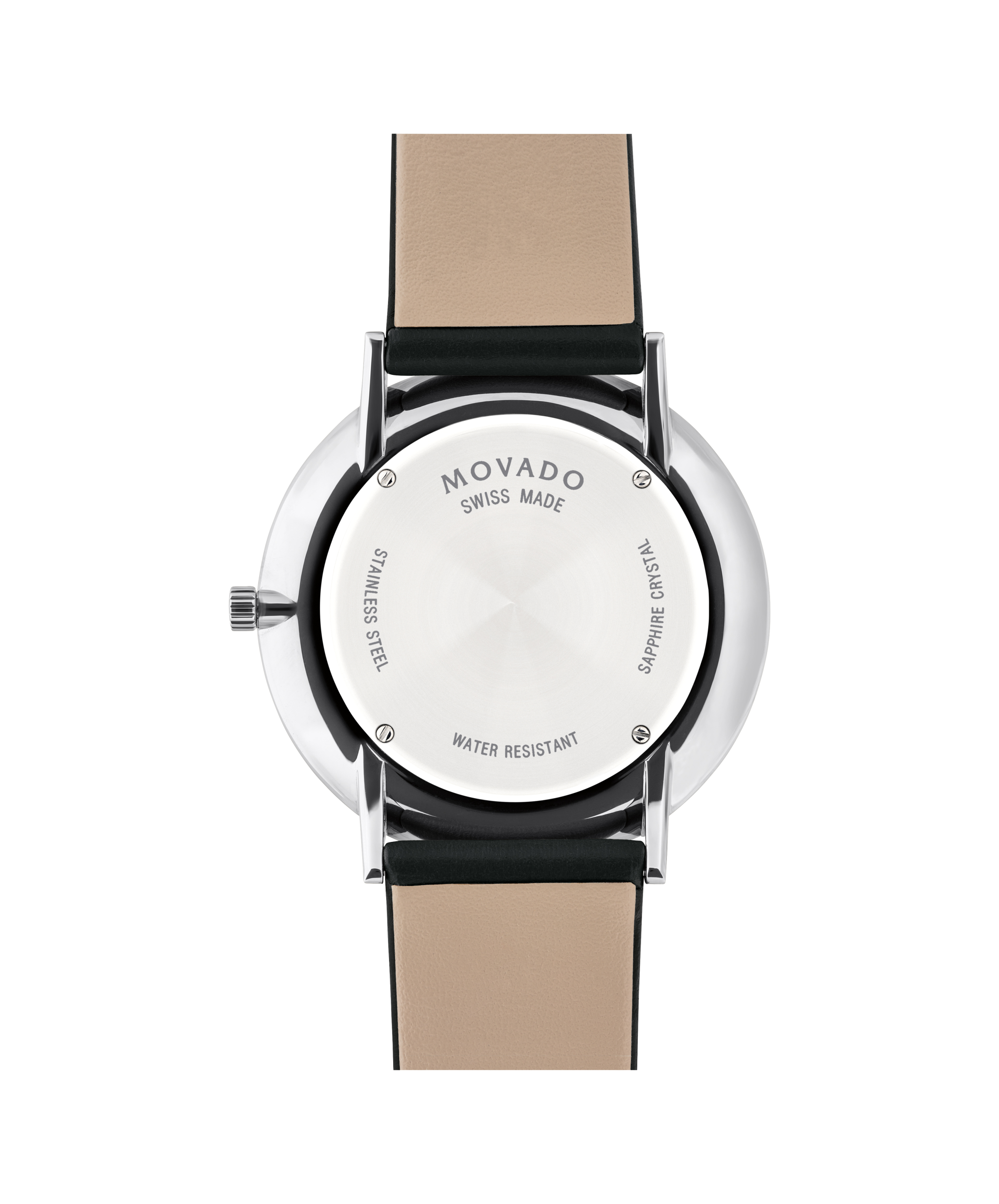 Movado Modern 47, 40 mm stainless steel case, black Museum dial and black calfskin strap.