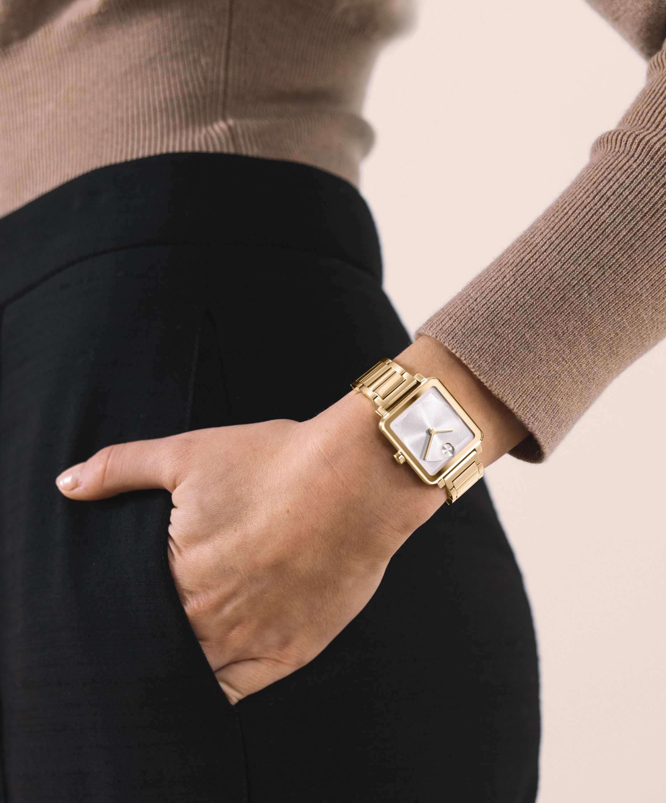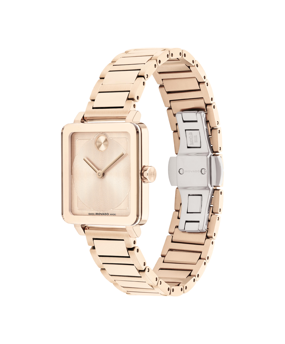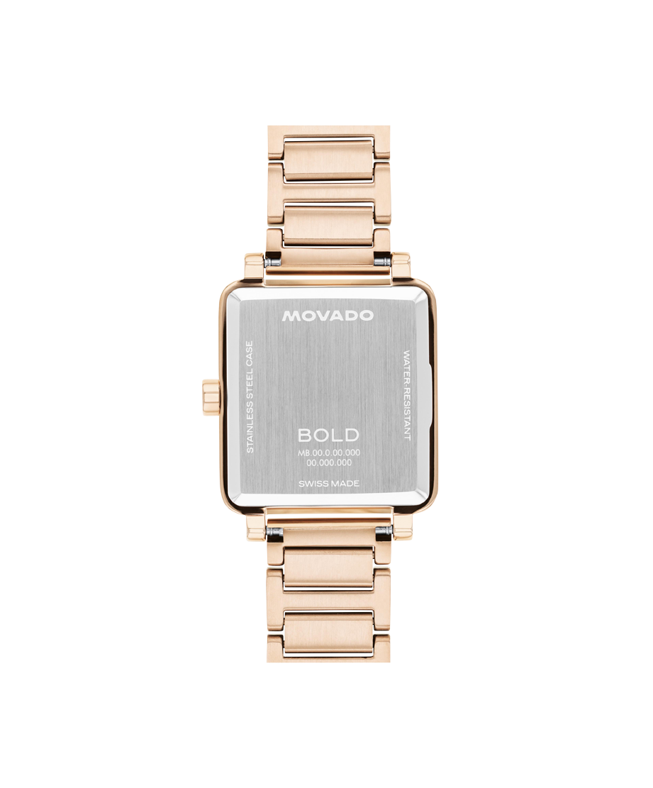 The BOLD Evolution 2.0 is defined by an elevated, bold case and a dimensional micro-textured dial. This 28mm x 26mm square watch features a rose gold-tone lacquer dial, slim tonal hands, and a dot at 12 o’clock.