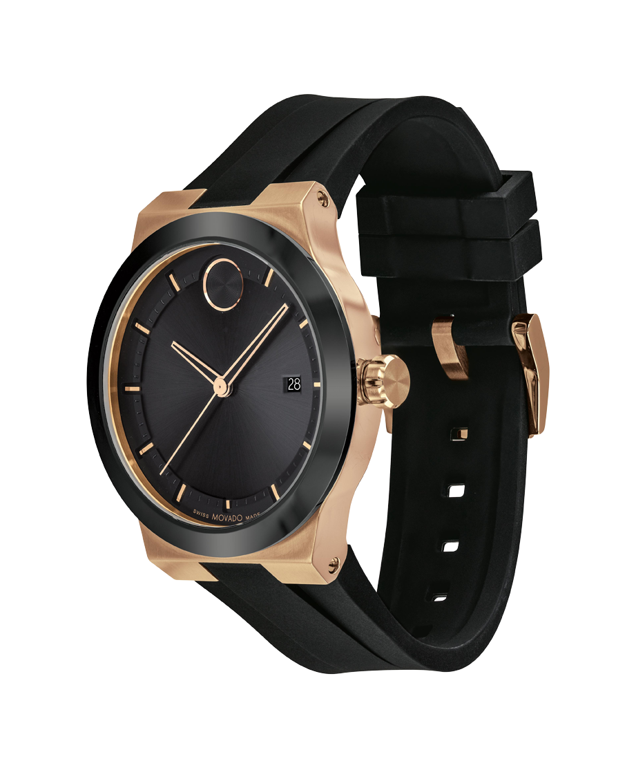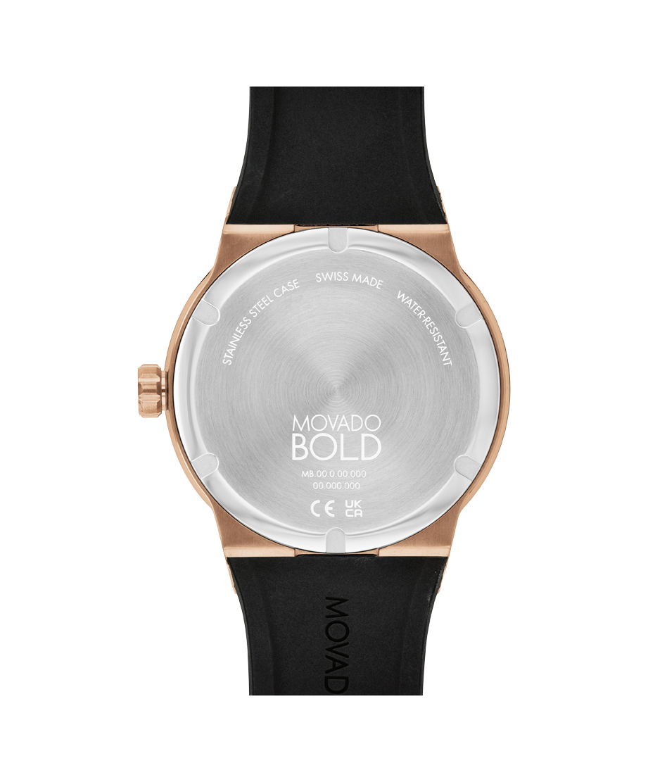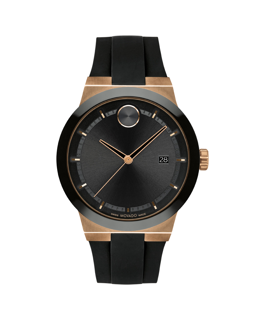 Movado BOLD Fusion, 42 mm bronze ion-plated stainless steel case & black ceramic bezel with a black-toned dial on black silicone strap.
