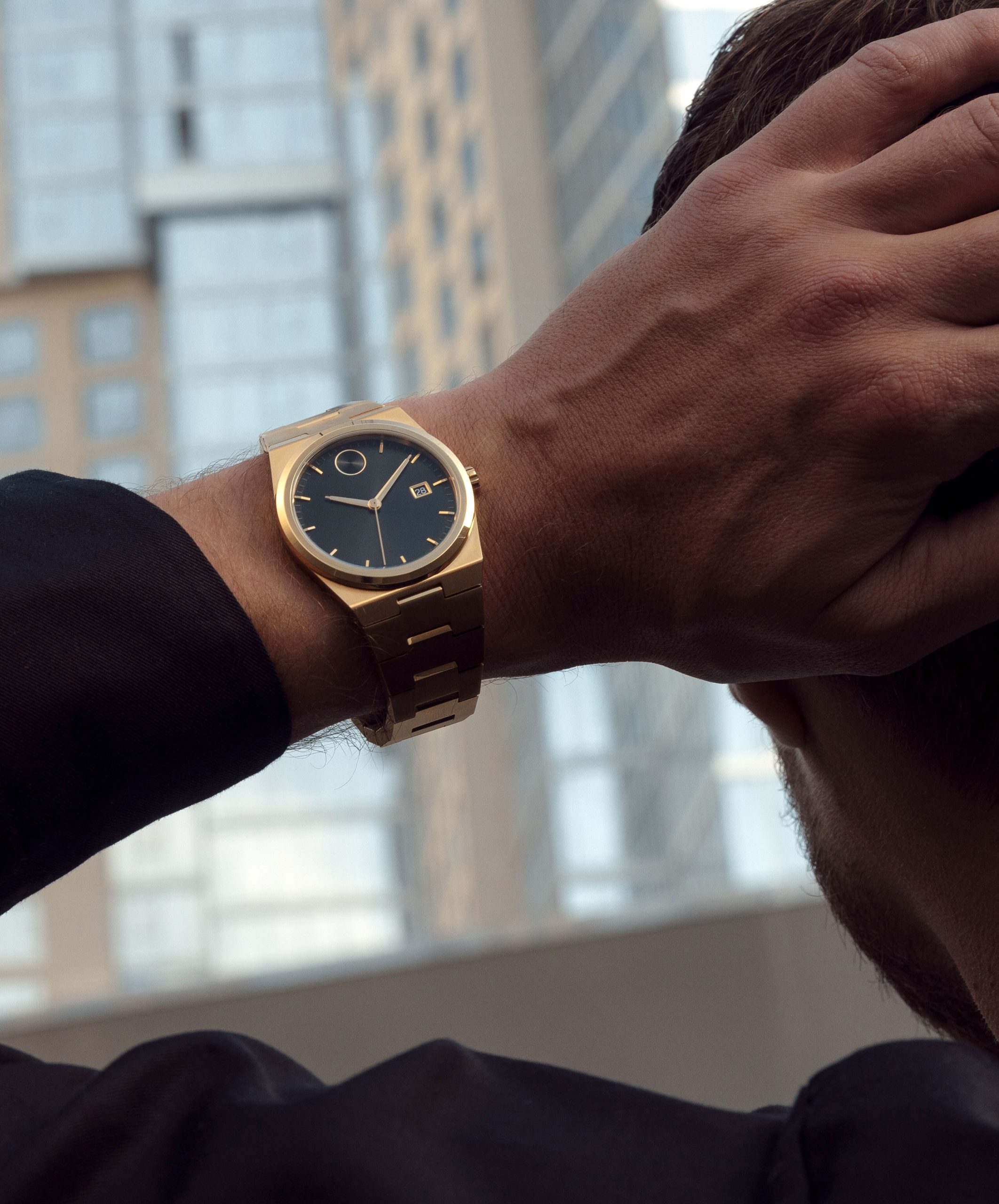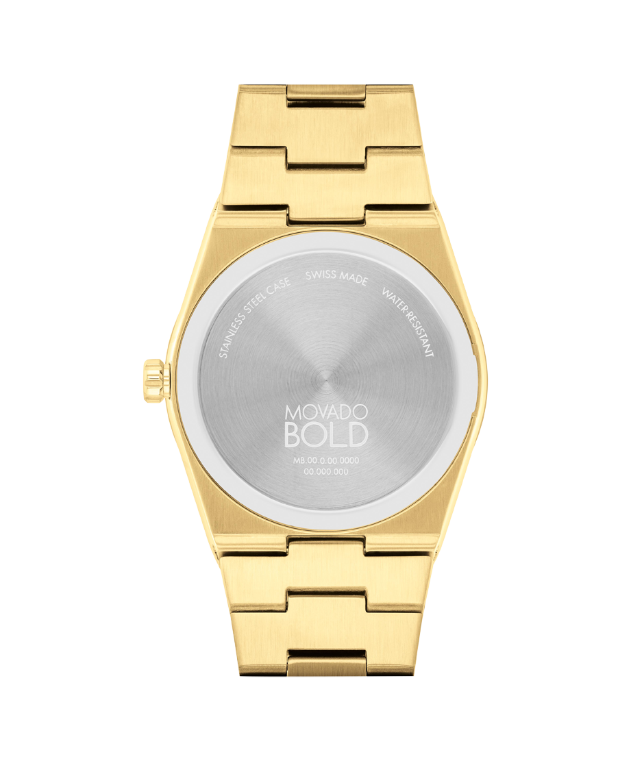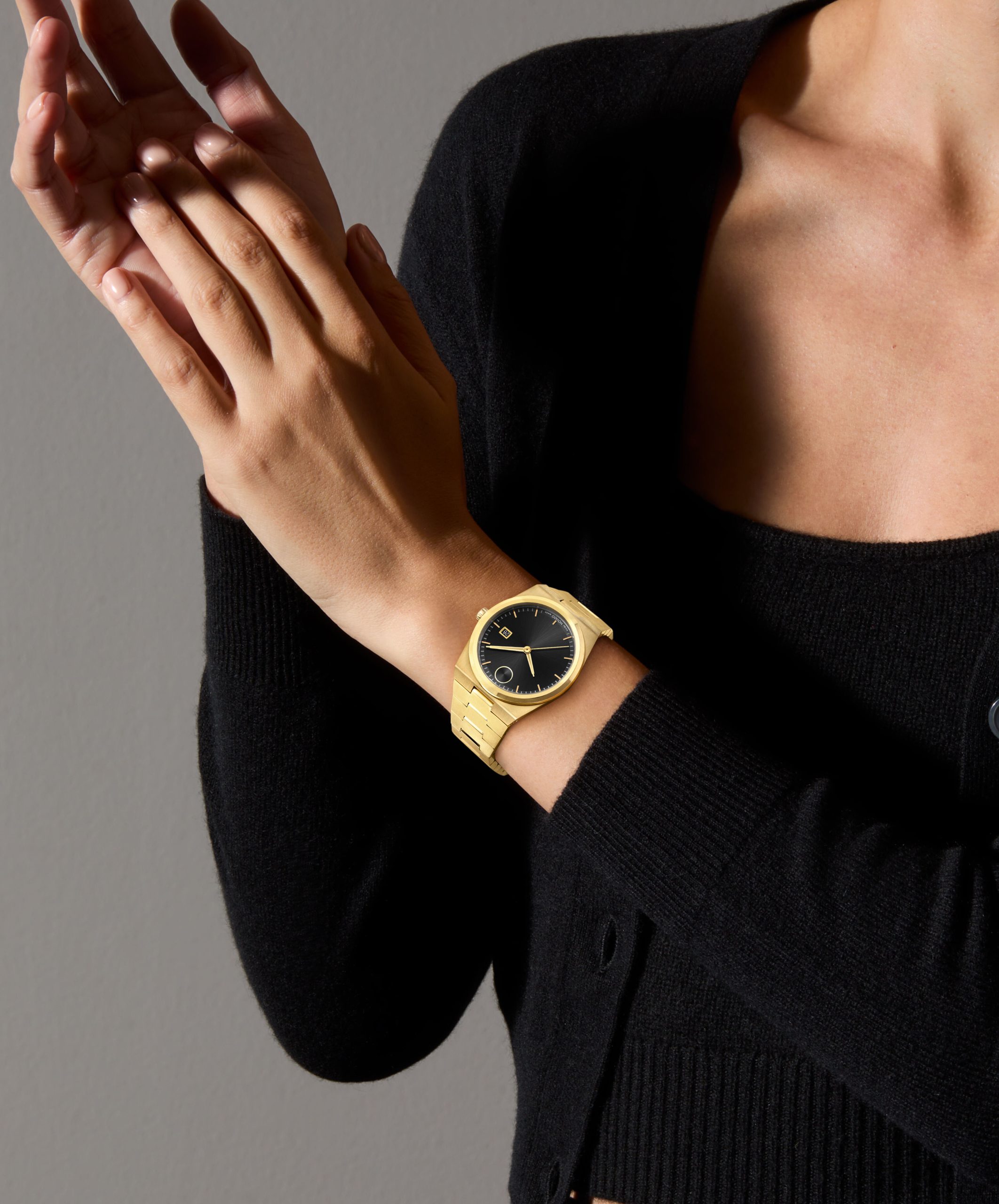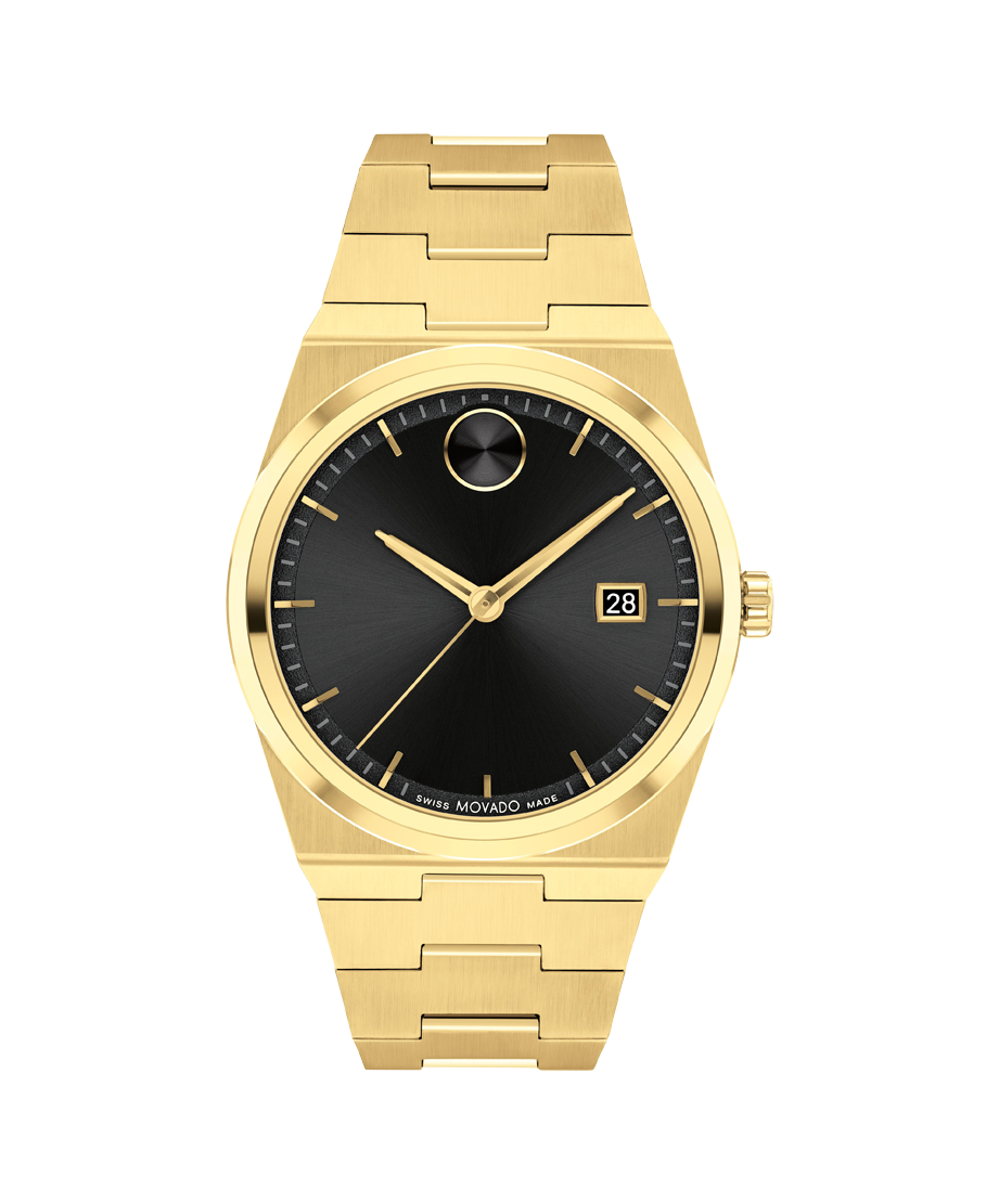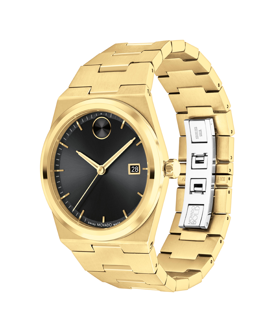 The BOLD Quest looks to the future with a shaped case and an integrated bracelet. This 40mm watch features a black sunray dial, yellow goldtone hands, and our signature dot at 12 o’clock.
