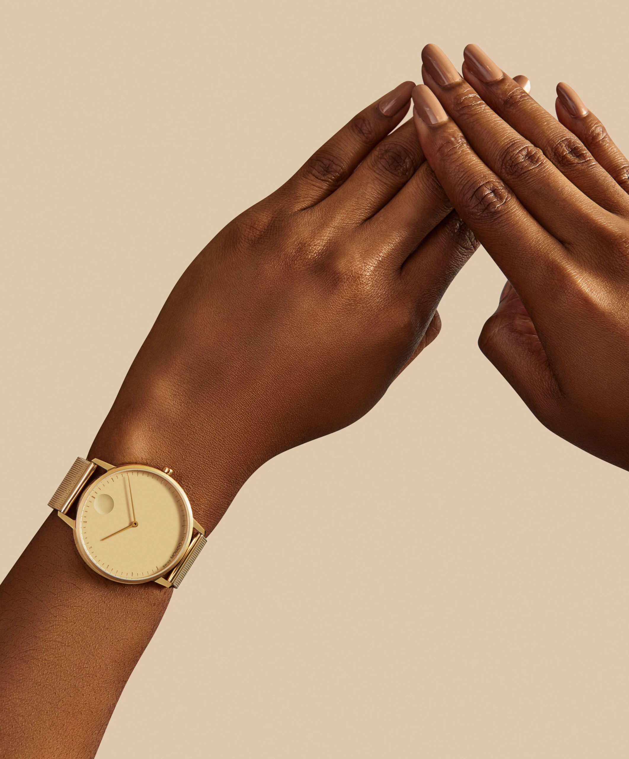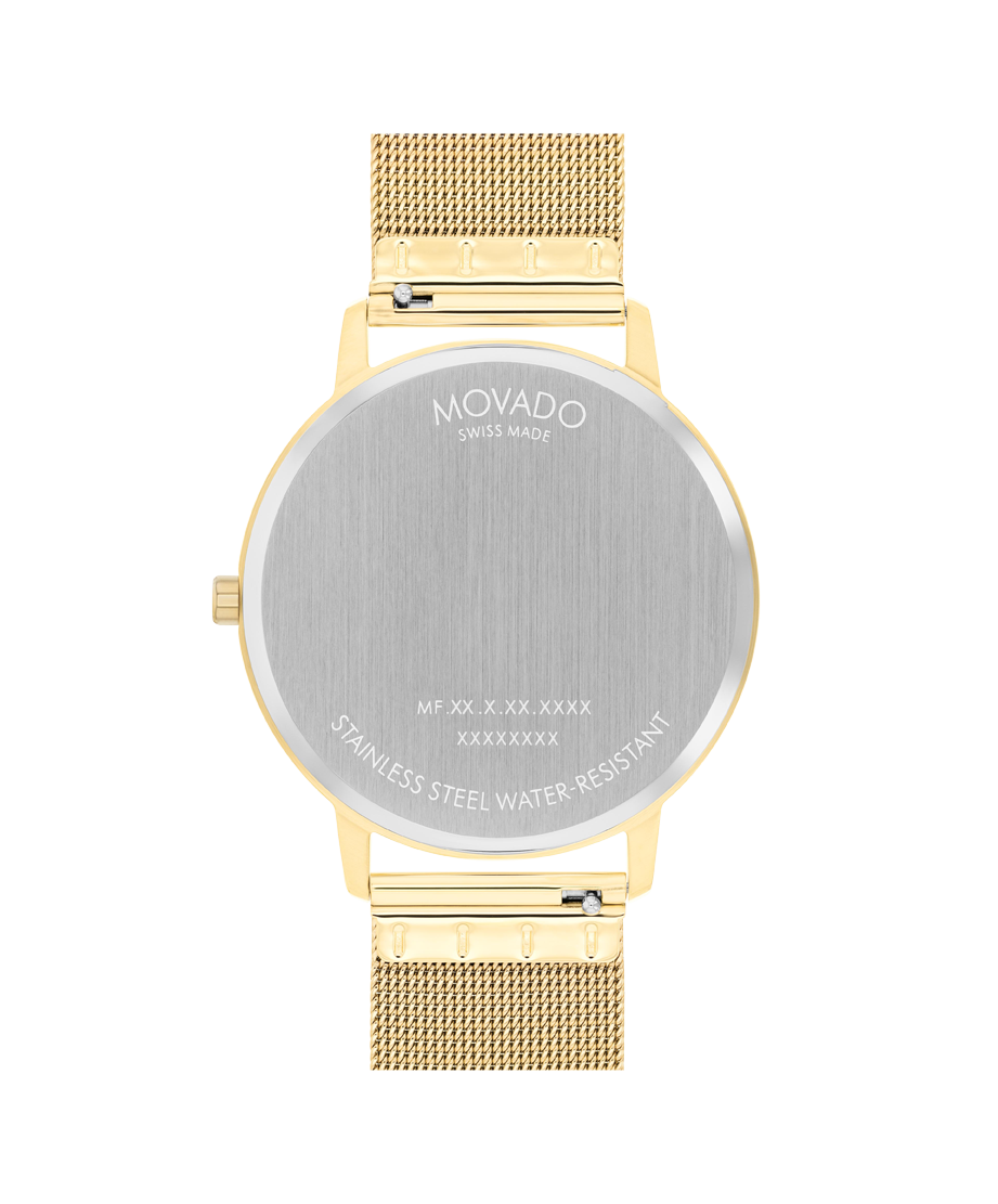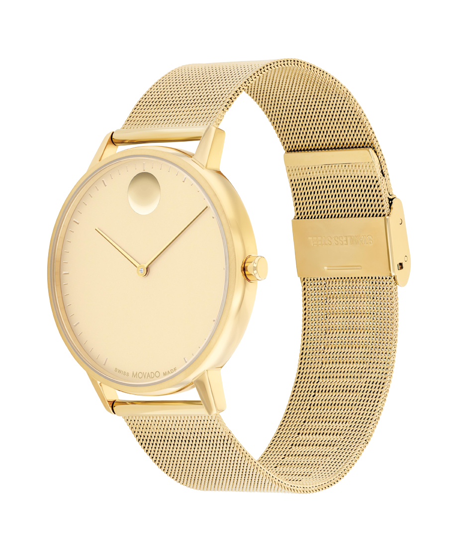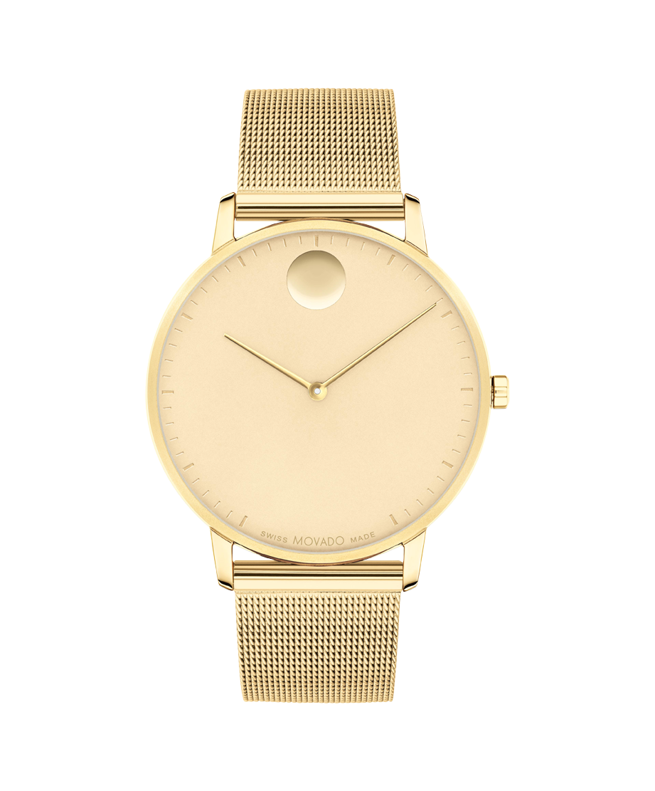 Movado Face, 41mm pale yellow gold ion-plated stainless steel case on a mesh bracelet with a pale yellow gold-toned dial.