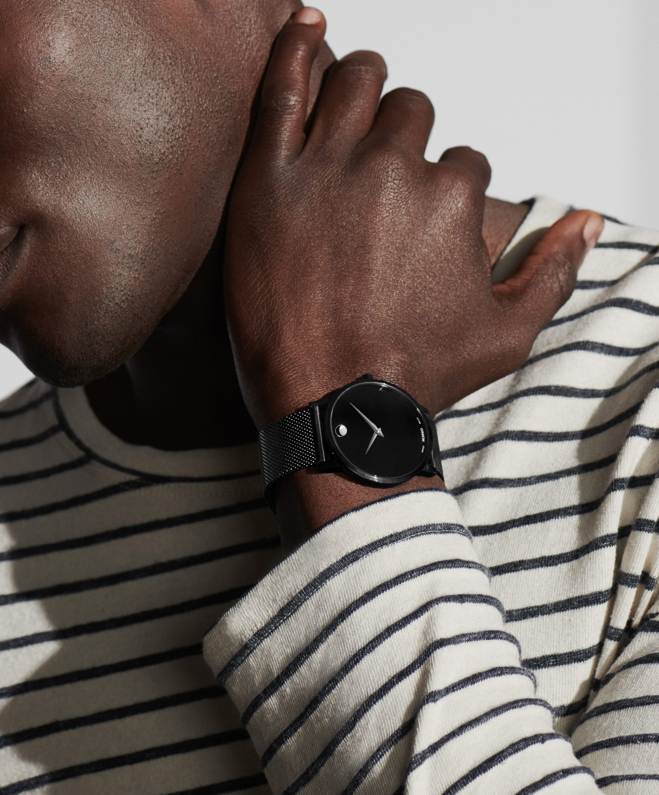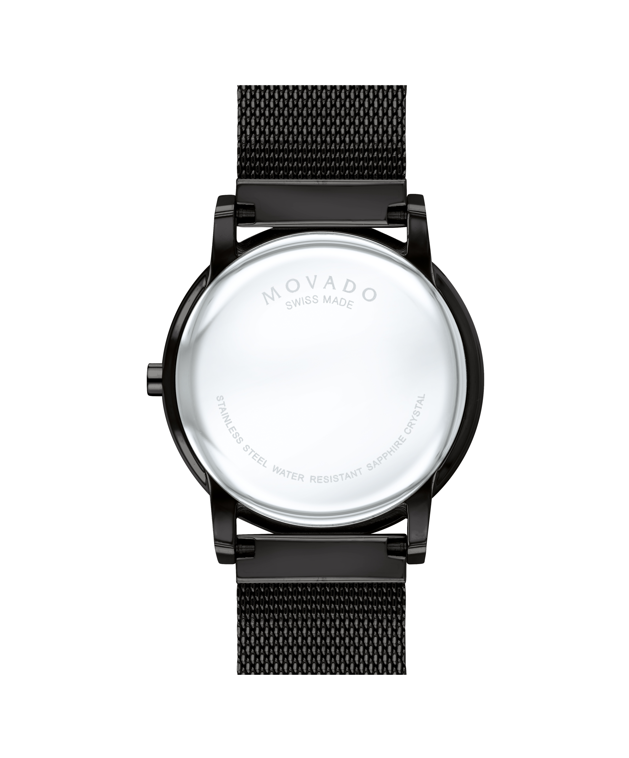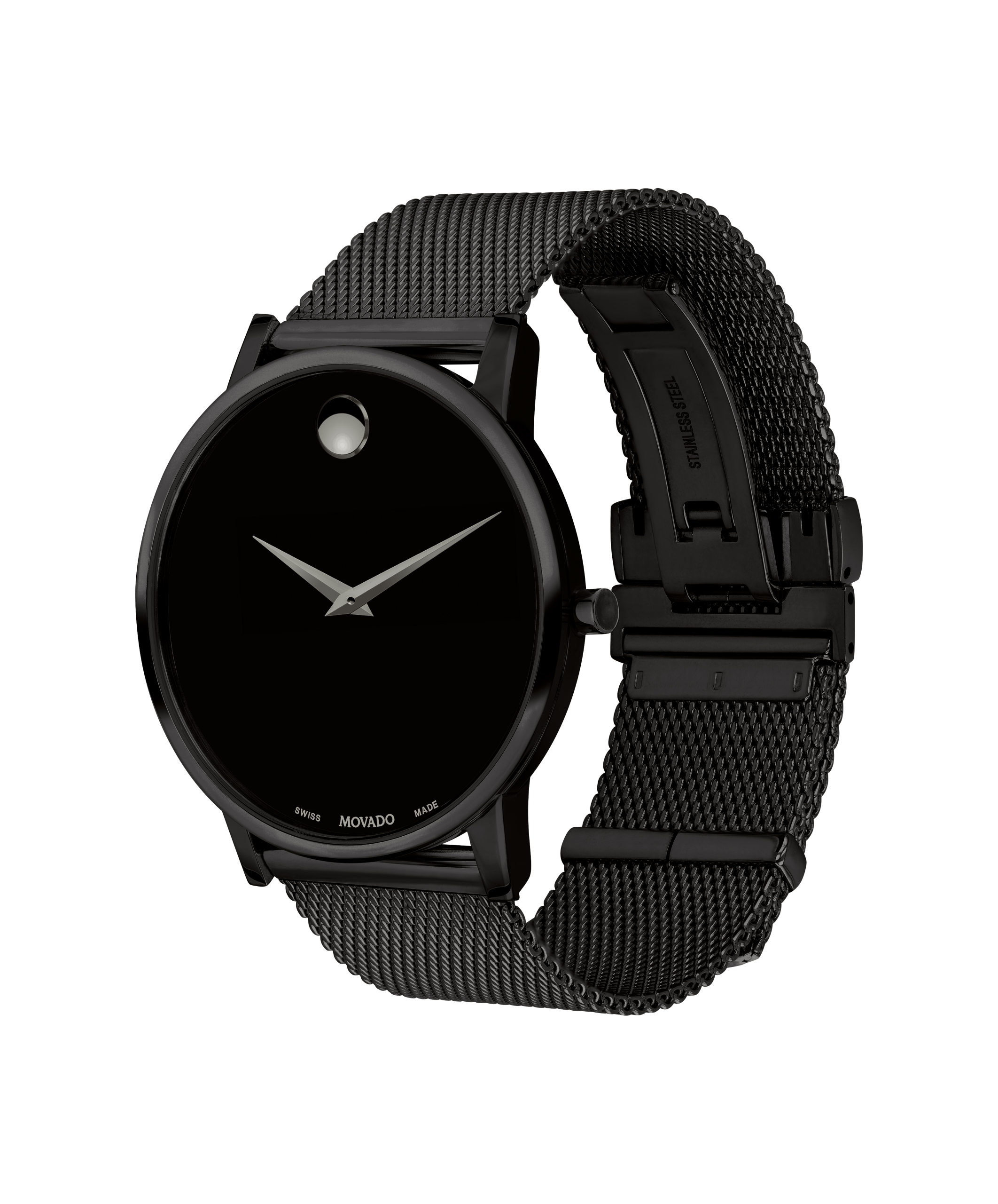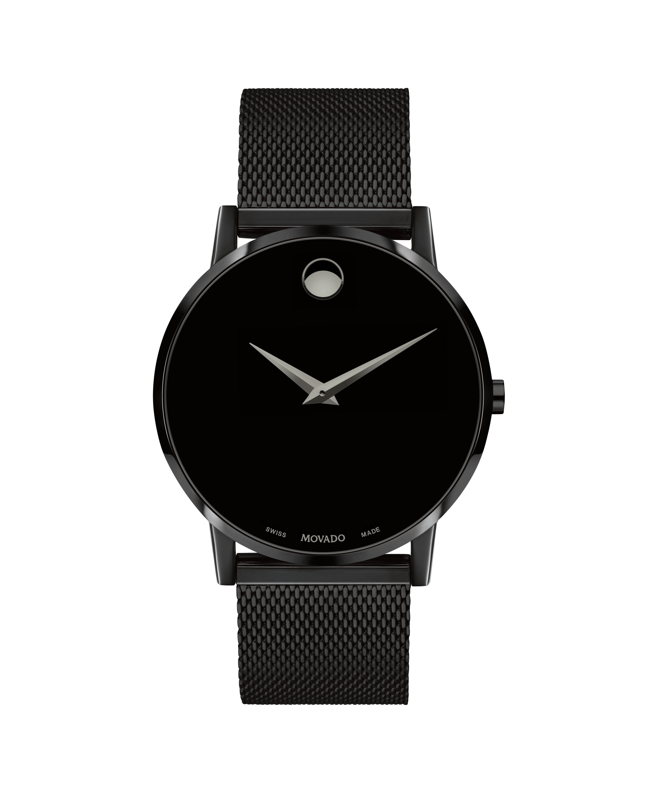 Movado Museum Classic, 40 mm black PVD-finished stainless steel case and mesh bracelet with a black-toned dial.
