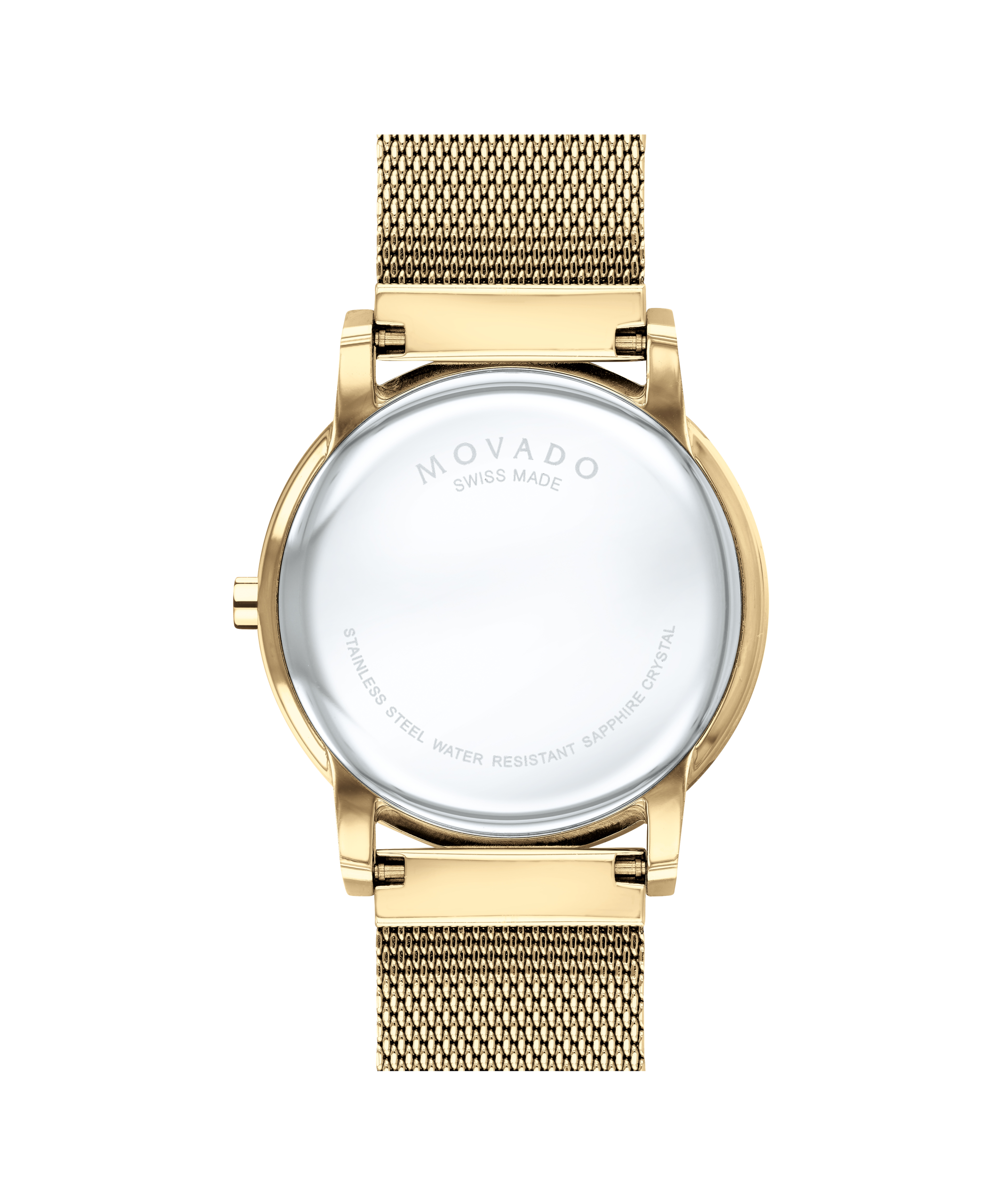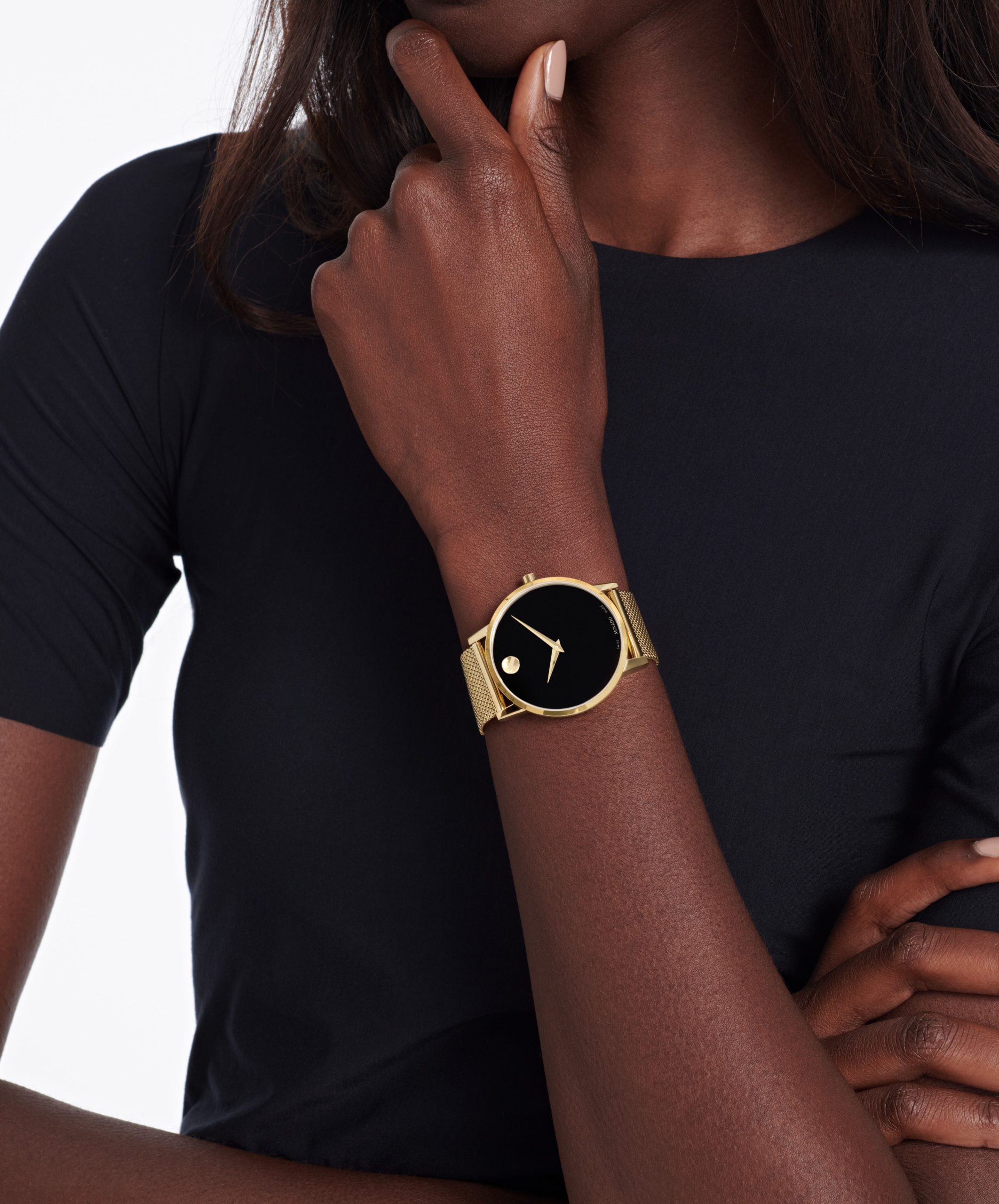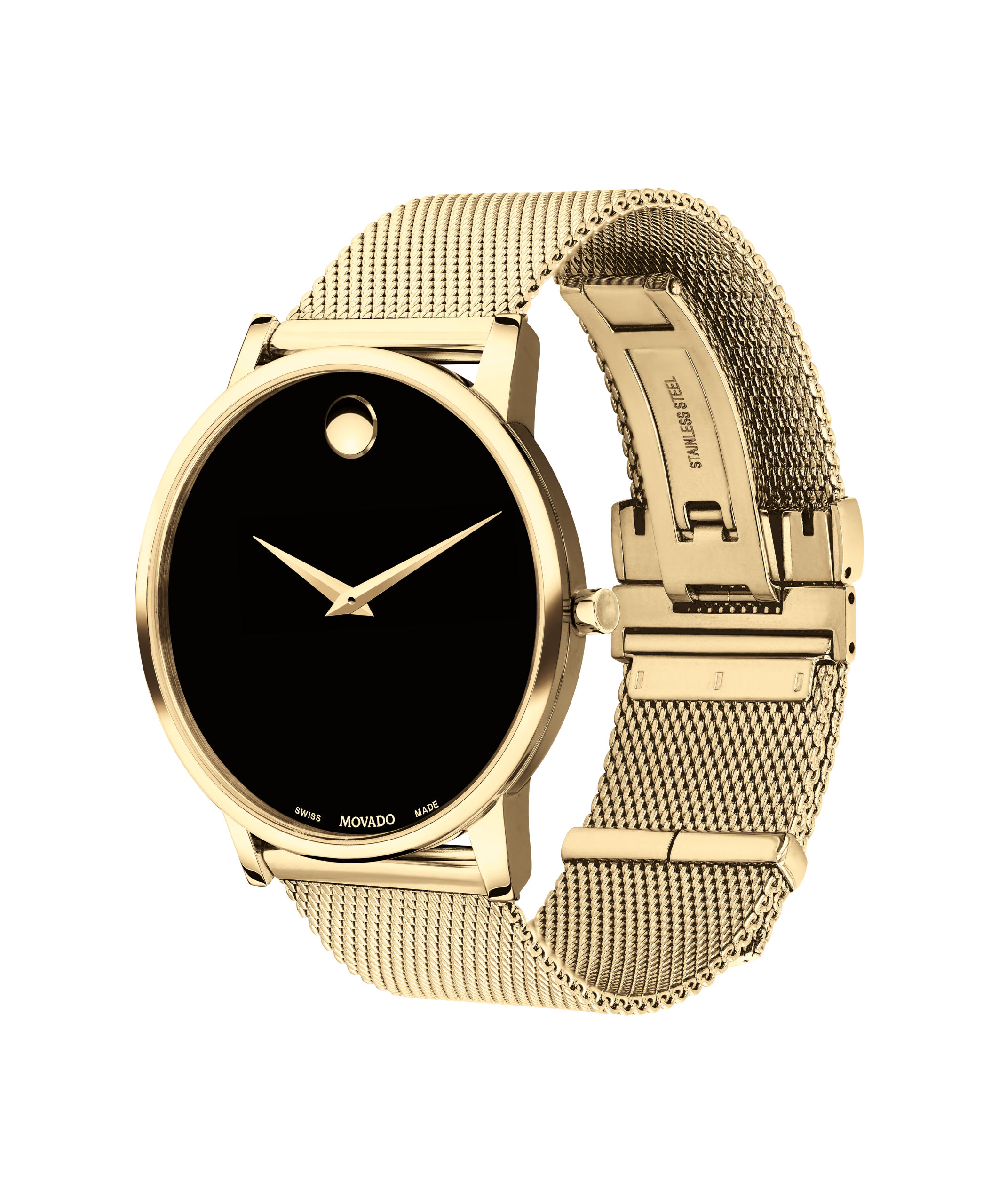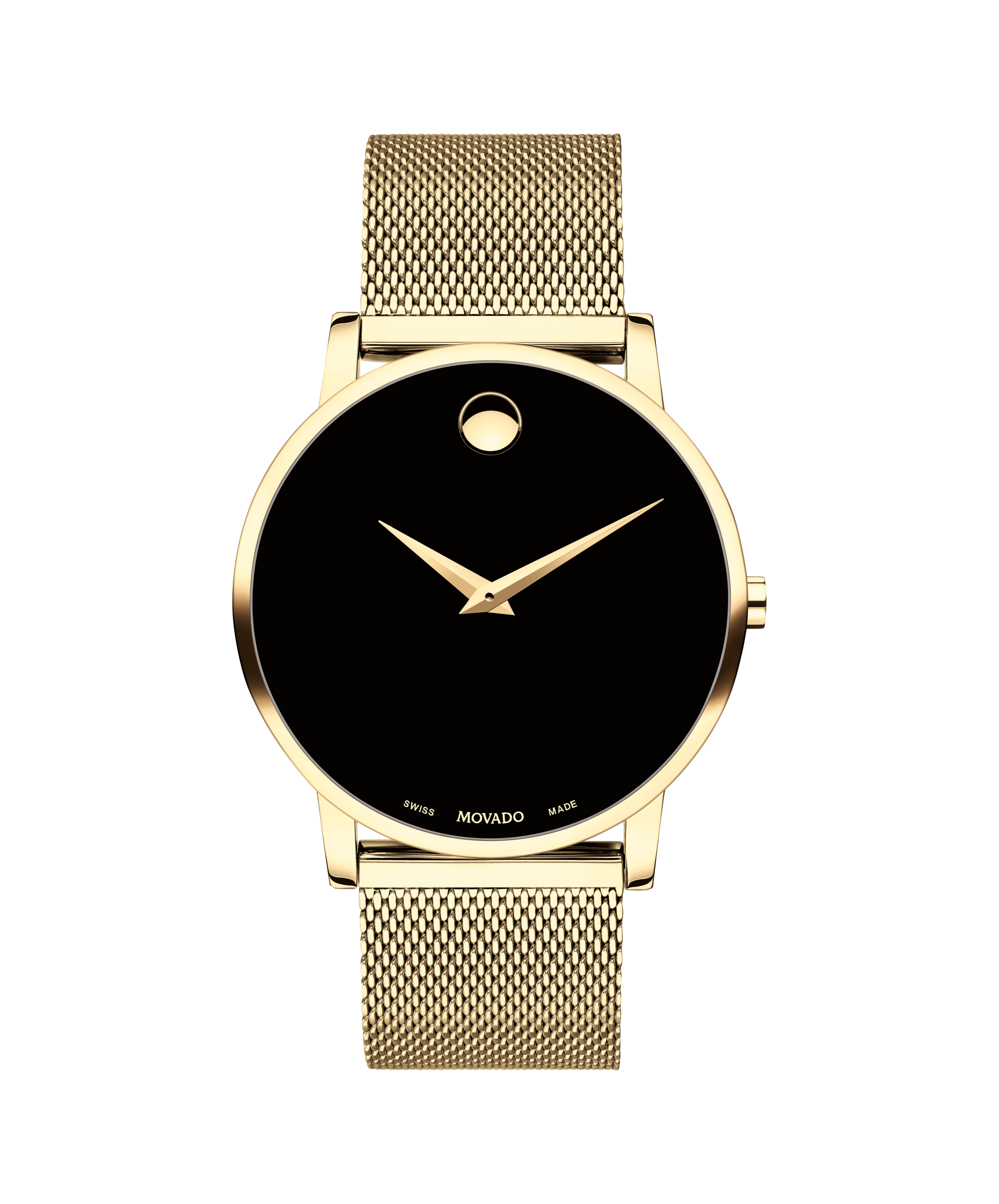 Movado Museum Classic, 40mm yellow gold PVD-finished stainless steel case and mesh bracelet with a black-toned dial.