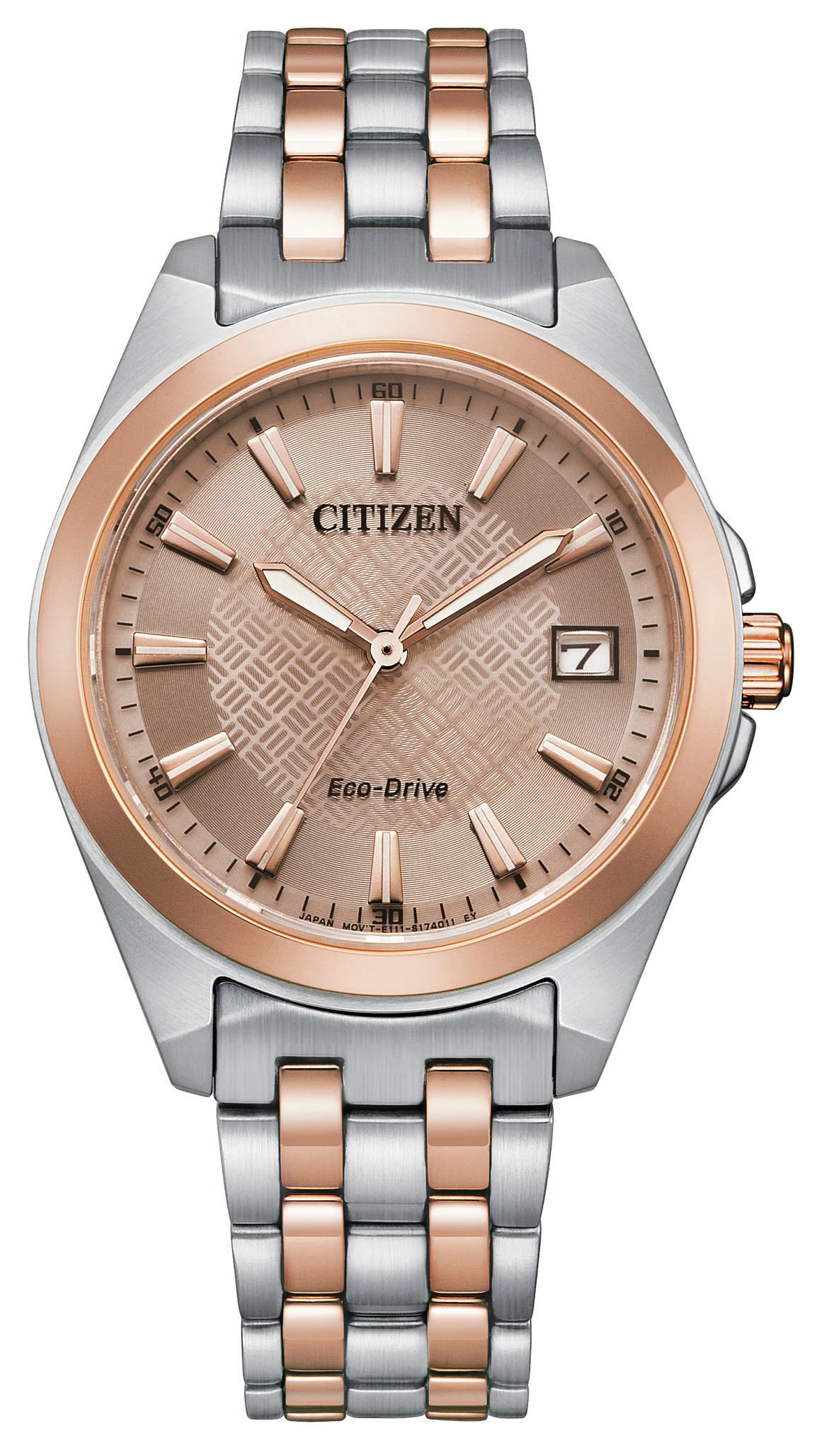 For a watch that is the perfect addition to every woman?s wardrobe, this… classic watch from Citizen has a two-tone rose-gold stainless steel bracelet, paired with a light brown three-hand dial for a unique style that is sure to stand out. Pairing function with form, the watch also uses the patented Citizen Eco-Drive technology, so it is sustainably powered by light and will never require a new battery. This women?s watch will compliment every style and will fast become your go-to accessory for every occasion.