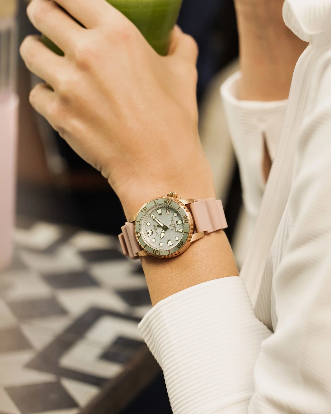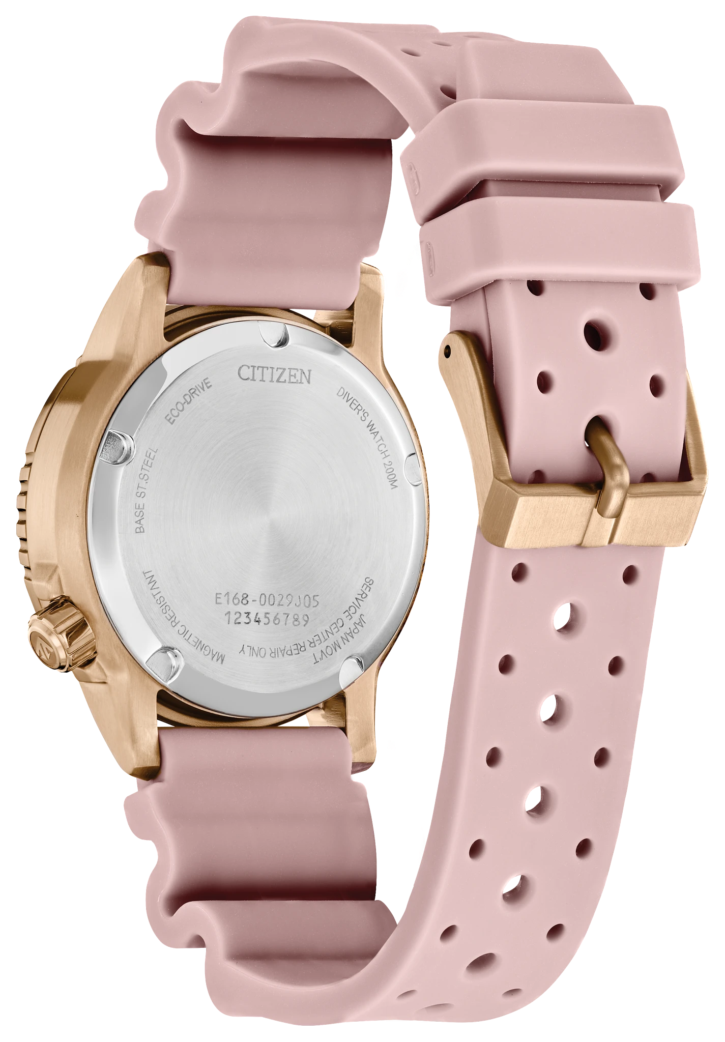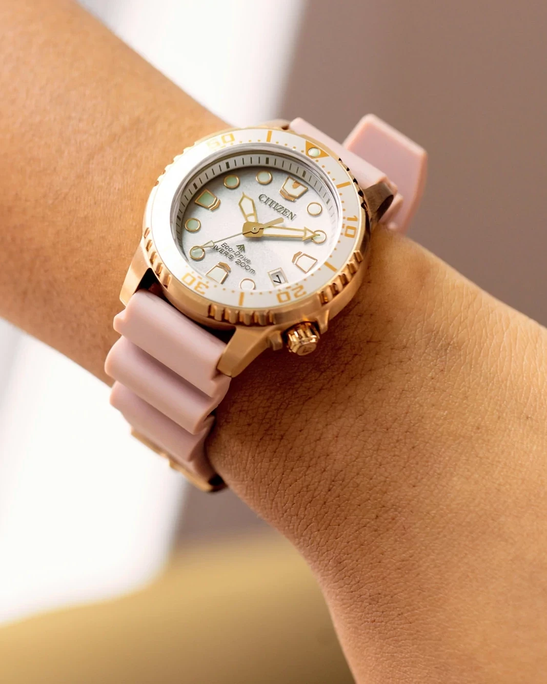 Submerge yourself in the latest Dive watch to join Citizen?s innovative… Promaster line. The new timepiece features a smaller, versatile 37mm case size with a rose gold-tone stainless steel exterior complete with an easy-grip dive bezel and screw-down crown at 4 o?clock, with the bold design secured to the wrist via a blush-tone polyurethane strap. The striking white dial features oversized hands and applied markers that add to its high legibility, while accents of more rose gold hues and a bright luminous material ensure sleek styling and quick readability to even the deepest depths. At the 4 o?clock position is a thoughtful date window, adding another element of functionality to this all-purpose diver. Maintaining the robust standards of the Promaster Collection, the timepiece is water resistant up to 200 meters. Sustainably powered by any light with Eco-Drive technology that never needs a battery, this stylish dive watch also comes in an exclusive collector?s scuba tank-inspired box. Caliber E168.