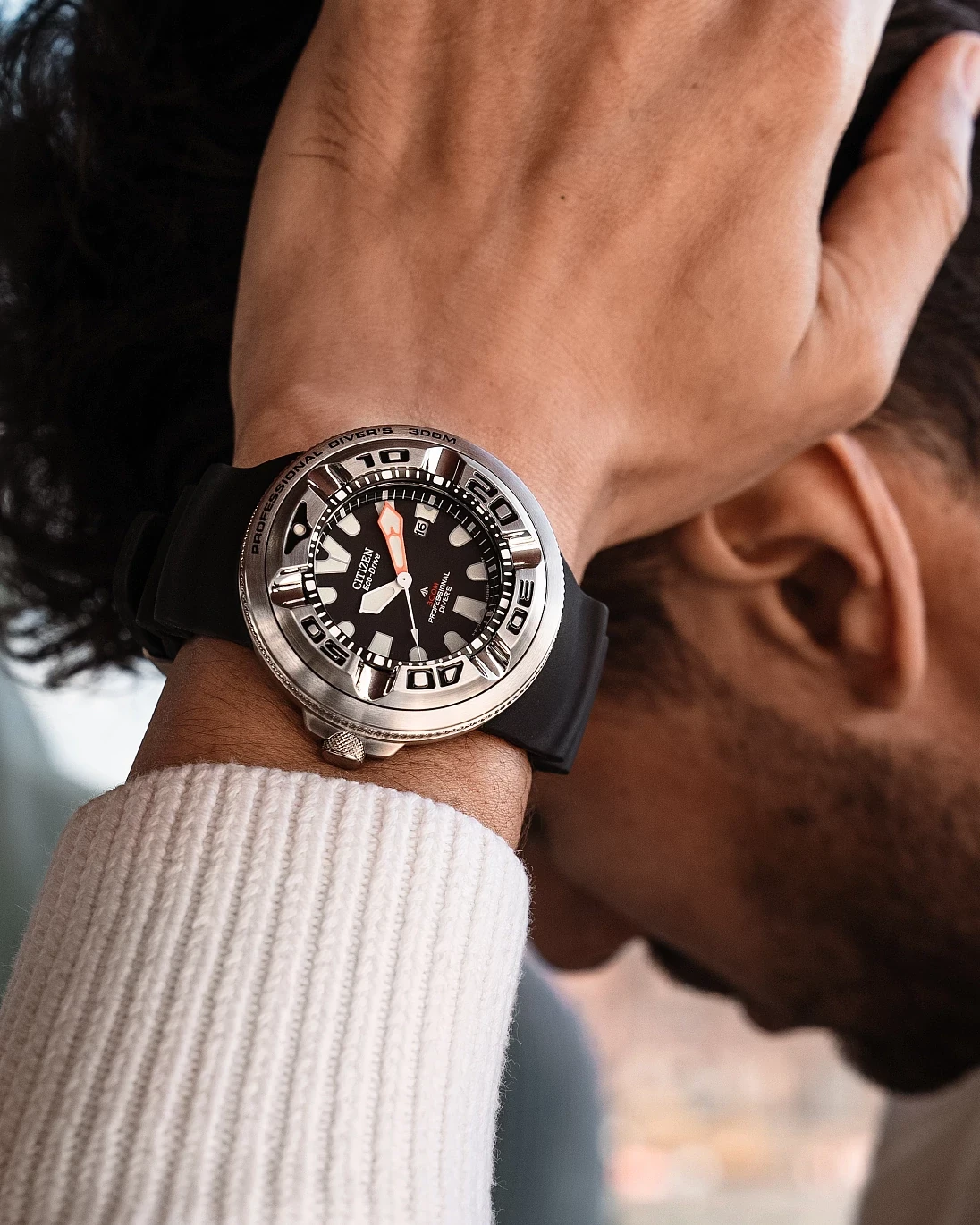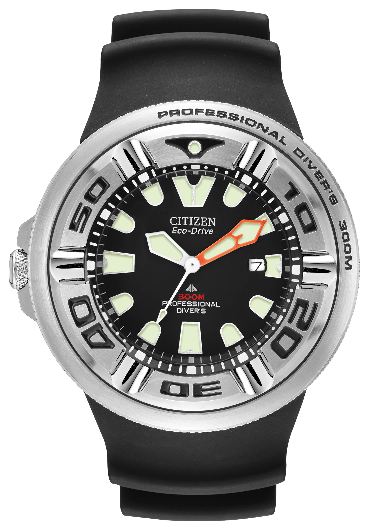 Citizen Eco-Drive Promaster Professional Diver is used for mixed gas diving with… its 6mm non-reflective curved crystal, ratcheted elapsed-time bezel, screw-back case & screw-down crown, and reinforced urethane band and extender, with a carrying case for the wetsuit strap extension. Crafted in stainless steel with luminous accents, and 300M WR. Featuring our Eco-Drive technology – powered by light, any light. Never needs a battery. Caliber number B873.