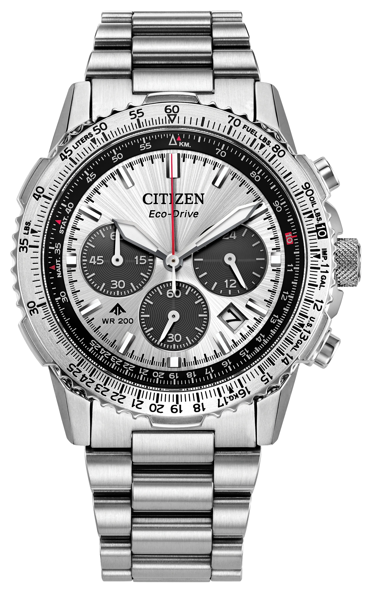 With advanced technology paired with an incredibly bold look, the latest… Promaster Air Navihawk reaches a higher altitude in style. The watch’s silver-tone stainless steel case measures 40mm in diameter, wearing boldly with its sharp faceting and satin finishing, while a slide-rule scale on the bezel provides additional flight utility. A triple-link stainless steel bracelet secures the timepiece to the wrist. On the dial, a silver-tone colorway with red, black, and white accents adds to the watch’s superior legibility, while a sapphire crystal and 200m of water resistance protect it all. Functions include a 1/5 second chronograph measuring up to 60 minutes, 12/24 hour time displays, and a date indicator, all powered by our Eco-Drive technology– sustainably powered by light and never needing a battery. Caliber B620.