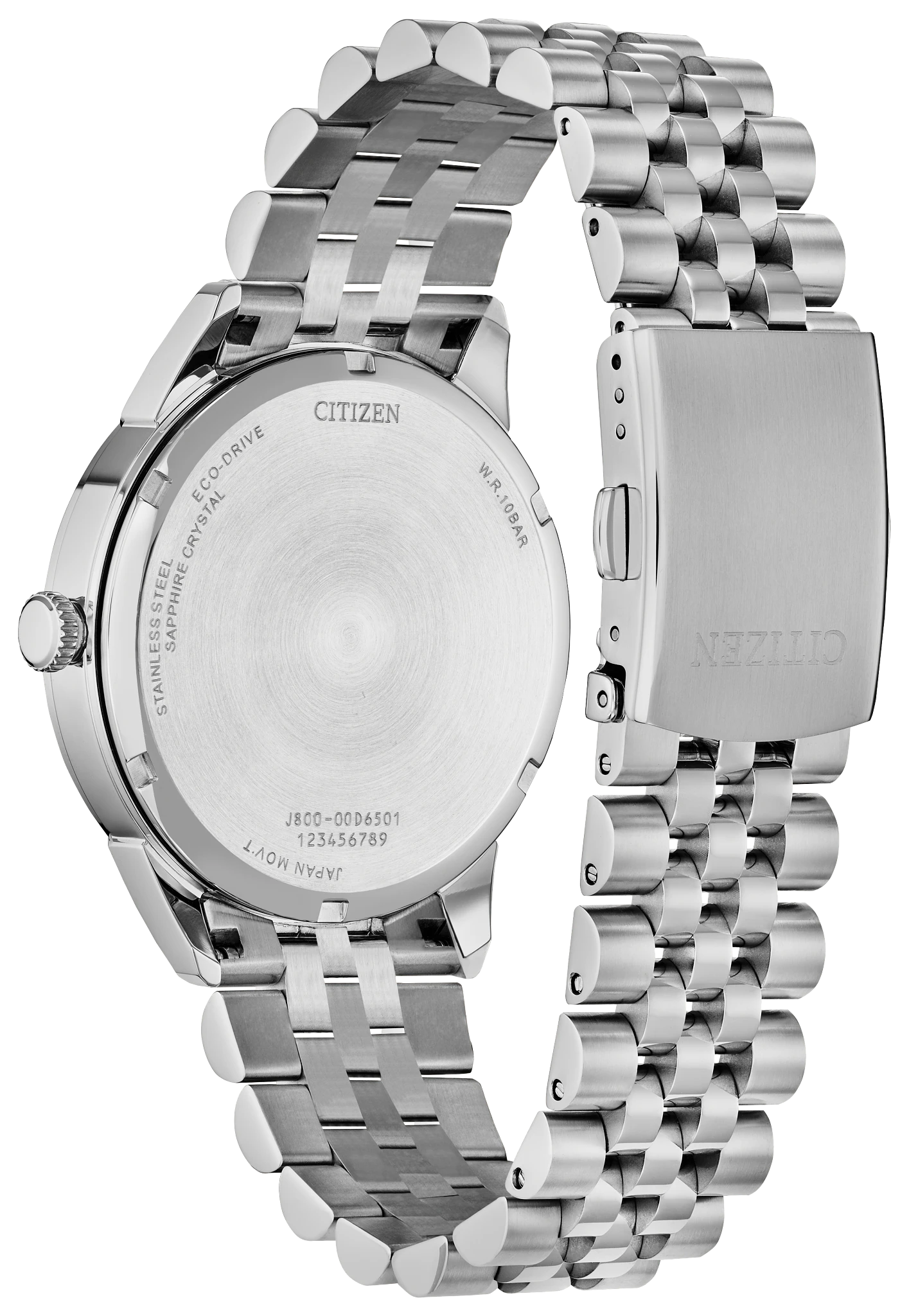 This vintage-inspired timepiece is a paragon of timeless elegance. With a… 40.5mm, silver-tone stainless steel case and matching five-link bracelet, the new Rolan features a blue dial with a gradient effect. Applied silver-tone accents and Arabic numerals at the quarter hours add to its charm, while day and date indicators on opposite sides of the top and bottom of the dial place the watch firmly in the realm of retro-style. The watch features Citizen’s Eco-Drive technology – sustainably powered by light, any light, and never needs a battery. Water resistant to 100 meters. Caliber J800.