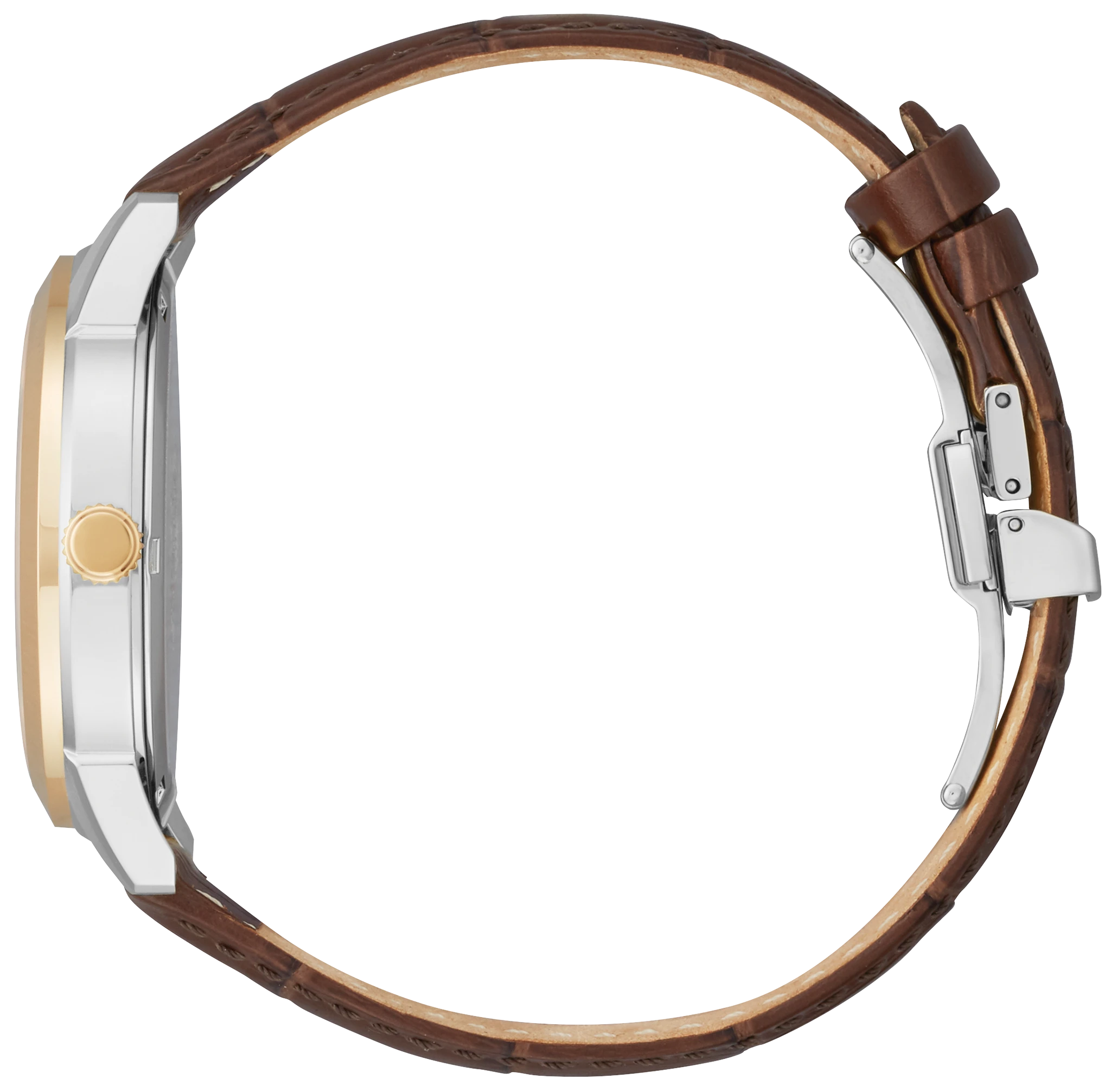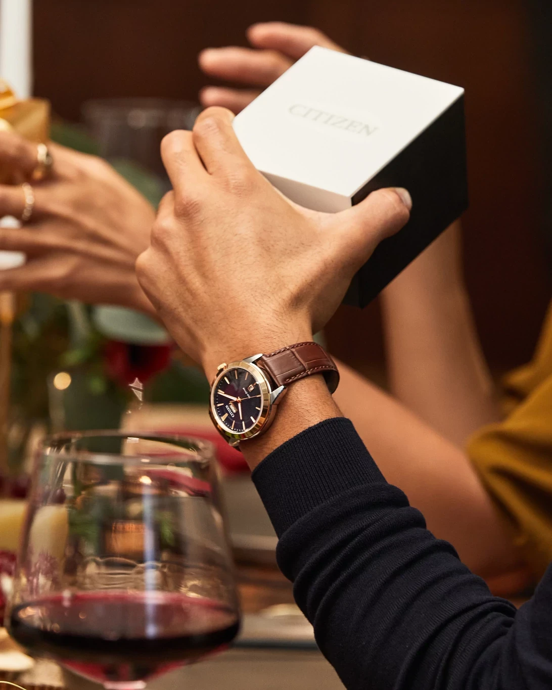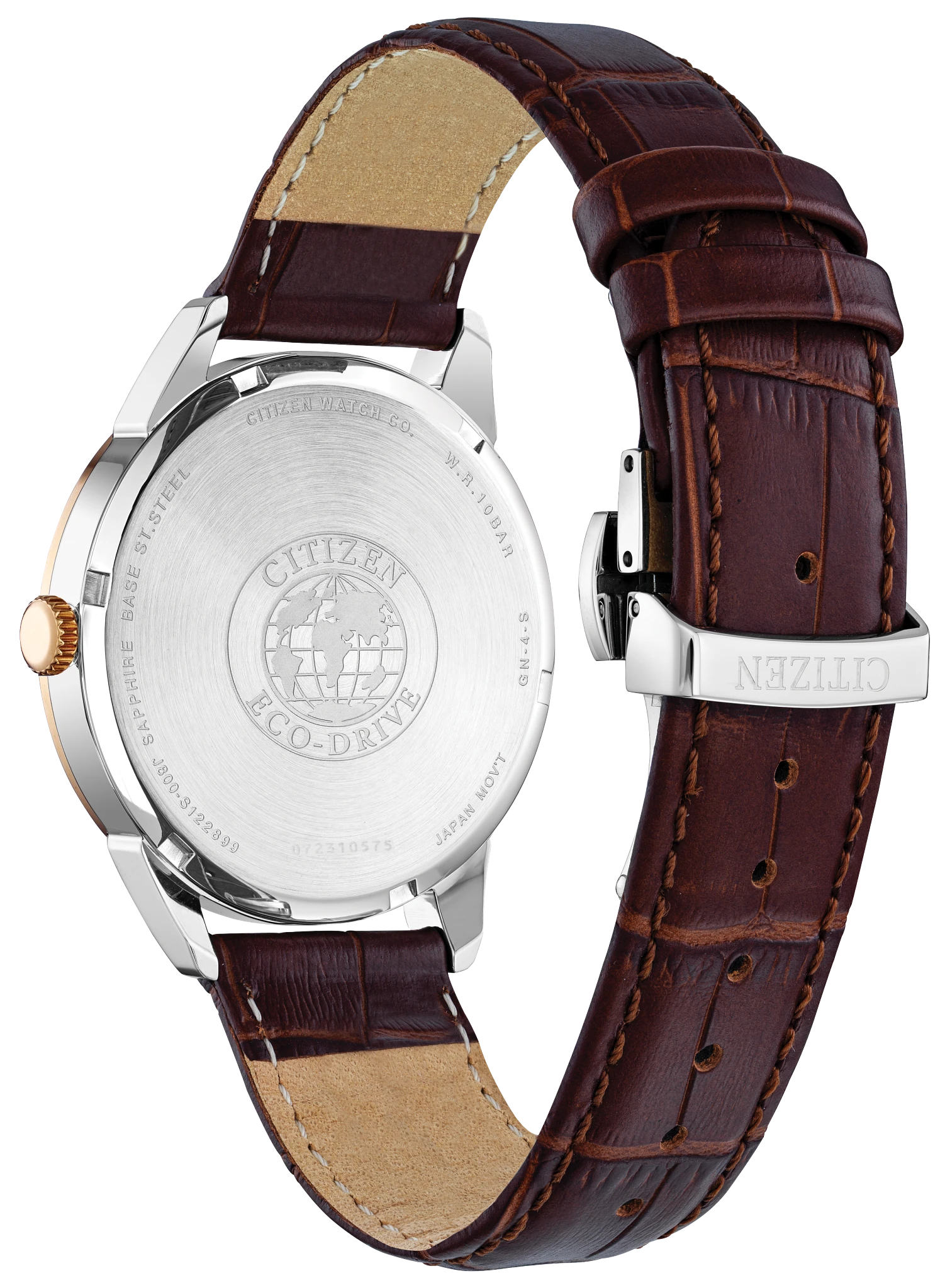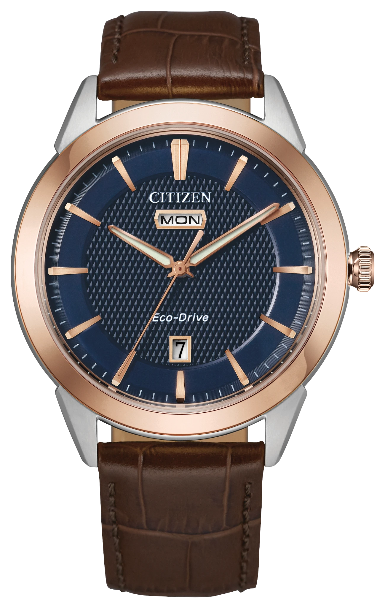 With a 40mm, stainless-steel rose-gold tone case and brown leather strap,… Citizen?s Rolan watch is a paragon of timeless elegance. This vintage-inspired timepiece has a navy dial, rose-gold accents and uses Eco-Drive technology, so it is powered by light ? any light. It also tracks the date, making it a functional, stylish addition to any wardrobe.