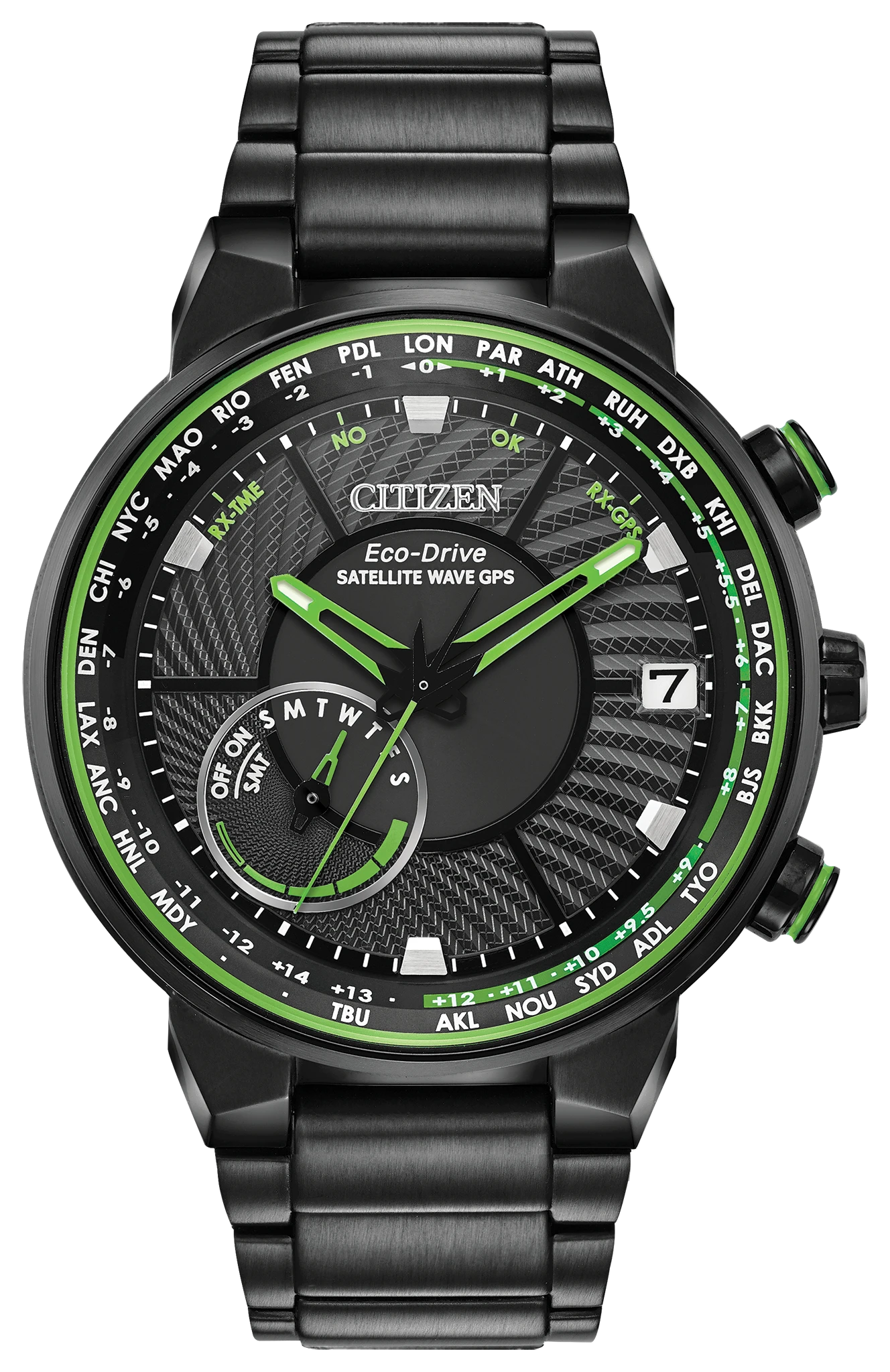 Bolder and brighter. Enhanced technical and architectural design; the new… Citizen Satellite Wave GPS Freedom is the leader of the pack with the world’s fastest timekeeping signal reception speed from GPS navigation. A sleek black ion-plated stainless steel case and bracelet, black dial and brilliant green accents featured satellite GPS timekeeping technology with worldwide reception and time adjustment in 40 time zones. Powered by Eco-Drive technology – powered by light, any light. Never needs a battery. Caliber number F150.