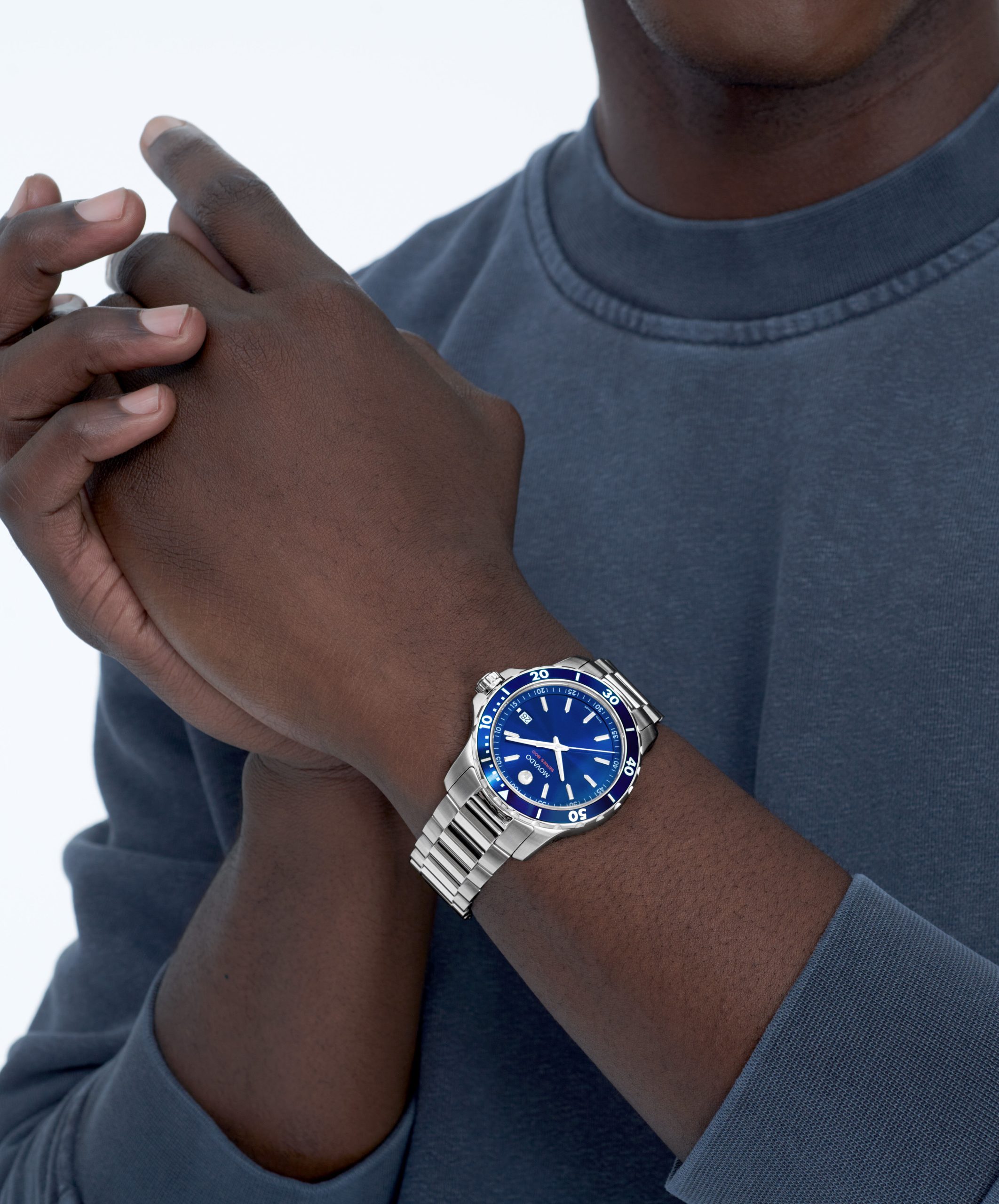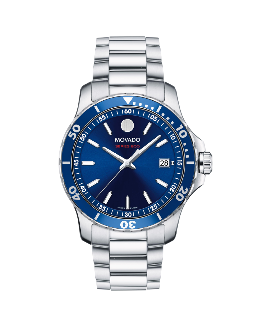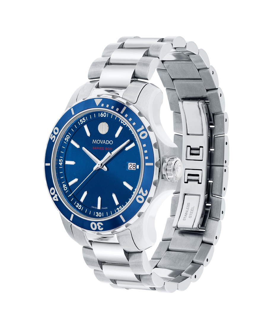 Movado Series 800, 40 mm Performance Steel case and bracelet with blue-toned dial.