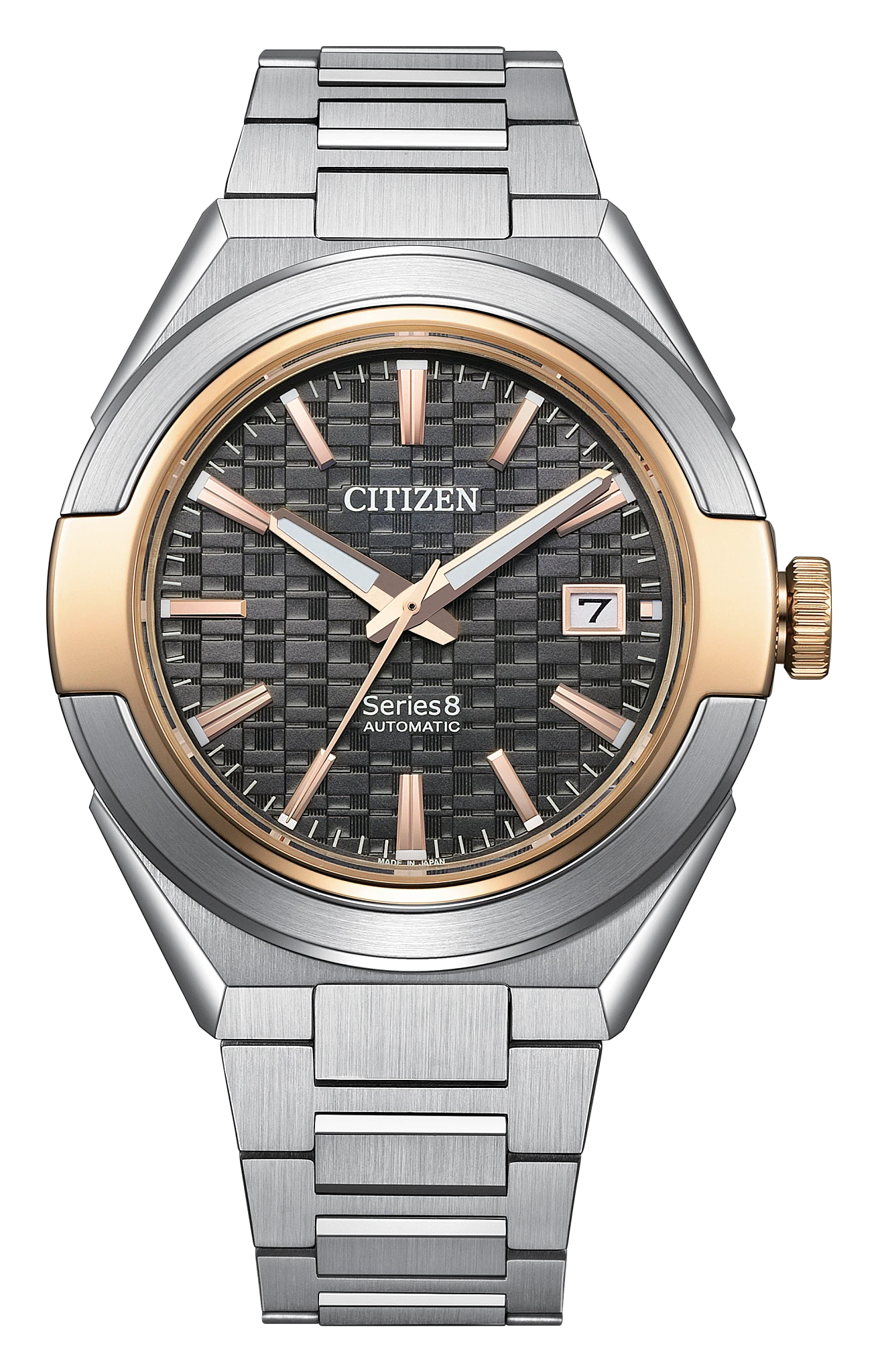 Powerful. Distinct. Refined. The new Series8 870 is ready for any occasion,… featuring a 40.8mm two-tone, faceted stainless steel case alongside the best of Citizen’s brushed and polished finishing techniques. Water resistant to 100m and able to withstand magnetic fields up to 16,000 A/m, the watch is powered by the high-performance Caliber 0950. The automatic movement is visible through a sapphire exhibition case back and is capable of maintaining an accuracy of -5 / +10 seconds per day with a frequency of 28,800 v/h and a power reserve of 50 hours. Together, the timepiece’s superior technical performance readily supports its elevated style. The tapered, integrated silver-tone stainless steel bracelet secures the watch to the wrist, and its design follows the aesthetic of the case in its use of polished and brushed facets. Beneath a sapphire crystal, the watch’s textured gray dial features rose gold-tone applied indices and lume-filled hands, each working together to offer incredible legibility alongside a utility-driven 3 o’clock date window.