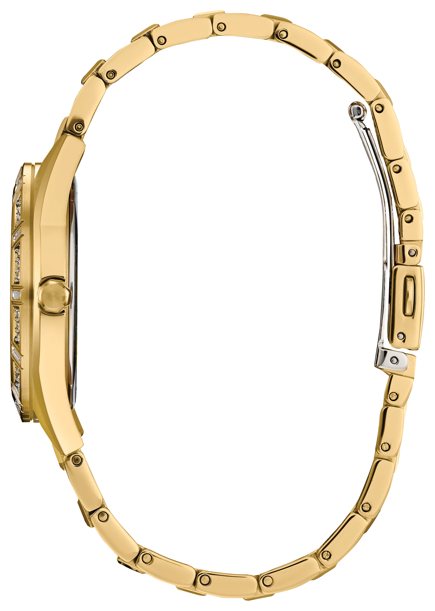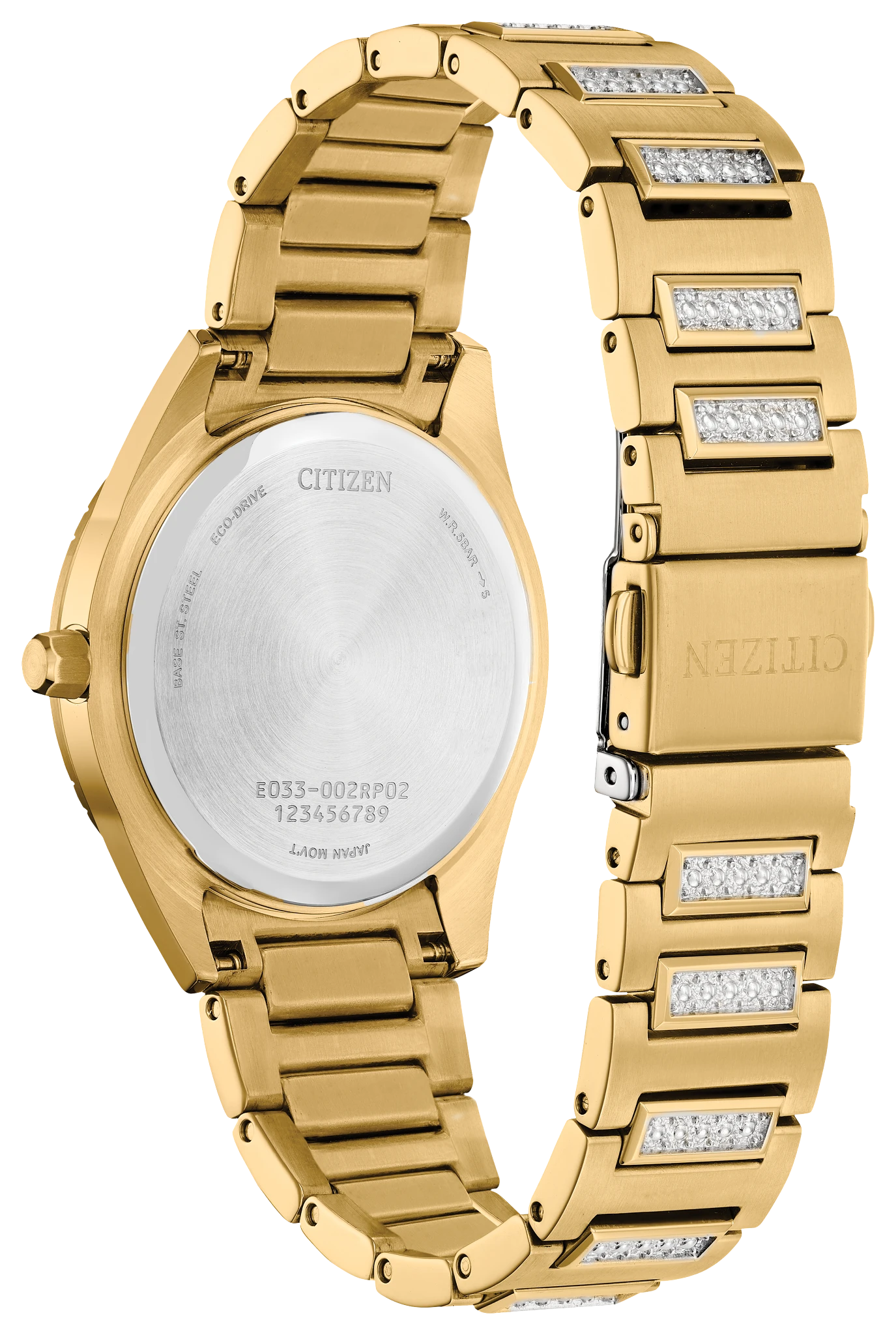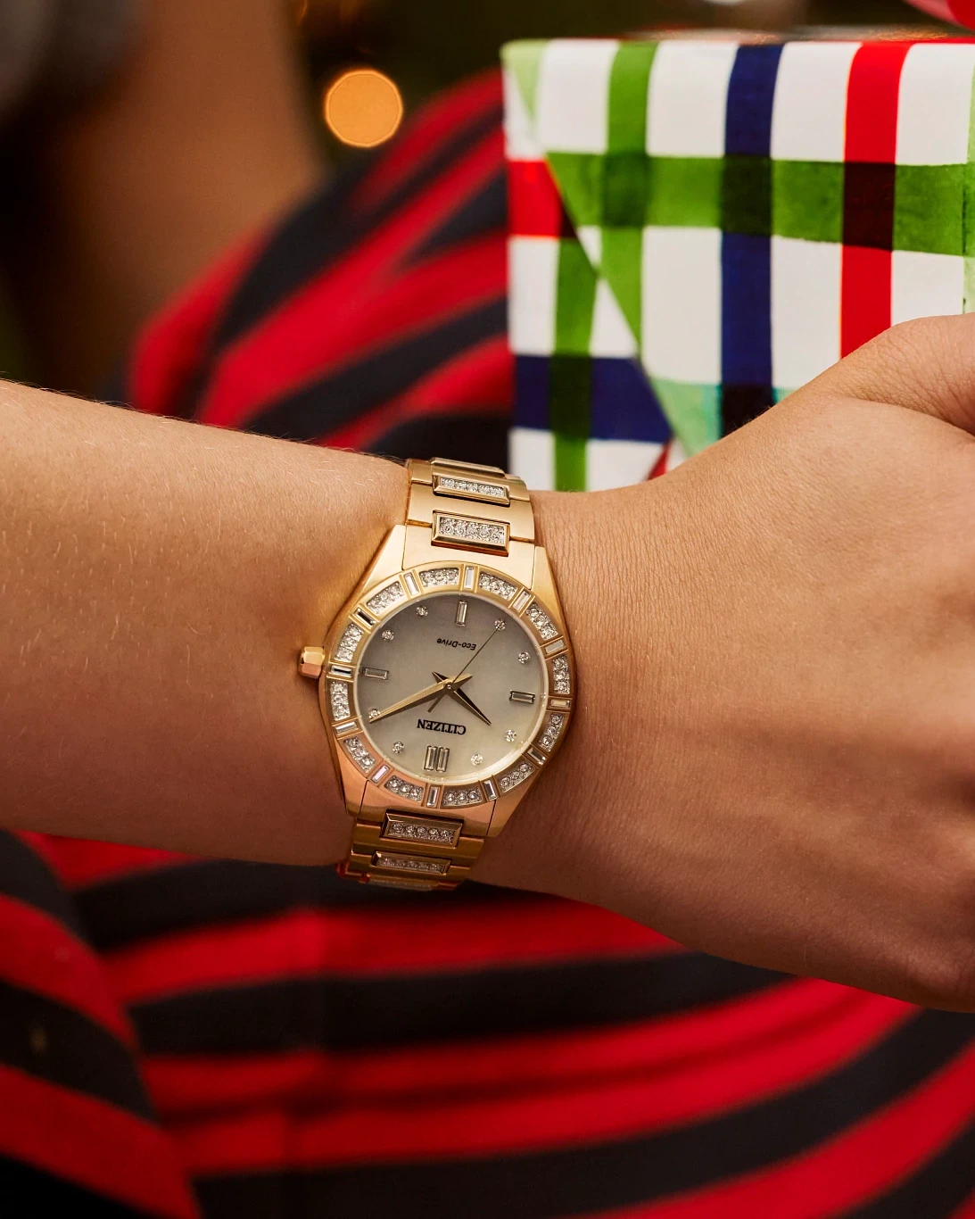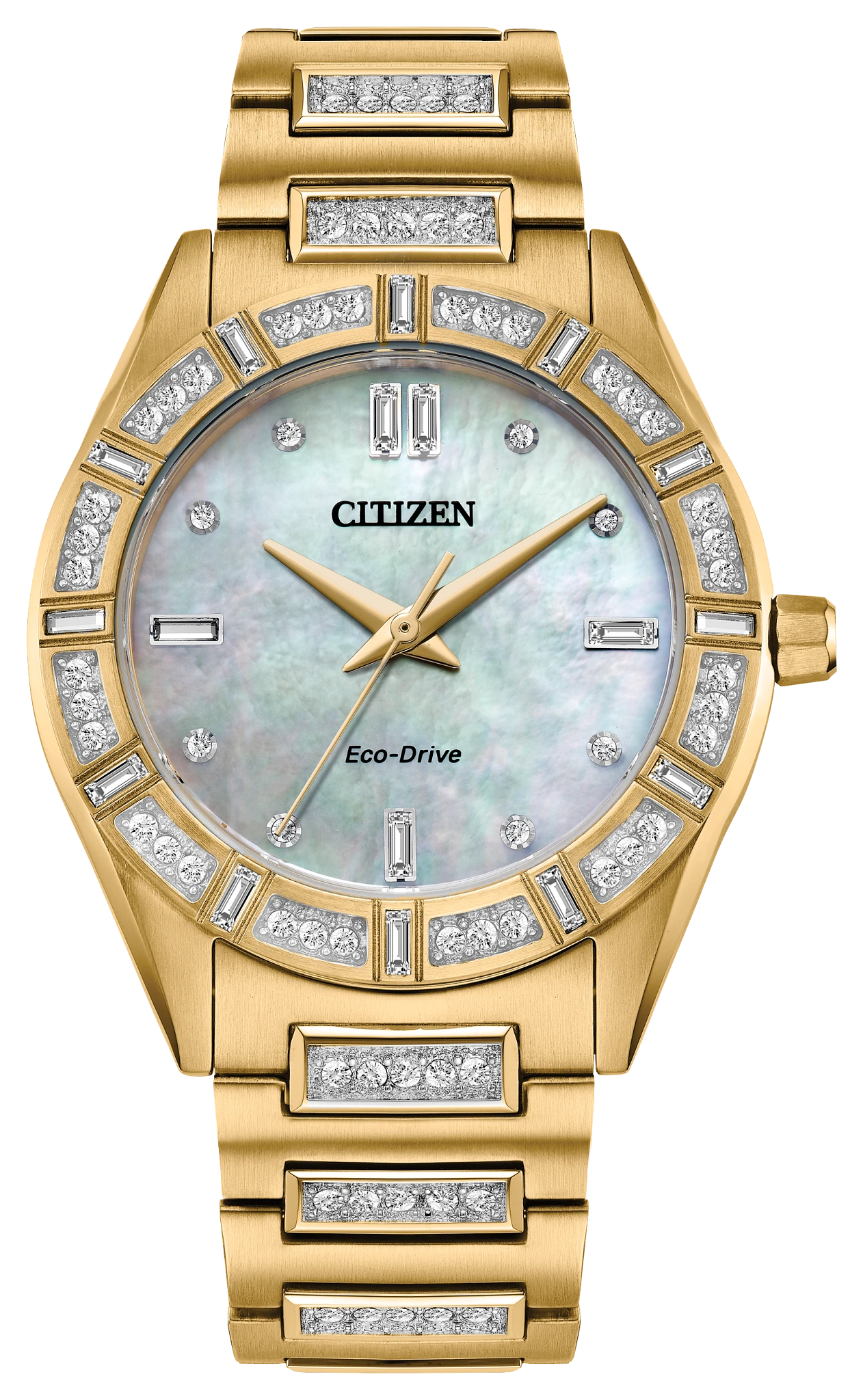 Make a brilliant style statement in the latest women?s dress watch from the… Crystal collection. This elegant timepiece shines bright with 89 crystals surrounding the gold-tone stainless steel case and bracelet. The sleek case is accented by a white mother-of-pearl three-hand dial and the bracelet fastens with a fold over clasp with push buttons. Featuring our Eco-Drive technology that?s sustainably powered by any light and never needs a battery, this fashionable watch will add sparkle to your day-to-evening look and a modern elegance to your wrist.