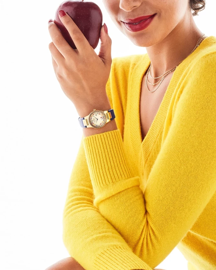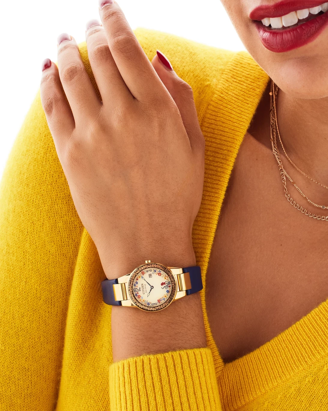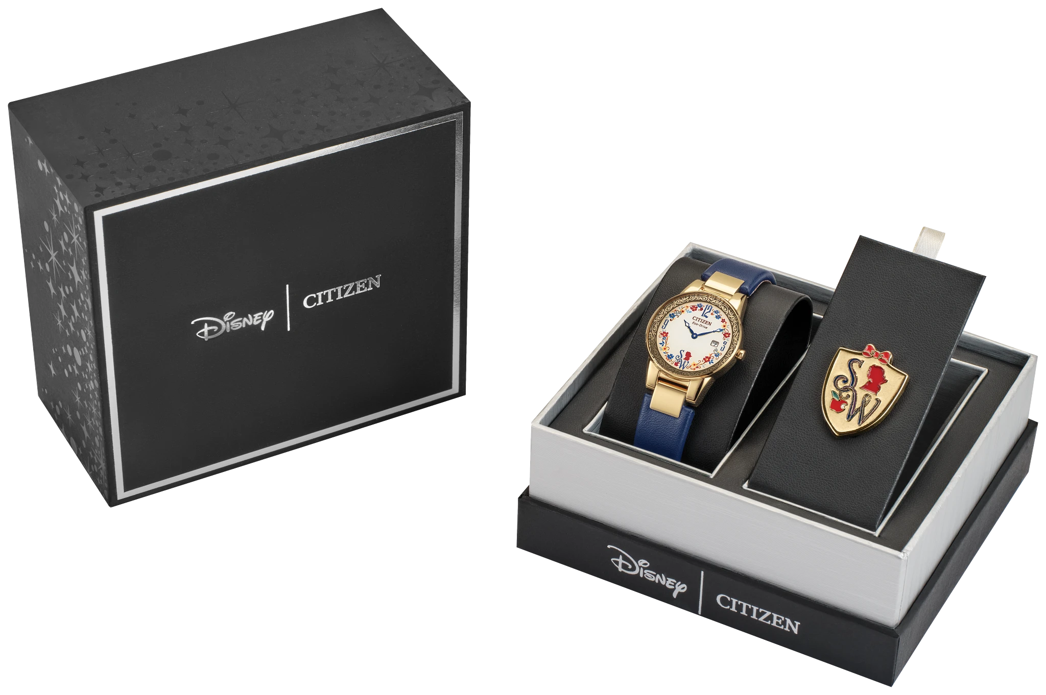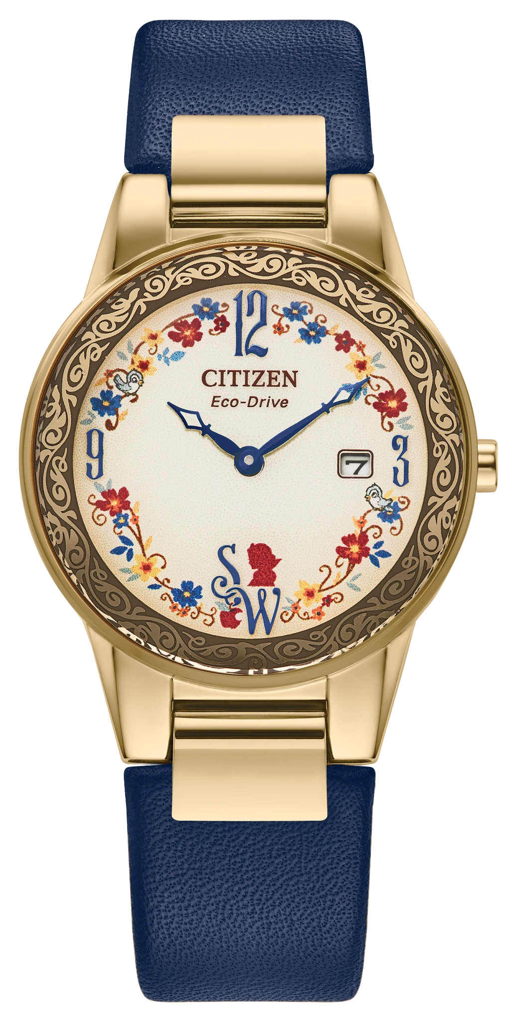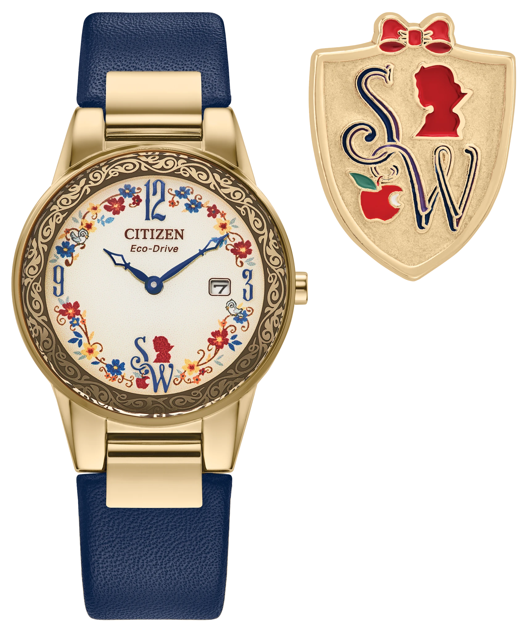 The essence of Disney?s Snow White is beautifully embodied in the new… Disney Princess Snow White Flora boxed set from Citizen, fit for a princess with a heart of gold. With her courage, kindness, and optimism, the original Disney Princess is eternally endearing. This exquisite watch features a pale gold-hued dial with a filigree border, colorful floral decorative elements, and Snow White?s monogram, silhouette, and iconic poison apple. The gold-tone stainless steel case, regal blue leather strap, and a striking coat of arms-style pin complete the look. You can also discover companion Disney | Citizen boxed sets in the related products section below. The watch is sustainably powered by light with Eco-Drive technology and never needs a battery. ?Disney