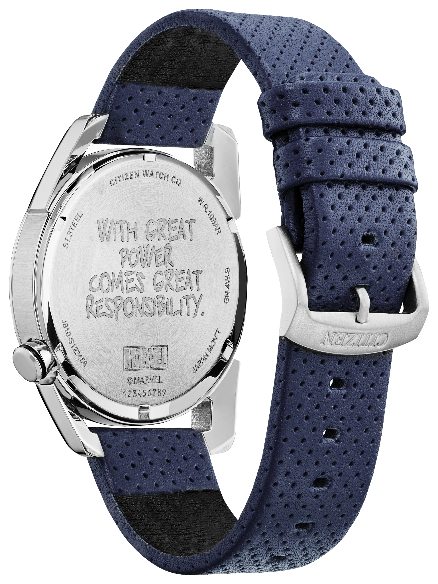 Celebrating Classic Super Hero Spider-Man, the Citizens men’s watch is sure to… be make every fan feel AMAZING! The stainless steel case uniquely features the date and crown at 4 o’clock and has an iconic red dial with blue accents. The Eco-Drive, light-powered watch features luminous hands and the date, and is finished off with a blue leather perforated strap that completes the character’s look. This Spider-Man watch will be a favorite every Marvel fan will want in their collection. © 2021 MARVEL