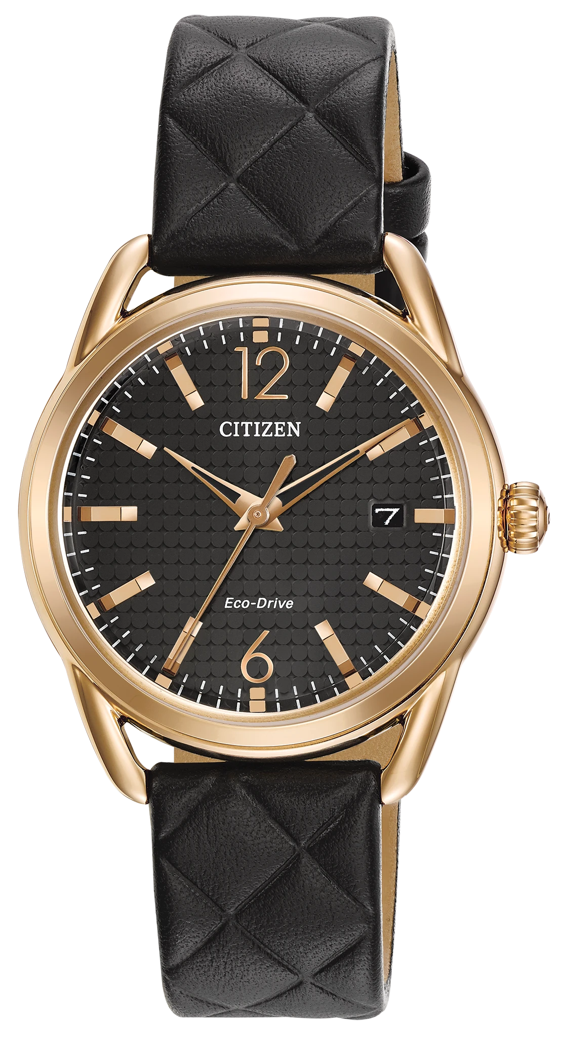 Think sleek, stylish and always on time. The brand new Drive from Citizen… collection holds affordable fashion to a new standard with this fresh new look. A watch conceived for the every day wearer, day to night, work to play. The LTR, a reliable timeless watch that is powered by the light around you with Eco-Drive technology. Featured here in a rose gold-tone stainless steel case, stylish quilted black strap, black dial and rose gold-tone accents.Featuring our Eco-Drive technology ? powered by light, any light. Never needs a battery. Caliber number J810.