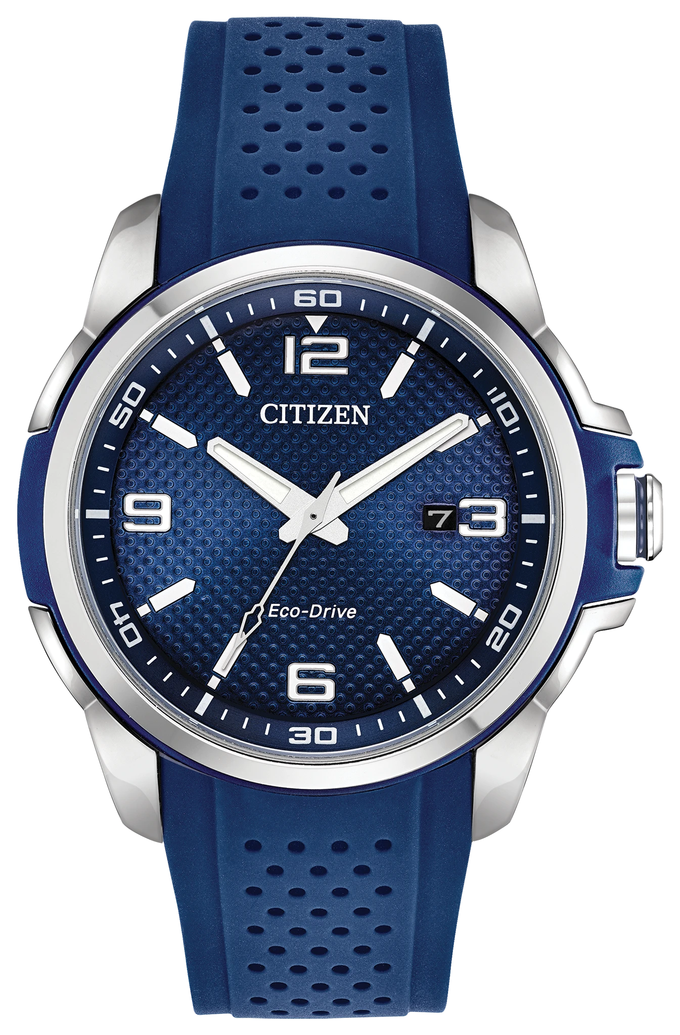 Take action and show your inner drive with the sporty styling of the CITIZEN… AR, powered by light with Eco-Drive technology. Featured with a stainless steel case with midnight blue chroma finishing accents , midnight blue polyurethane strap and dark blue dial with date. Featuring our Eco-Drive technology – powered by light, any light. Never needs a battery. Caliber number J810.