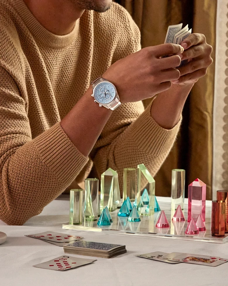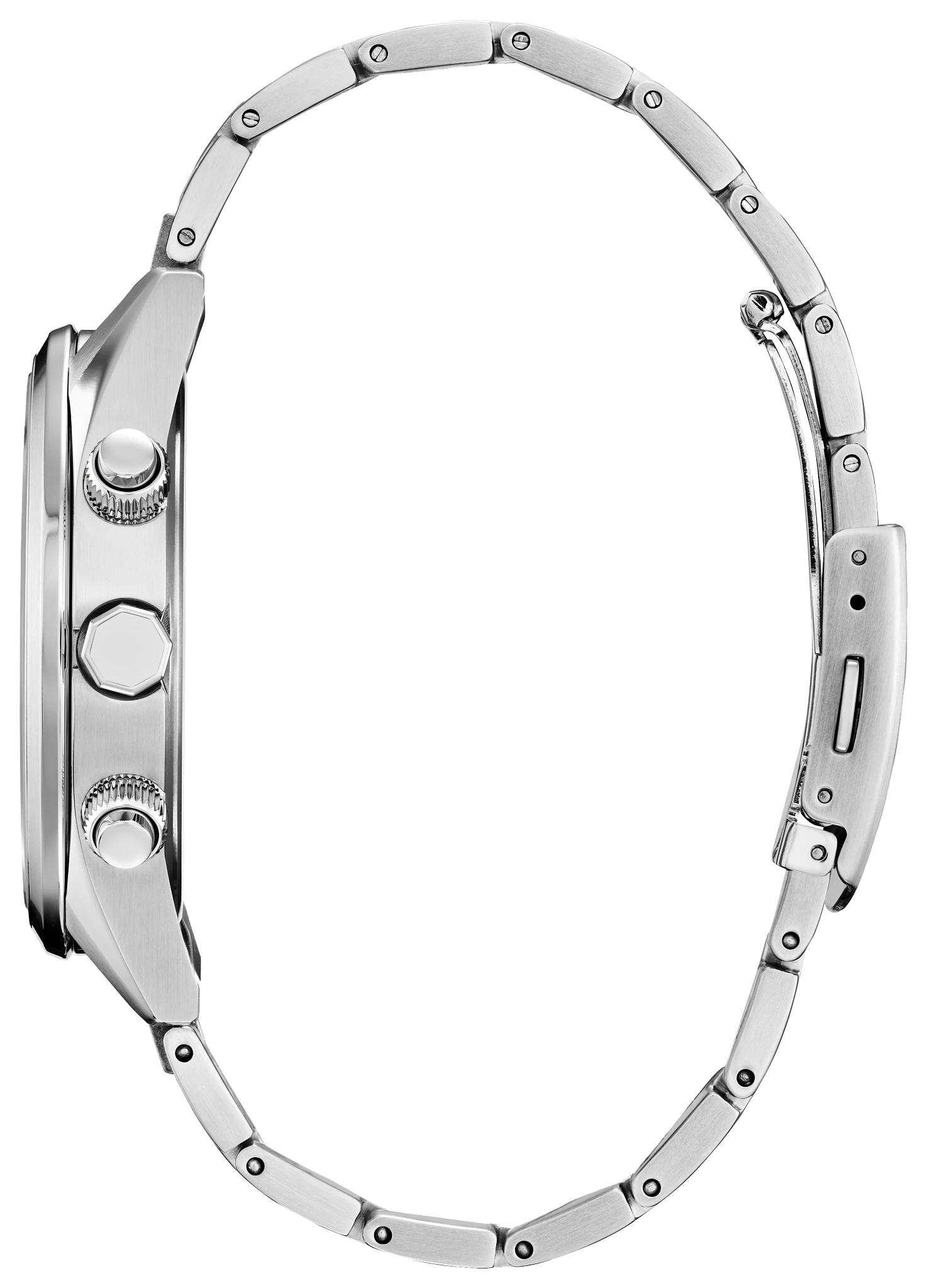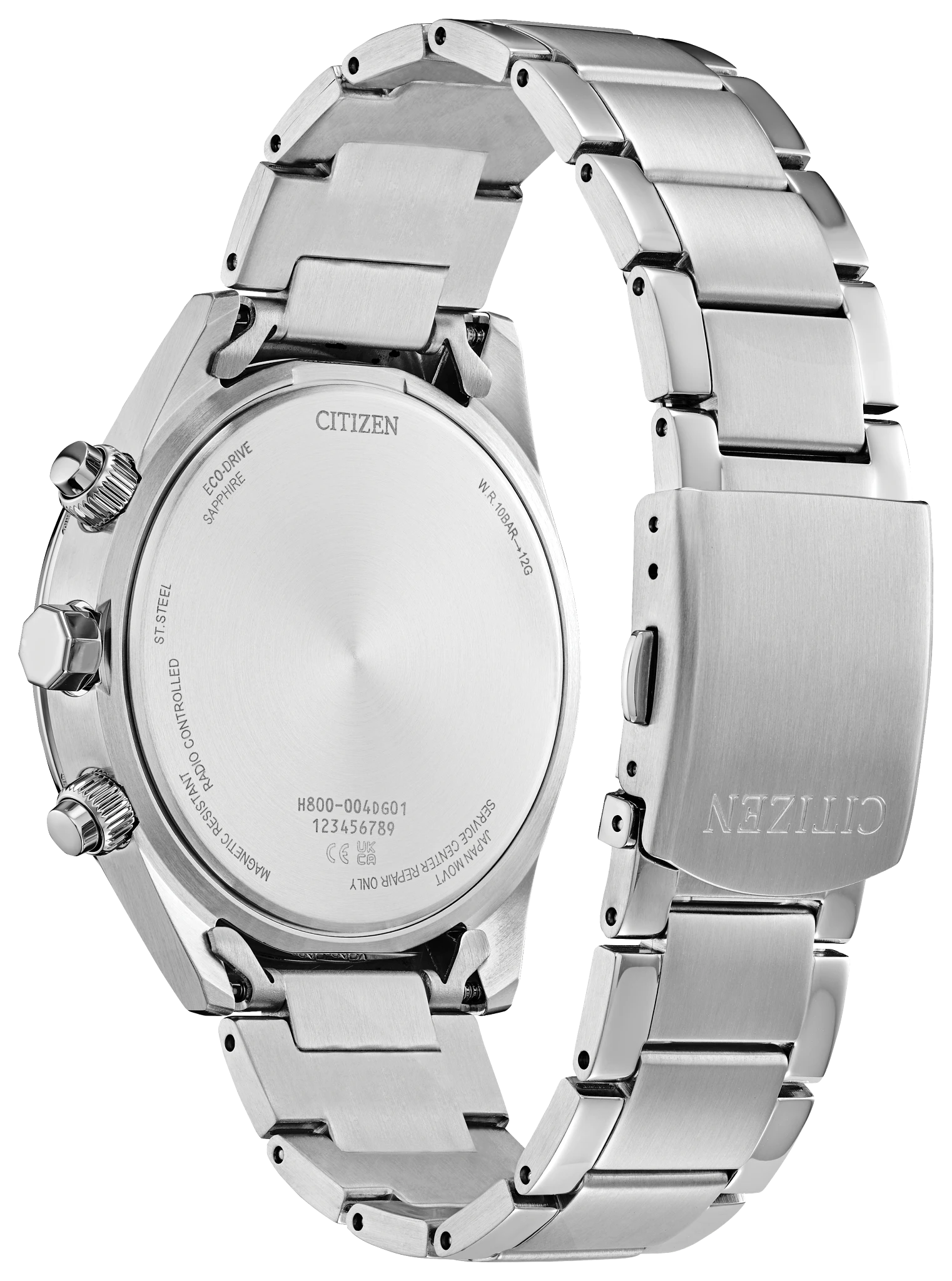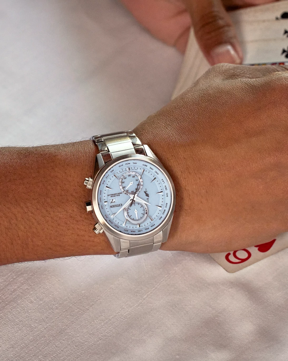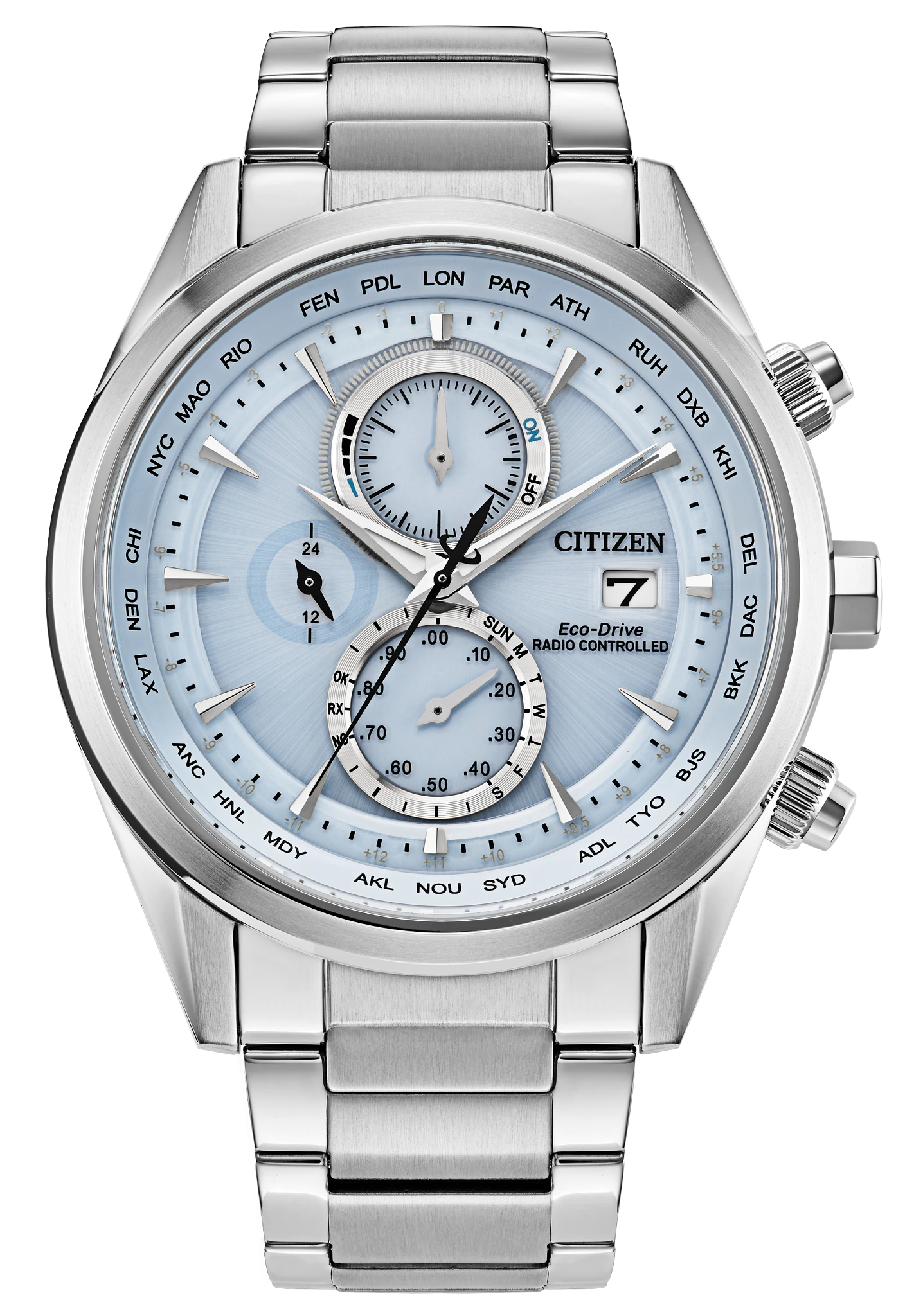 Innovative technology once again meets elevated chronograph styling in… Citizen’s latest: the new AT8260. A 43mm stainless steel case with contrasting brushed and polished finishing techniques solidifies the design, while a matching bracelet secures the watch to the wrist. A faceted crown and chronograph pushers add a stylish touch, balancing traditional details with smart, modern accents. On the sky blue dial, a vertical three-register chronograph is at work, with appliques of silver-tones adding dimensionality alongside the utility of a 3 o’clock date display. Other advanced features include world time in 26 time zones, a perpetual calendar with day and date indicators, 12/24-hour timekeeping, and a power reserve display. Featuring light-powered Eco-Drive Atomic Timekeeping functionality, the radio controlled timepiece self-adjusts to time or calendar when traveling overseas by receiving local time signals in four different regions. Water resistant up to 100 meters. Caliber H800.